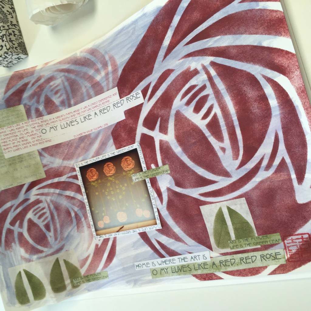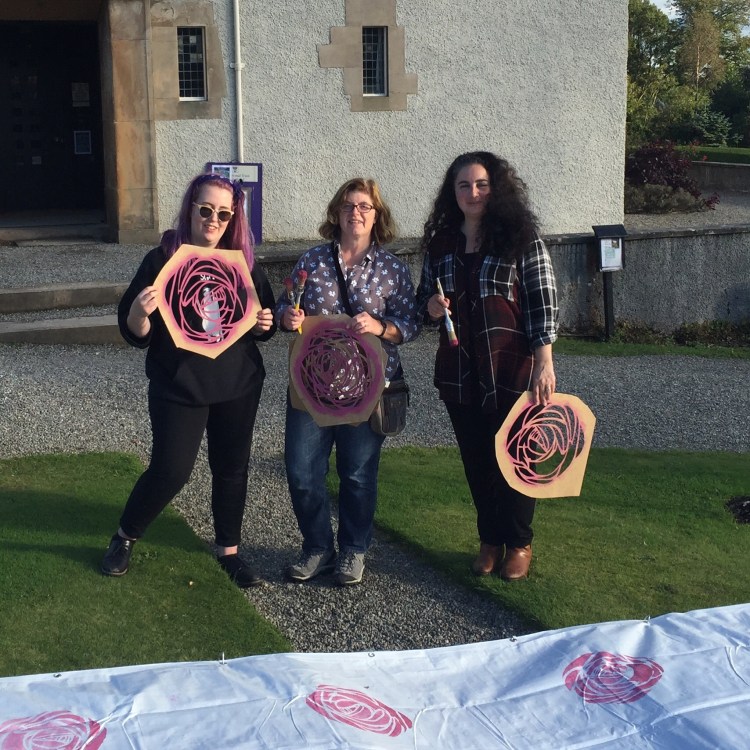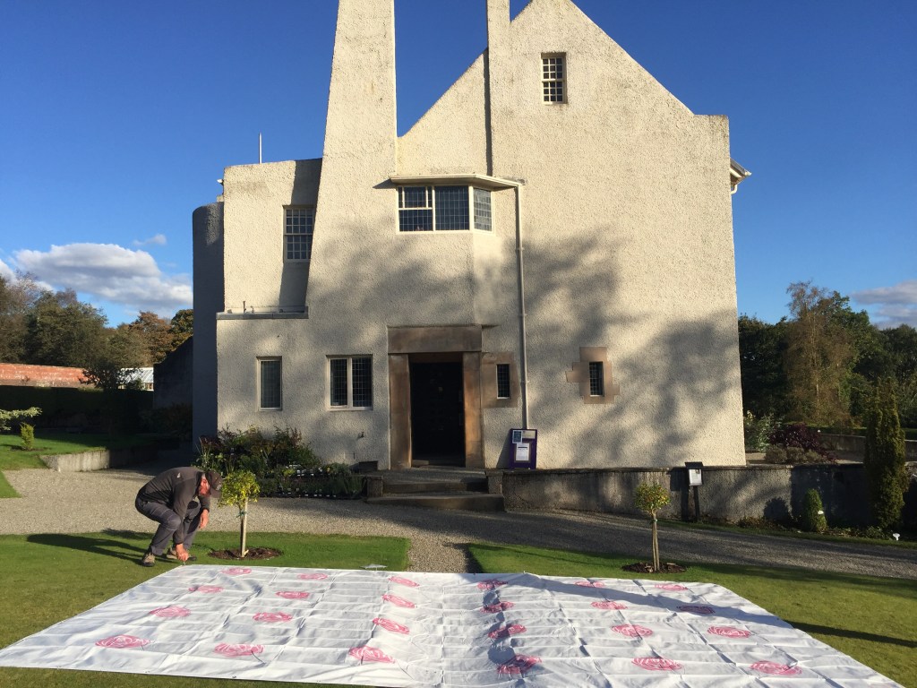 2017 The Big Banner project saw 13 “Hand stencilled Roses banners” by groups of participants in public locations before an exhibition of those at The Lighthouse design center in Glasgow during the Mackintosh Festival