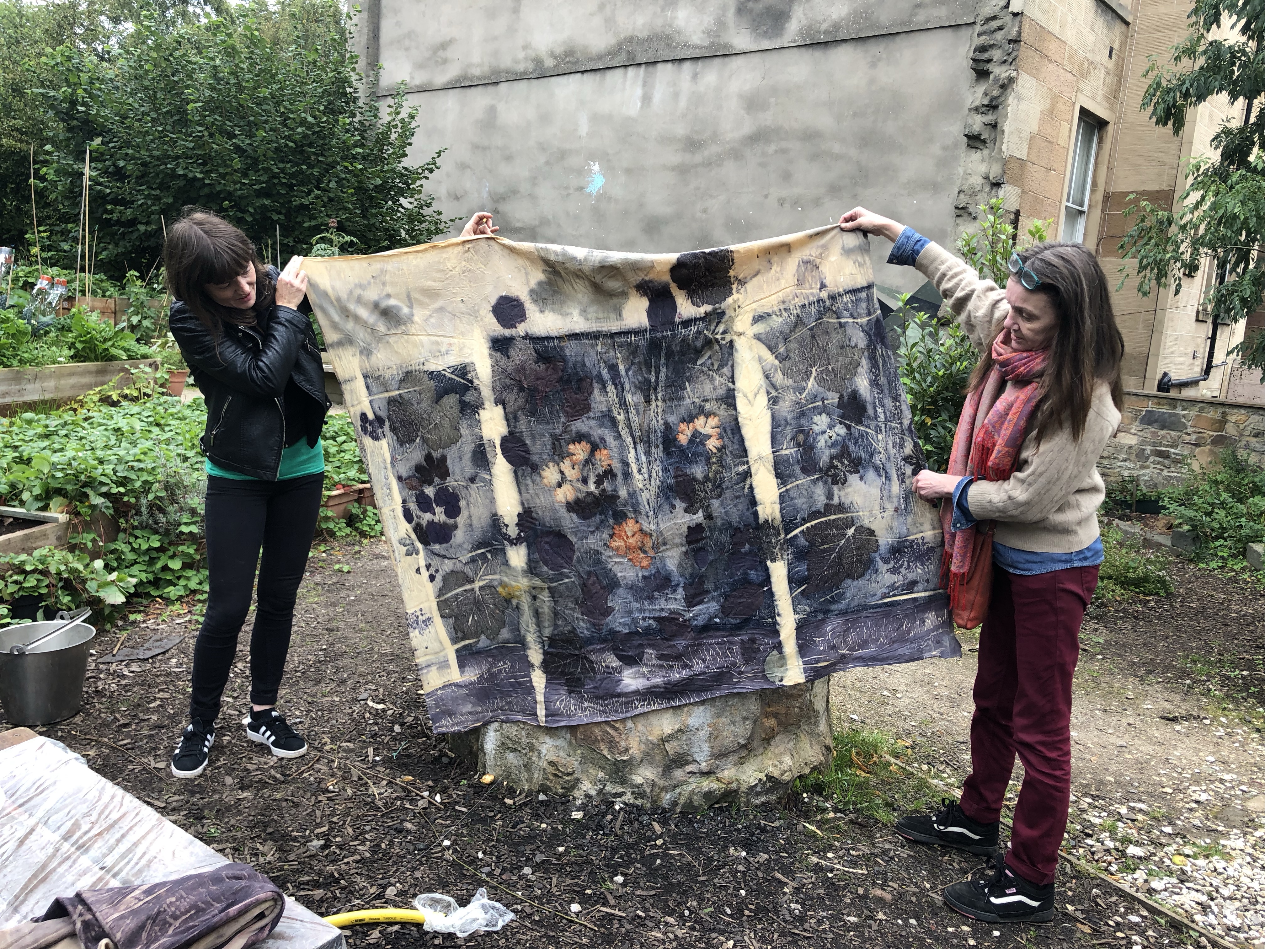 2019/2020 in Printing in Woodlands, she gathers the public an gardeners in the Woodlands Community garden to learn the art of Ecoprinting working outdoors. An exhibition of communal pieces takes place in the Glasgow Botanical garden in February 2020 with an open day of free crafts workshops.