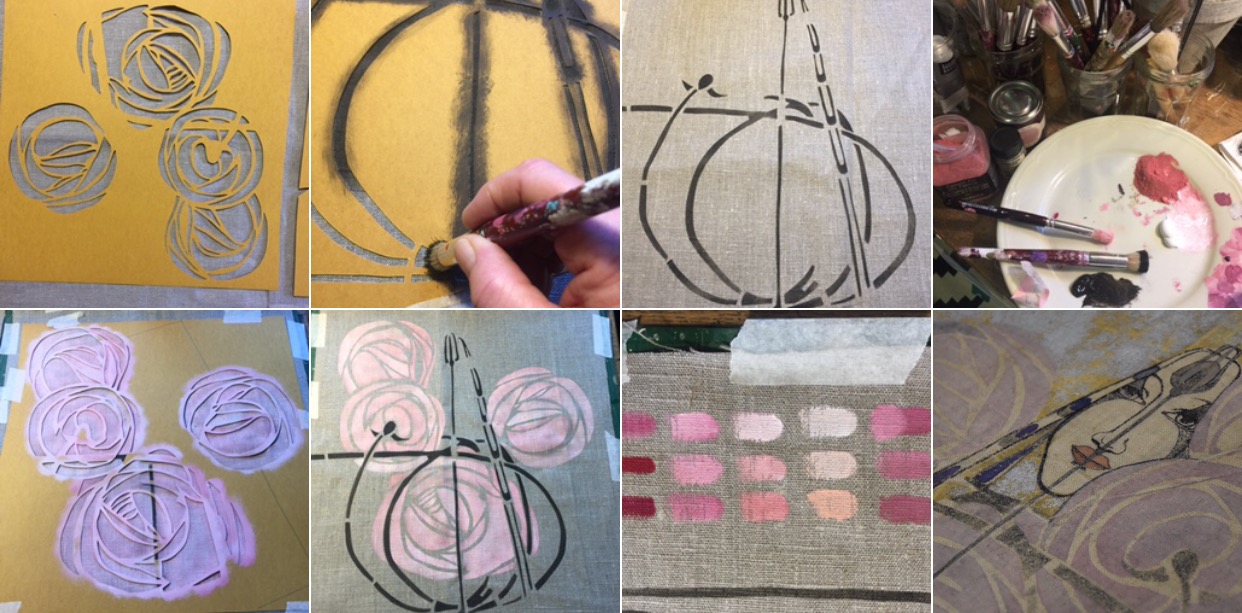 Her original training was in Decorative arts with Christie’s and the University of Glasgow. After graduating stencilling Mackintosh became her career. For 20 years she was involved in commissions with the Mackintosh community and was responsible for the recreation of The House for an Art Lover, the renovation of the Willow Tea rooms and some museum commissions.