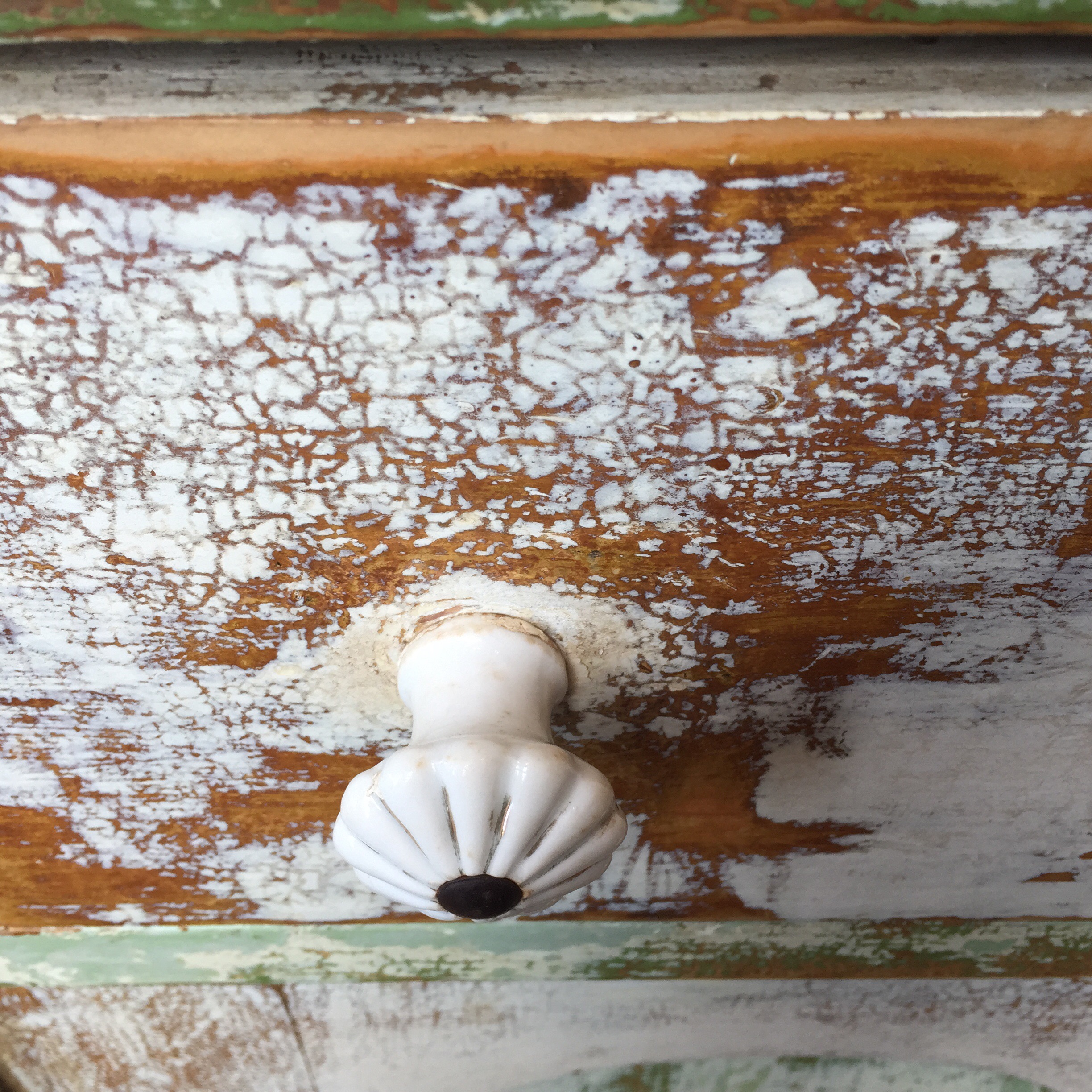 A pine chest of drawer with new “antique” handles and a mix of craquelure and distressed finish. It has been waxed with bee’s wax for lovely smooth finish.This is a distressed finish, three colours, all water based emulsions applied roughly, then distressed with sanding paper in an irregular manner showing the colour below and hand waxed for long term enjoyement.This is one shade of old white on top of old pine, distressed and waxed by hand.This painted chest was painted with plain cream oiled based paint before being crackled with Gum Arabic and antiqued with pigments in turpentine/linseed oil. Varnished to protect the finish.Detail of the painted piece showing the drawer, this shows the craquelure as well as the rough areas.Family initials stencilled on top of the finish, this can be an efficient way to offer a more interesting final touch.