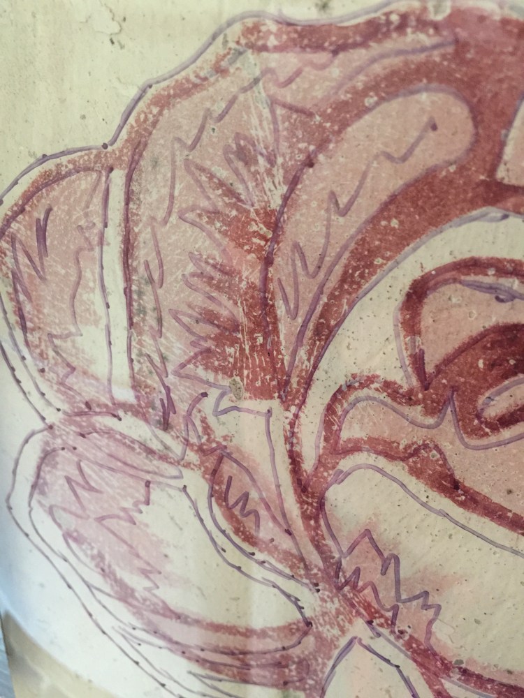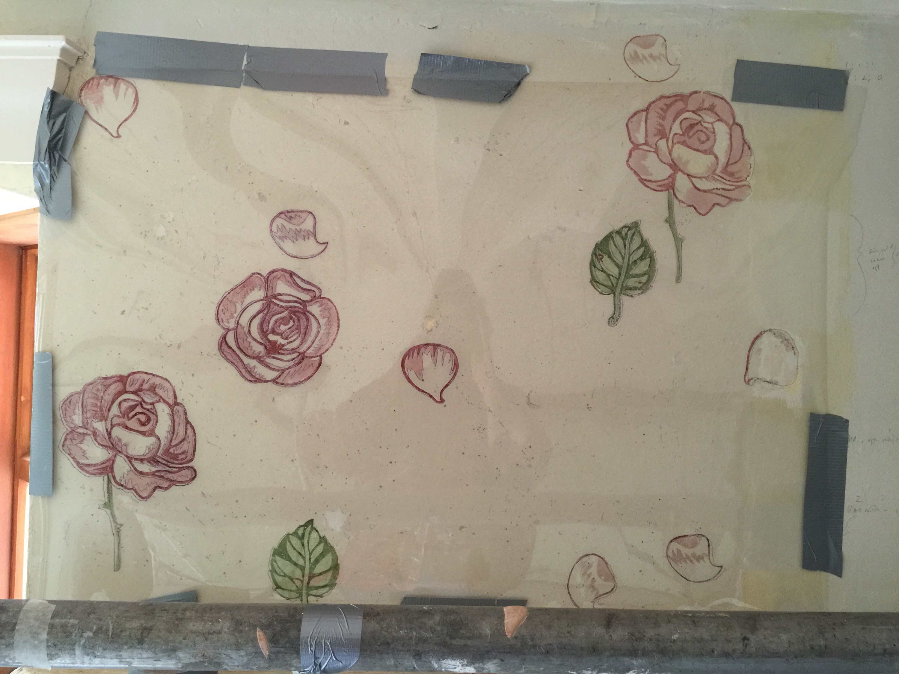 While being refurbished some design schemes were found on the walls in some of the rooms. some in very good state just needing some touching up and some almost destroyed in great need to be recreated. The photographs here come from the original drawing room which featured a scheme of flowered designs.