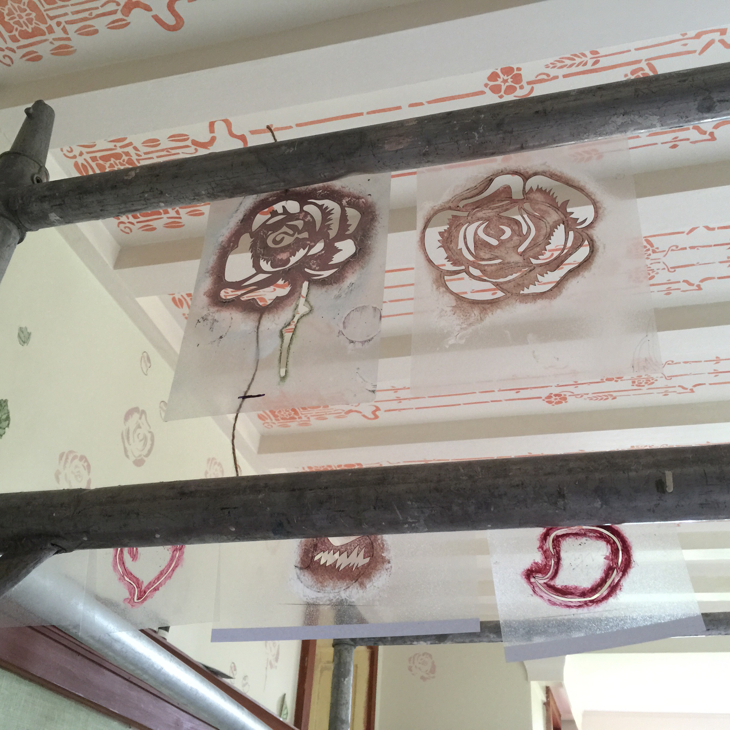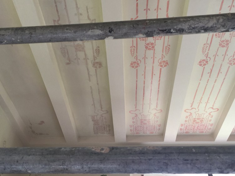 My role is to re-create some of the stencilled schemes. Those are the first who vanish in any historic building. The fashion changes quickly and well… what gave the owner a lot of pleasure yesterday just gets painted over as soon as it runs out of fashion and that is usually quite fast. We think that because those buildings were built over 100 years ago the owners protected their interiors but in fact just as today fashion in interior design were very short lived and any frieze, tile, wall painting did not live for very long. My job is to research the signs and use the elements made available by the restorers to re-create yesterday’s frieze with today’s findings.