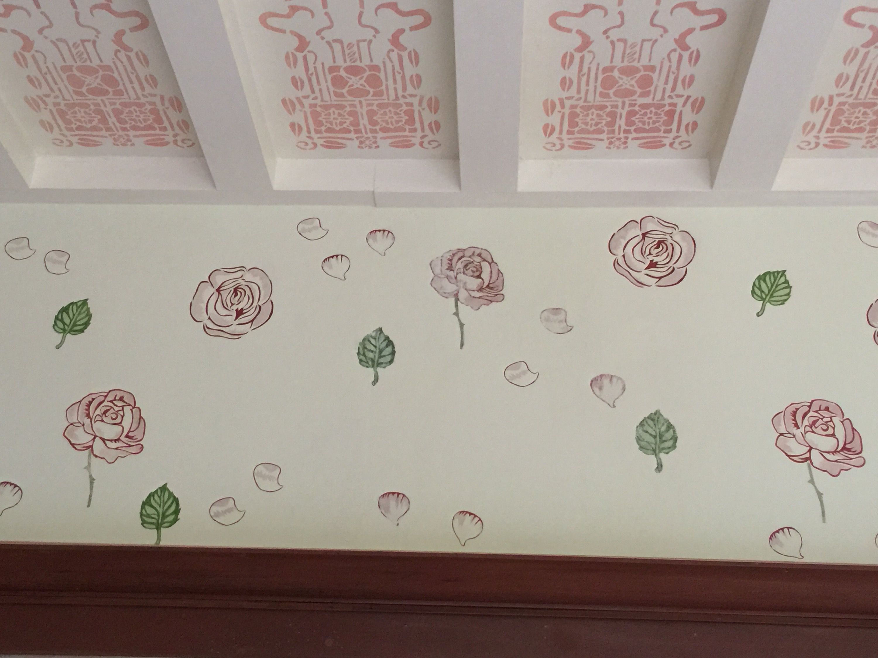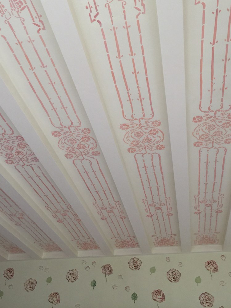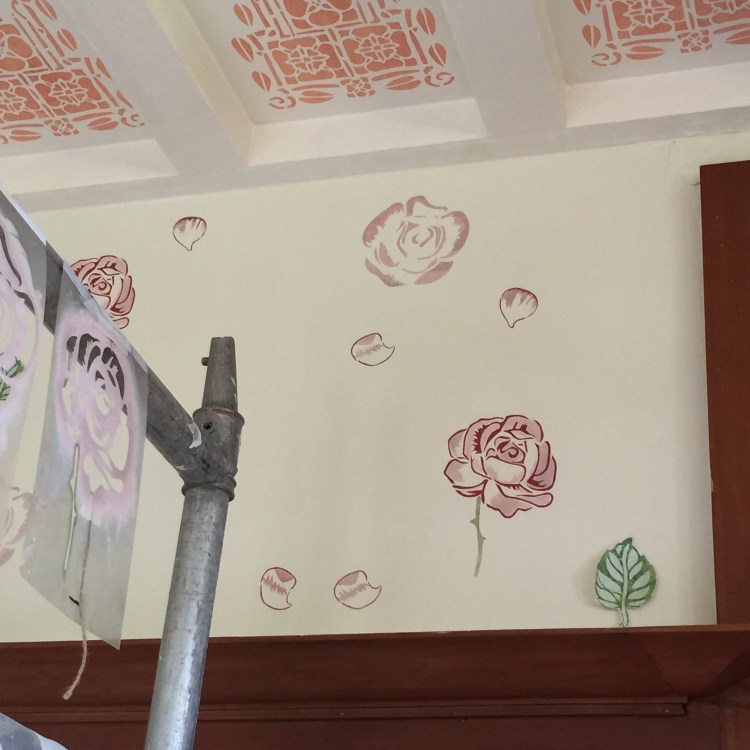Its not just artistic and indeed the process of applying the paint on the wall is a very small part of the job at hand. When recreating the stencilled frieze on the ceiling at Ault Wharrie my hardest task was to get the stencil plate to stick on the ceiling… gravity being there to make my last very difficult. But it is so rewarding to see the job complete knowing the client will be looking at this frieze for the years to come.