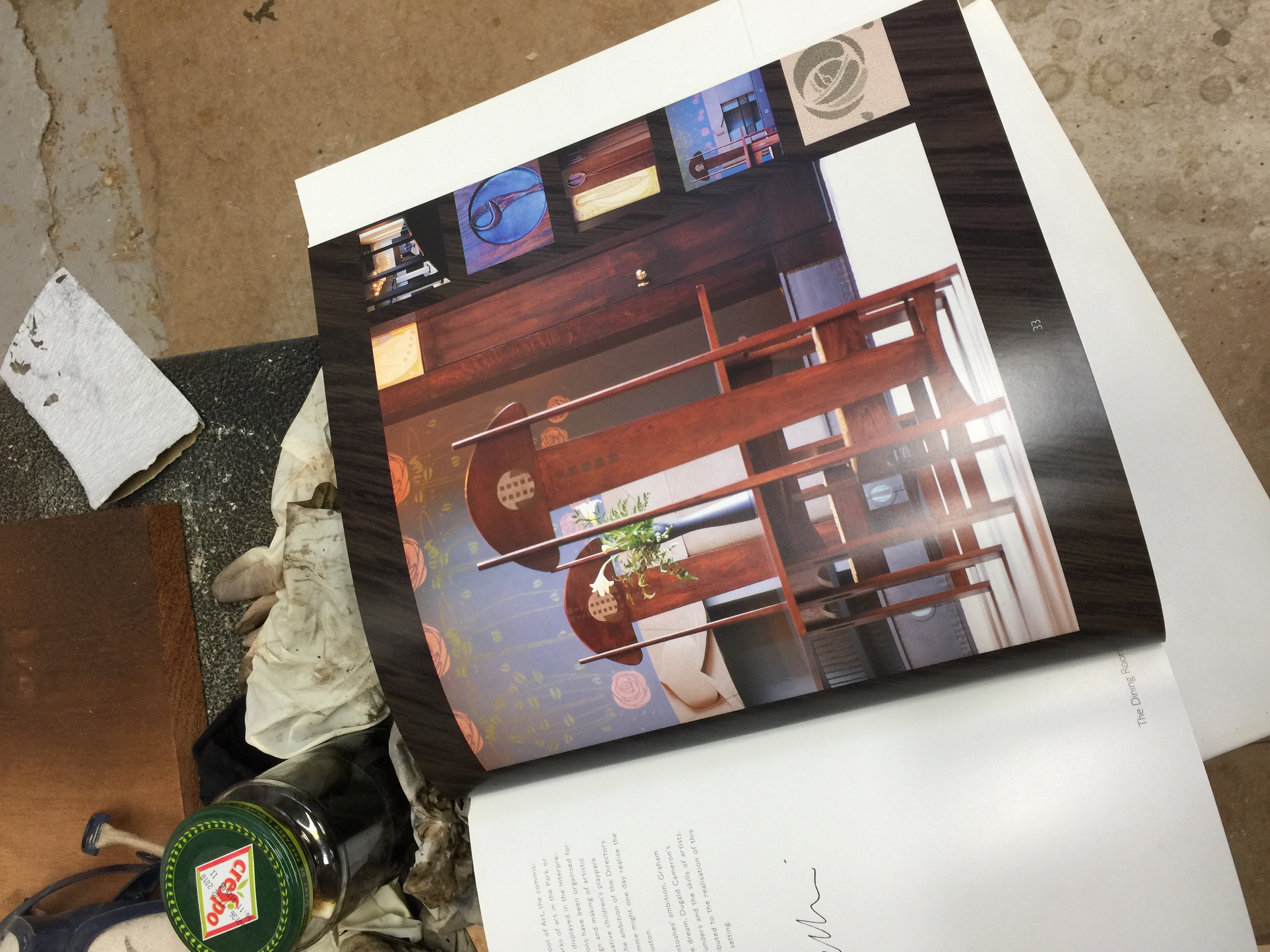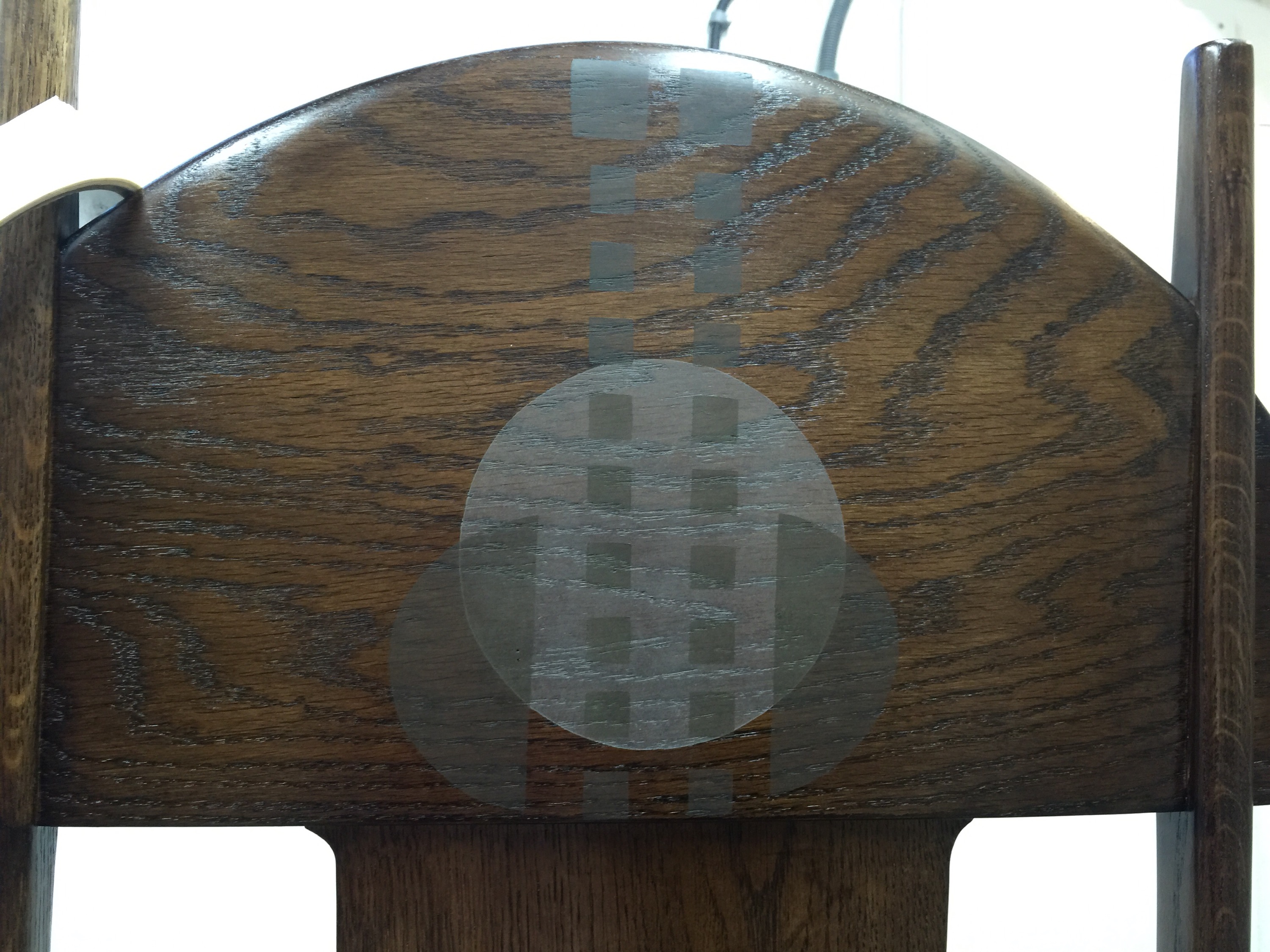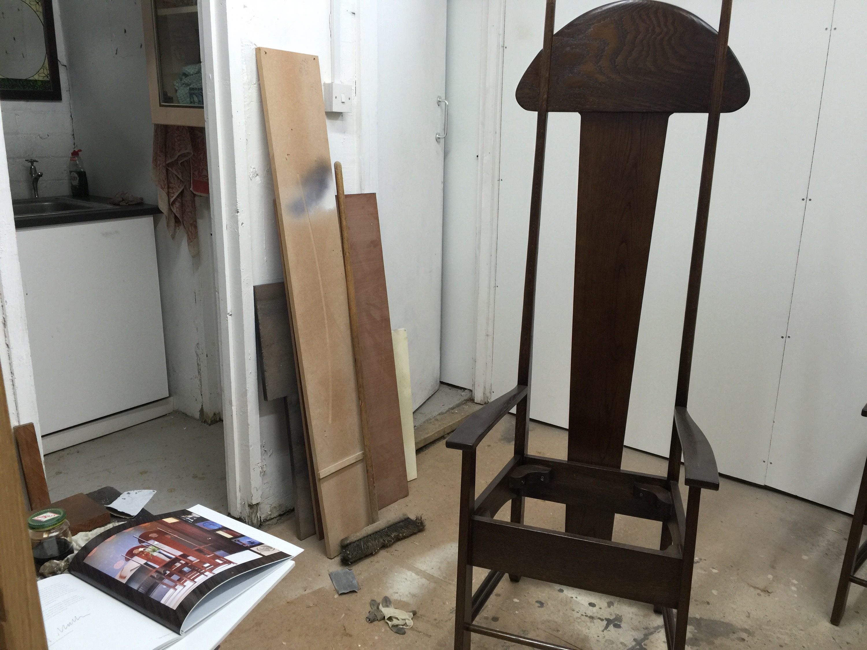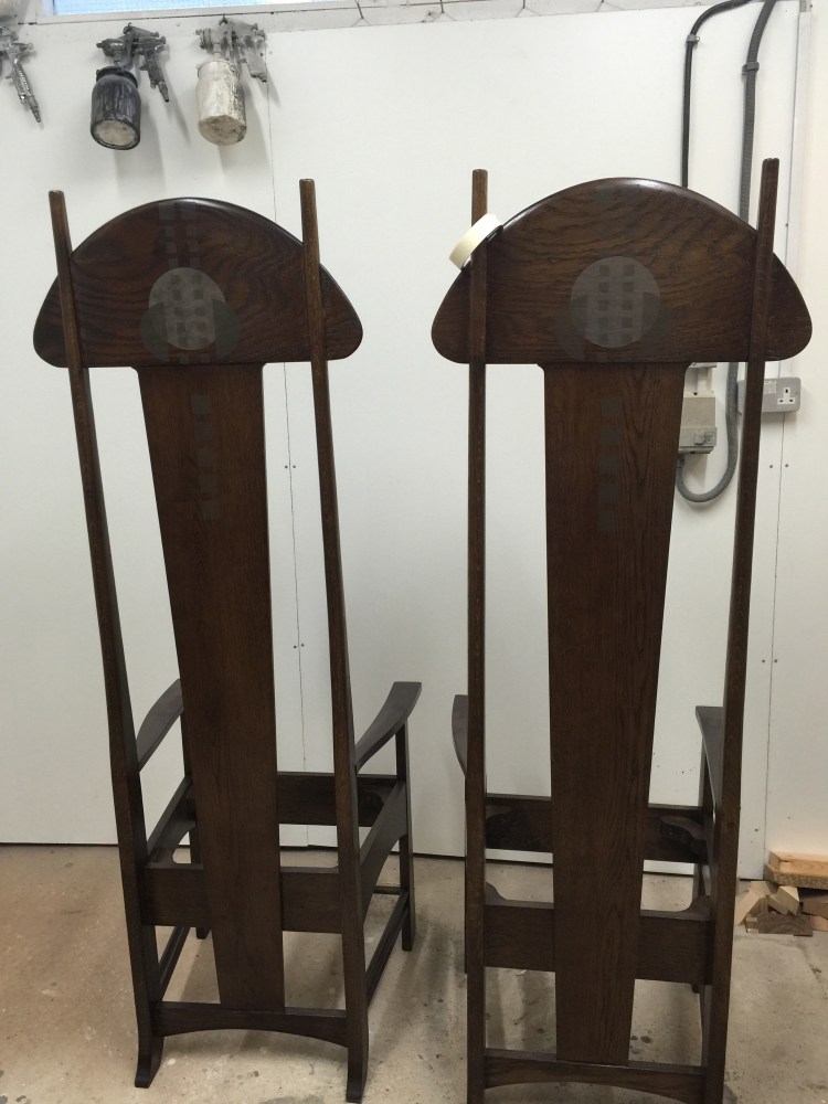 One of the best part of the project is the makers I met while working on this commission with whom I still work today. Like Bruce Hamilton the furniture maker. Together we made the chairs for this dining room. Bruce was commissioned to make the dining room furniture. He is a genuine furniture maker with a true understanding of wood and joints, his workshop is full of magic and he has been working on Mackintosh chairs for many years. A great deal of expertise. He made the chairs… I stencilled them… great team work ! and we still work together today. We have this understated connexion which comes out of sharing a very special task. Today he makes clocks and I stencil them ! But this is still the Mackintosh connexion.