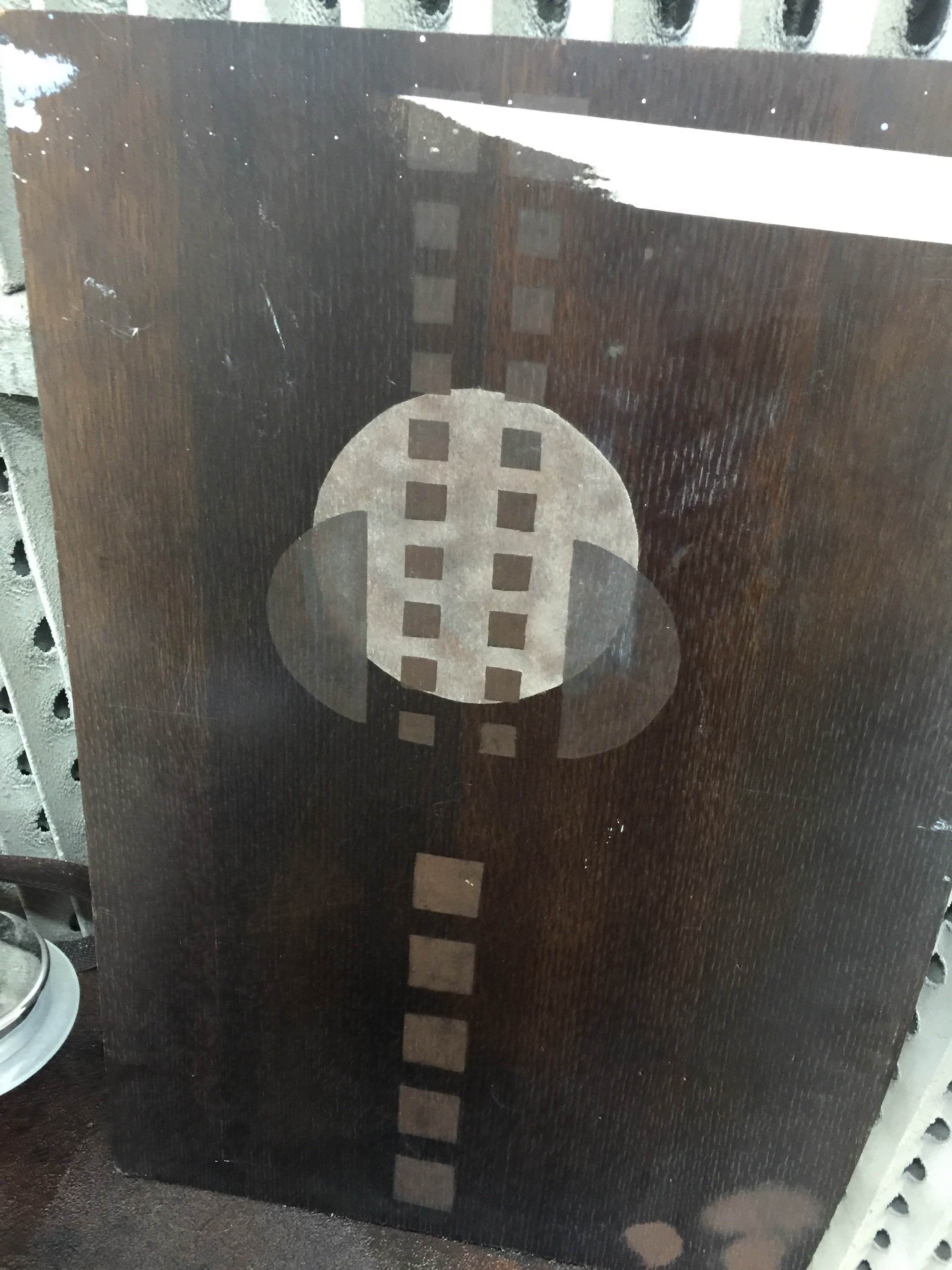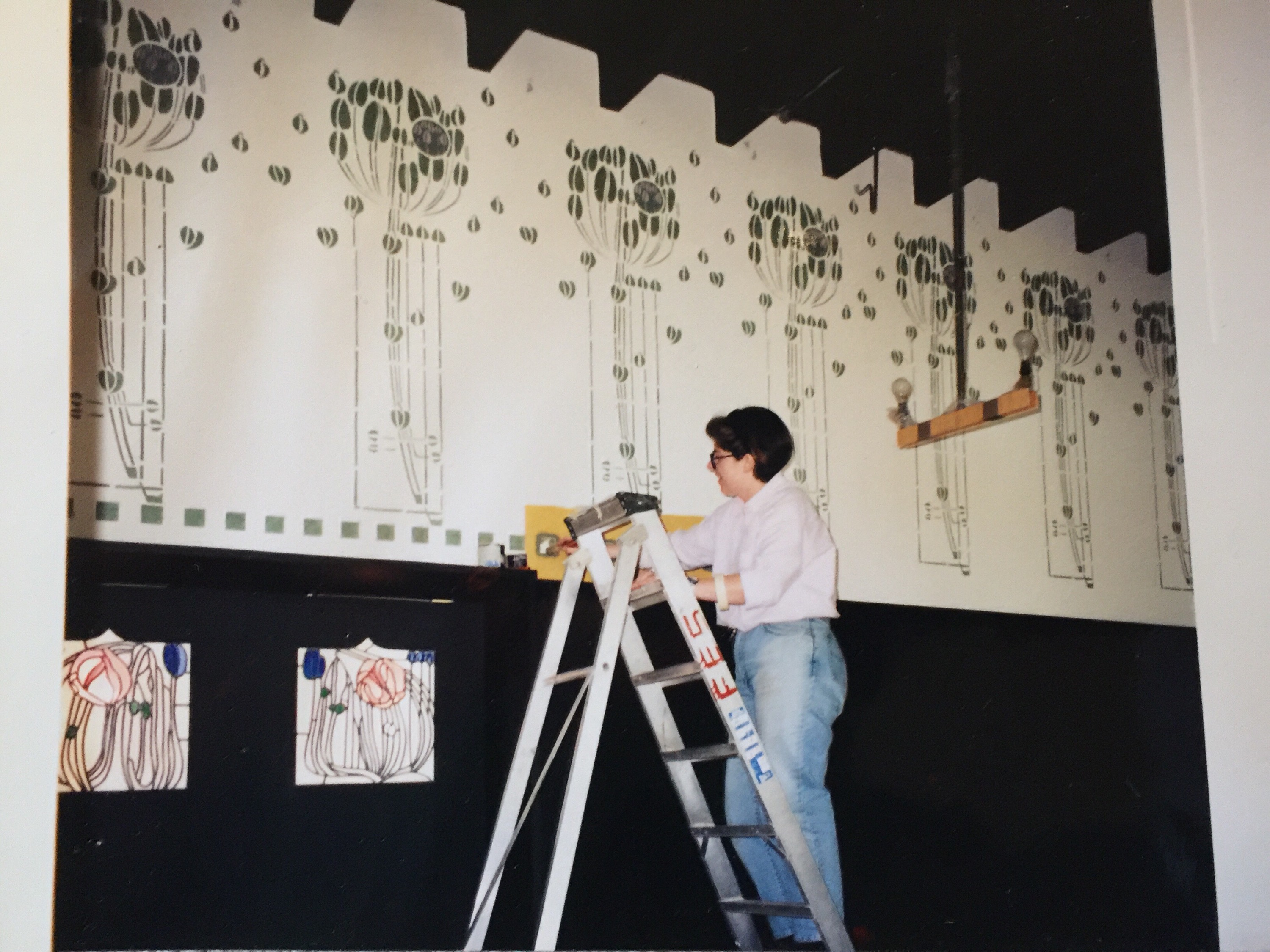 I have though one regret about this commission and I might one of those days raise the issue again and it is about the painted over frieze which probably no one remembers apart from a handful of people !!! The large panelled hall had a very clearly stencilled frieze in the shape of a geometrical tree in some drab green and pink. I came up with a design, it was approved and I spent 2 months up a scaffolding stencilling it. As tall as me a very impressive motif. It was truly stunning but… a couple of weeks before the opening… The Glasgow School of Arts on the basis that none of the other built Mackintosh properties had stencils in their halls decided to paint over. The rational was that Mackintosh would have probably changed his mind and not gone ahead with the design. I am not so sure about this. I think the great man had the right to have a variation on his usual theme. Below is the photo of the stencilled scheme taken before it vanished. I have the hope one day it will be reinstated.