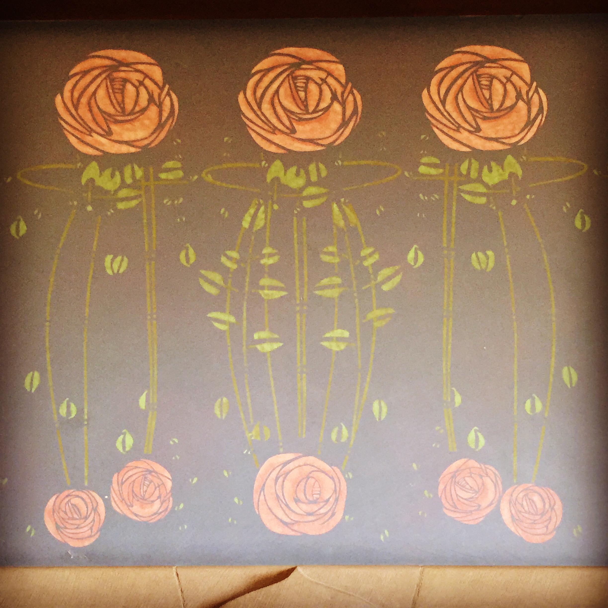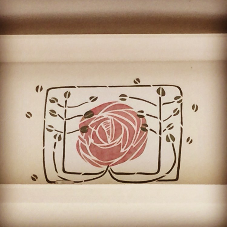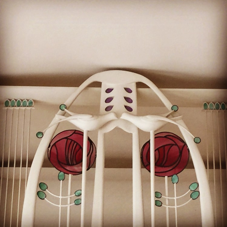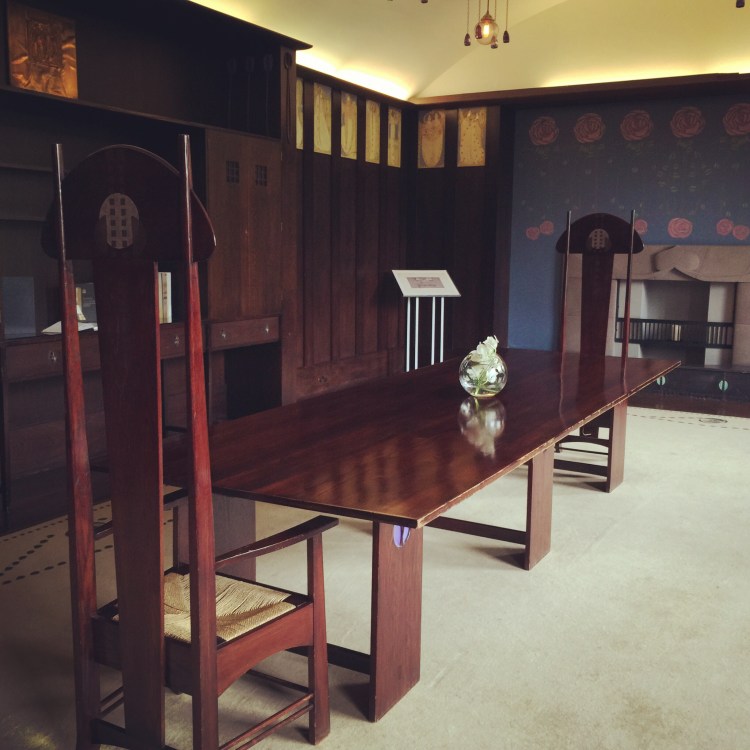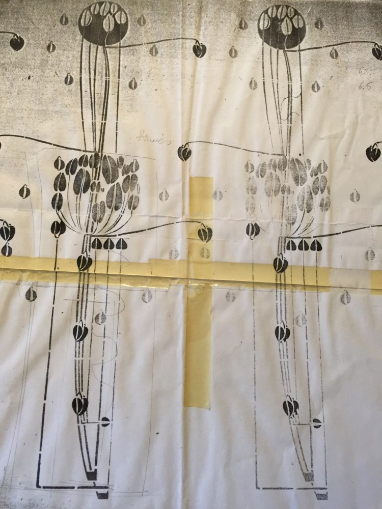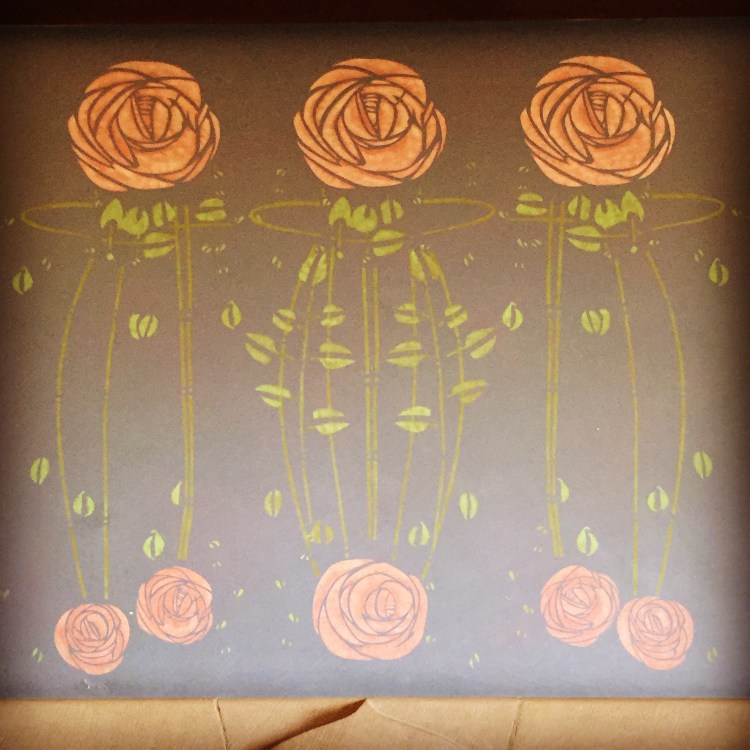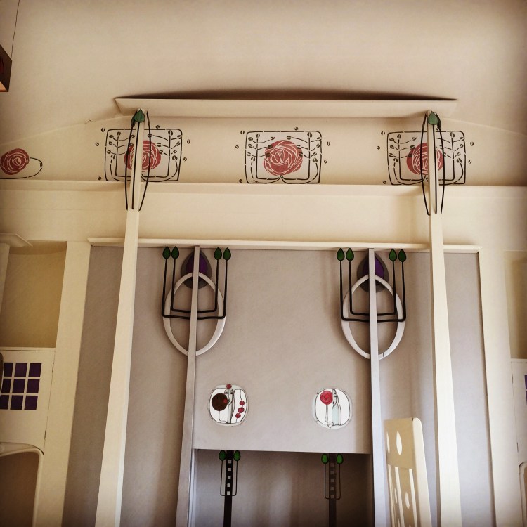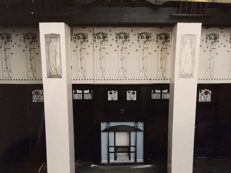 For the design of this fire place frieze, much research took place and I looked at many rose friezes, but one caught my eye and it was that of The Hill House master bedroom. Very similar in shape to that of Mackintosh’s drawing for The House for an Art Lover. It was decided the dining room would be very much inspired by the former. The final plan was approved by The School of Arts and up it went. I can not tell you how scary it was to allow anyone to look at it at first. Would anyone approve of this work or would they not think it was up to Mackintosh’s dream?
