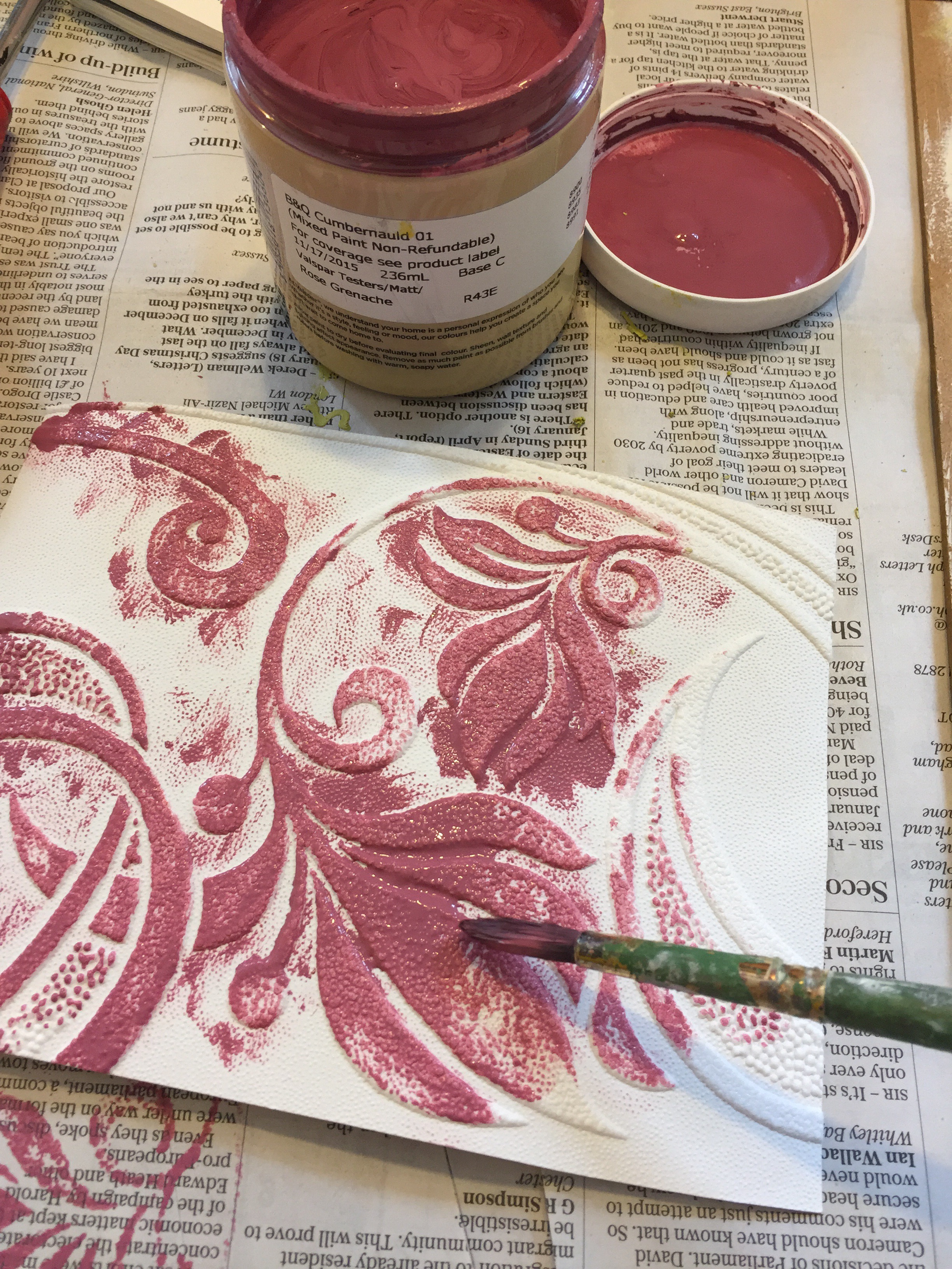So a while ago we printed with a bit of embossed paper ! Just a snippet ! A sample I had once collected at a local B&Q … A free sample ! A piece of recycling and the result was AMAZING ! A delicate frieze of Art Nouveau style appeared on my board and I heard the gasp when lifting up my improvised stamp. With a bit of recycling I hope I have opened the mind of my 8 ladies to the potential of recycling for Upcycling but for sure they were on a complete high when they left !