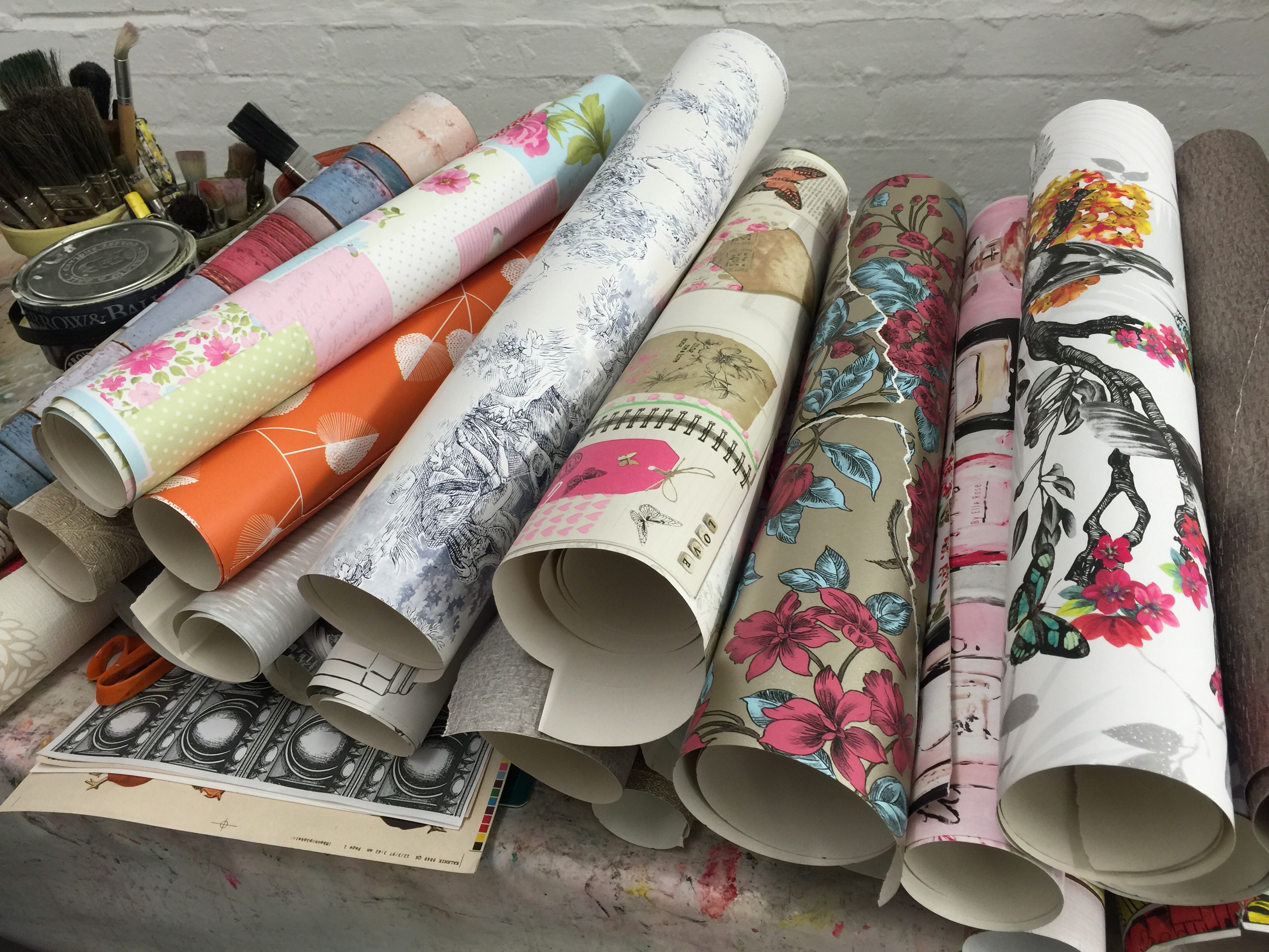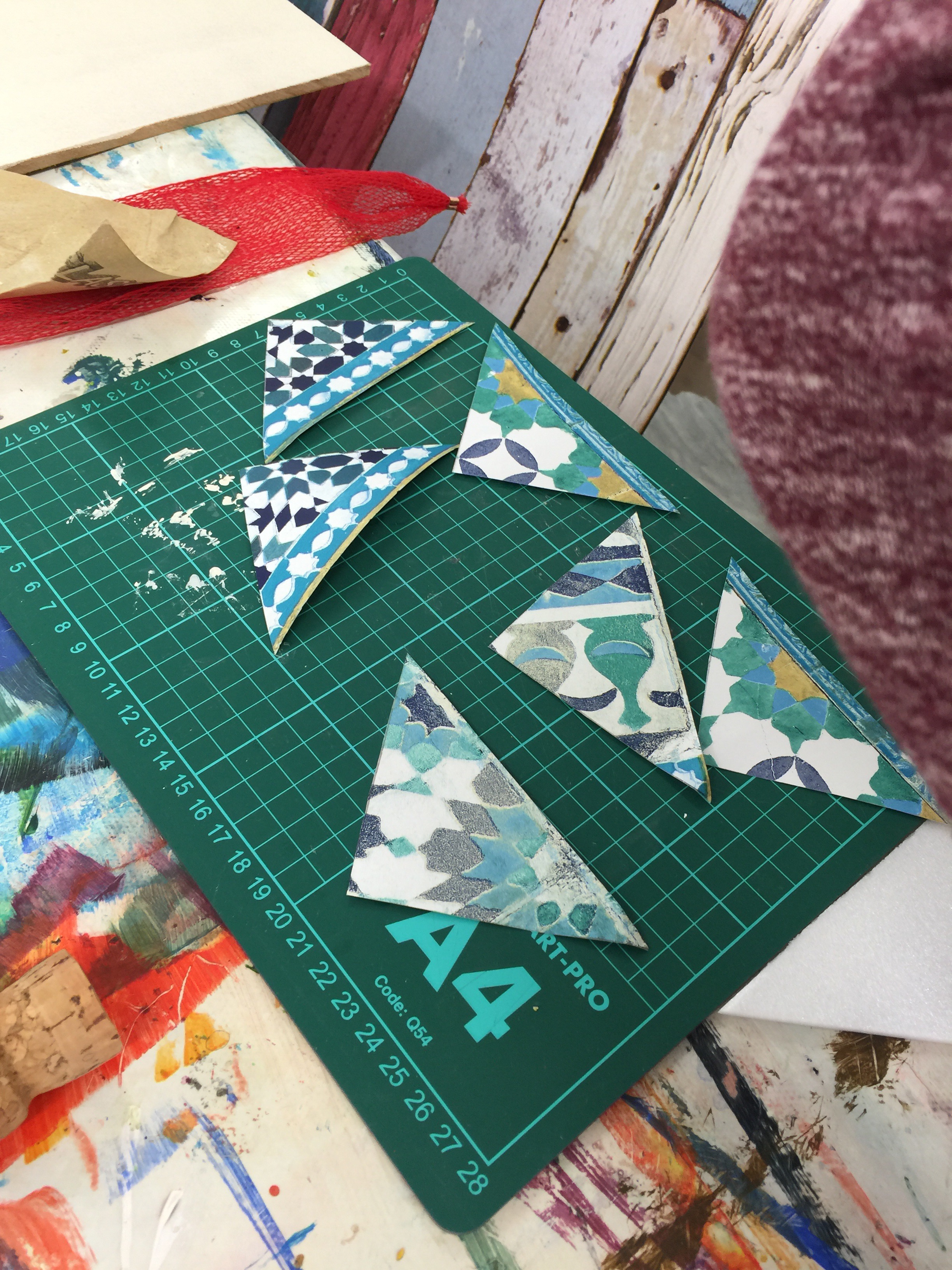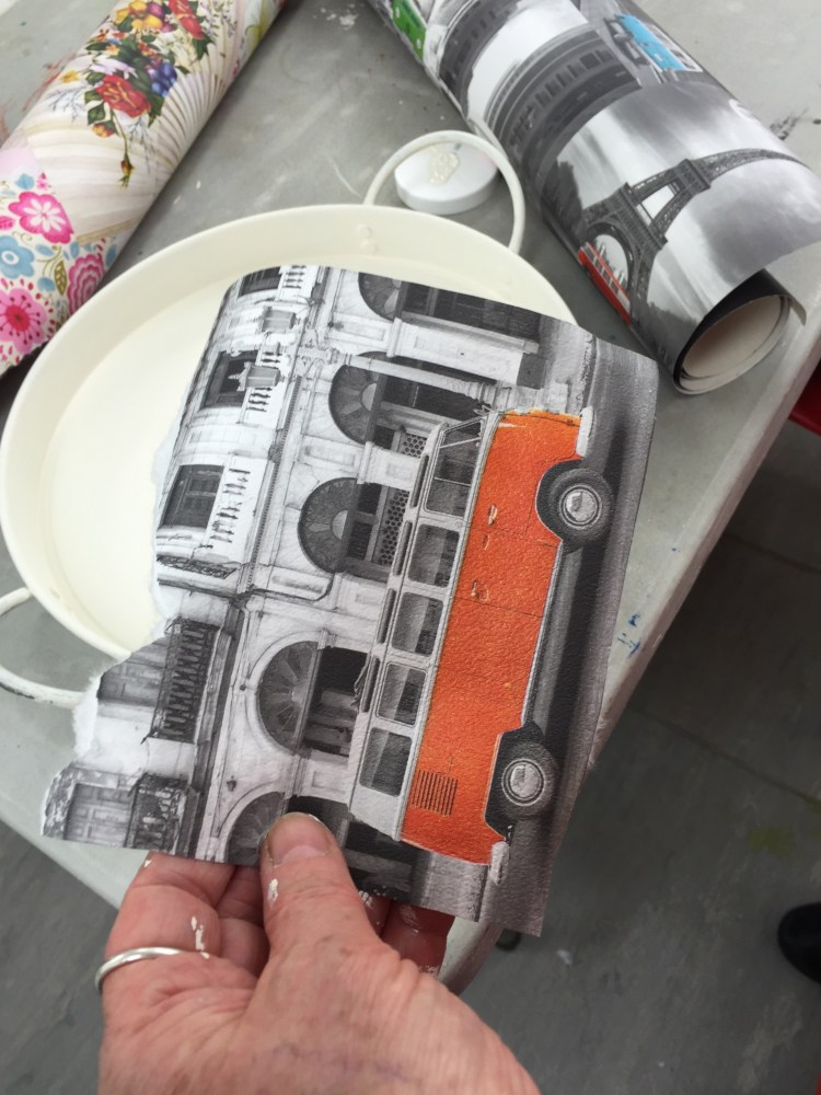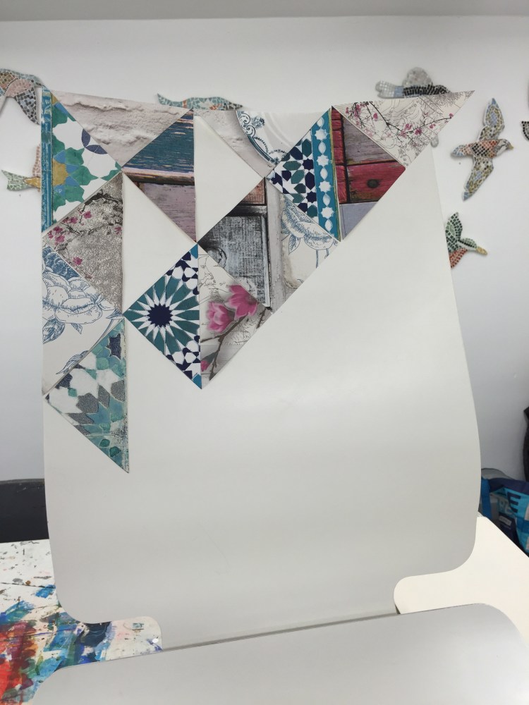 This week to my surprise several of my ladies had raided their own DIY stores for lovely free samples of wall papers !!! And my pile of them is now gigantic … Beautiful delicate flowers !!! Moroccan styles mosaics !!! Fun camping vans all in great colours !!! And through the two hours of our class our prepared pieces of furniture were decorated with paper cuts in bright colours. A white discarded chair got a triangle treatment while a bright turquoise side cabinet is getting garlands of Chinese looking flowers all this creativity for next to no pennies 🙂 … but so much fun.