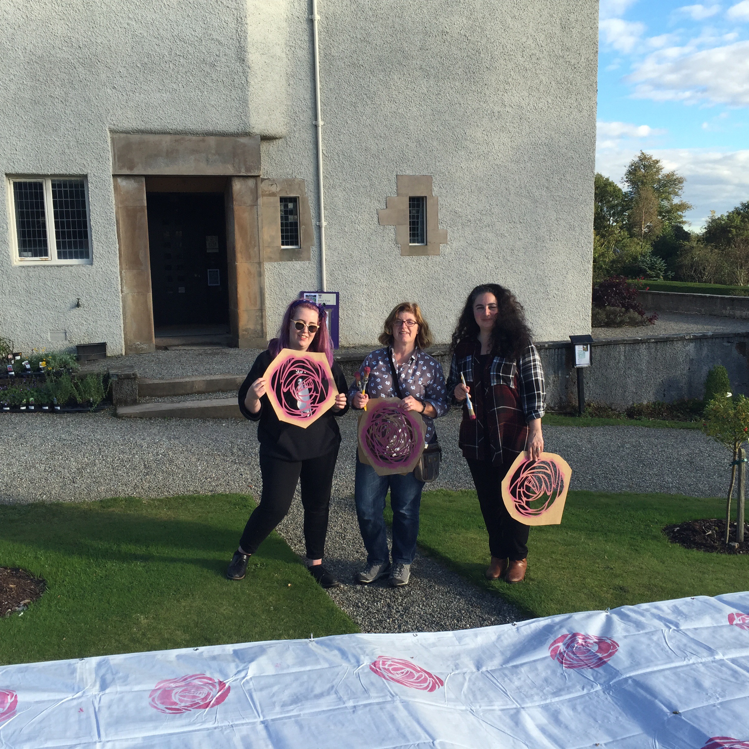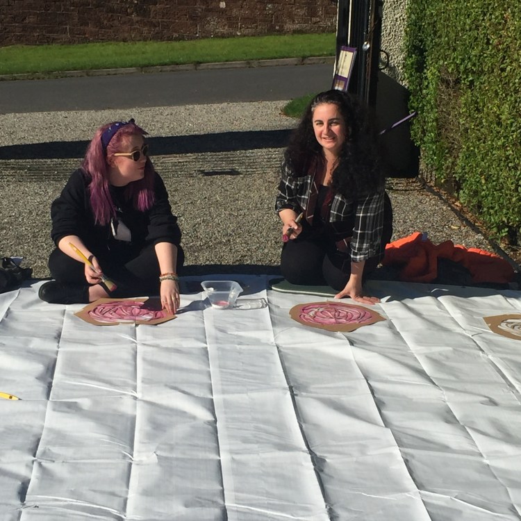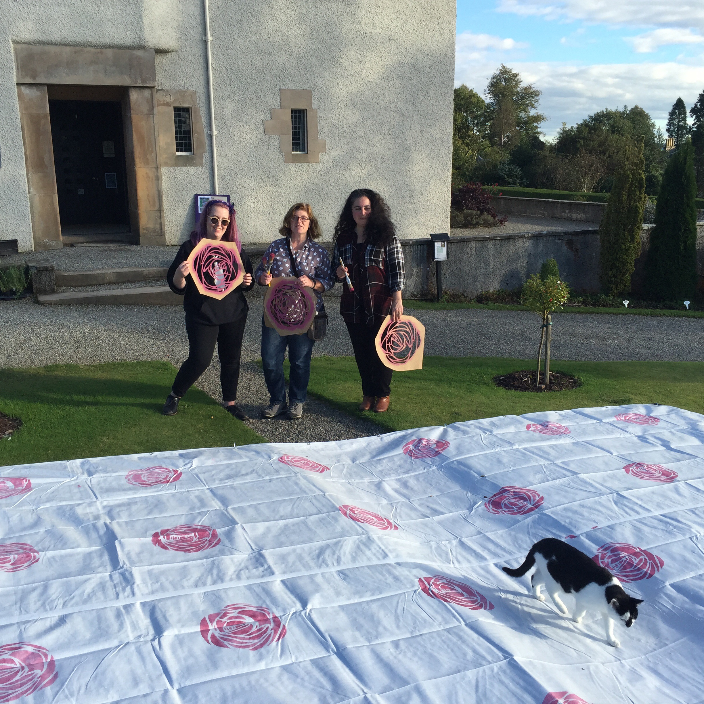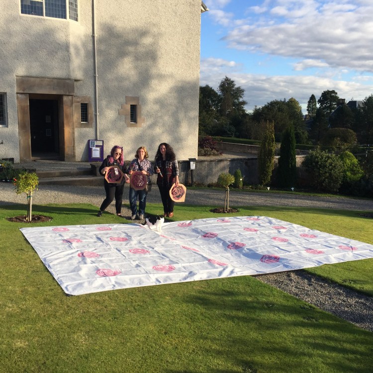 Volunteers are a great thing, I was once told by Creative Scotland that one should not expect to “exploit” people with the mere promise of an entry on one’s CV. I am not sure he understood the process… When looking at the interaction I have with my volunteers on this project I think he might have failed to understand the whole “exchange” concept of volunteering. In this project I get 6 very keen “arty” young girls who want to involve themselves in an art project without having to drive it. They are gifted, enthusiastic, full of energy and ready to engage for the day. They have real skills they are prepared to share but they also want to learn in the process and meet other likeminded folks. And that I can offer them… in return they make sure I don’t turn into a nervous reck that all the visitors feel important and looked after. They tried their hand at stencilling, they even stencilled a few roses themselves. They drank tea, stood in the beautiful sunny garden for the day and met a good number of great visitors and gave me advice. We exchanged, we were this short lived team. It was a beautiful exchange. They were so joyful, they made a huge difference to the success of the project.