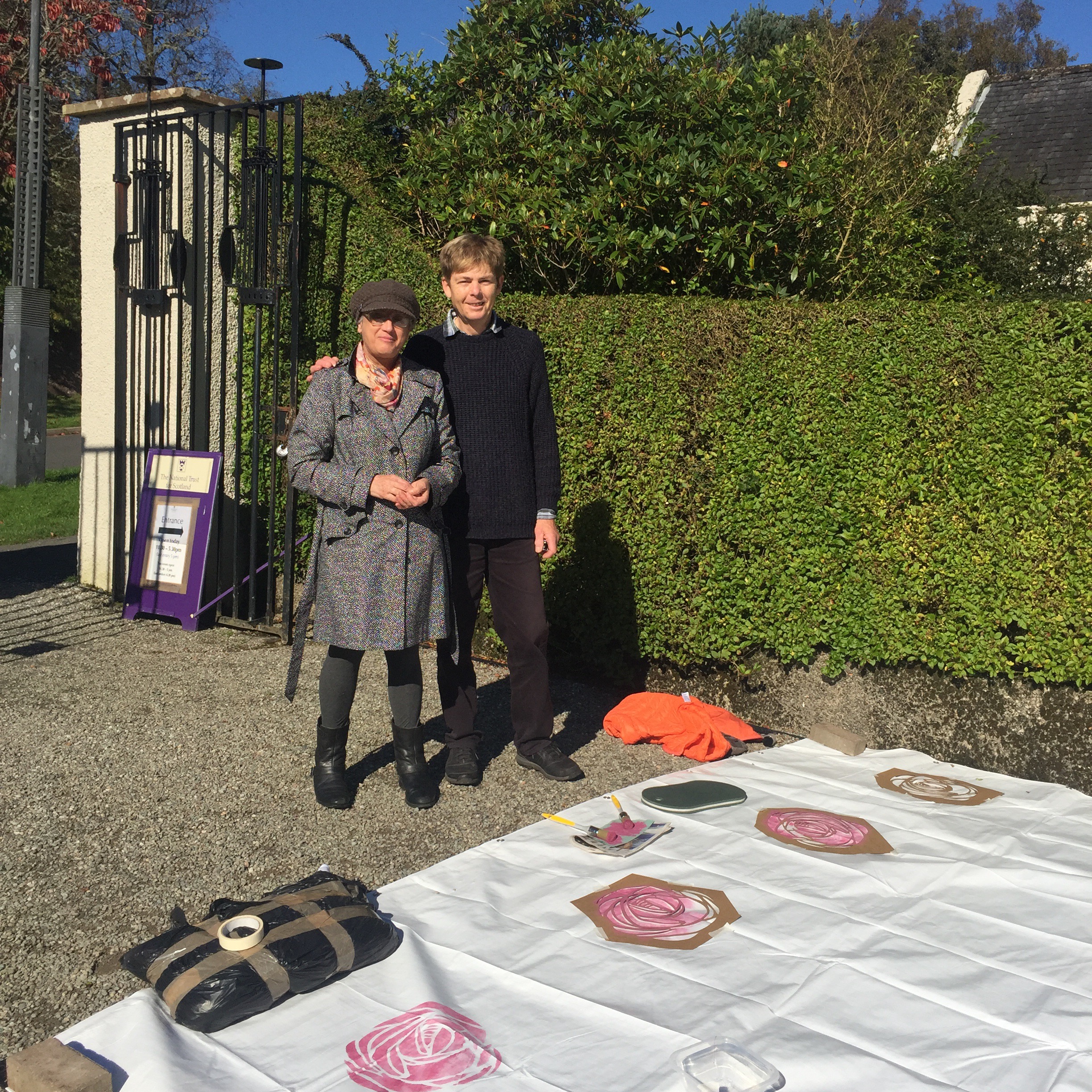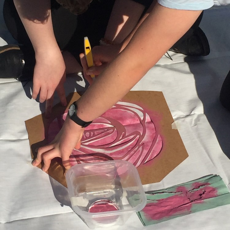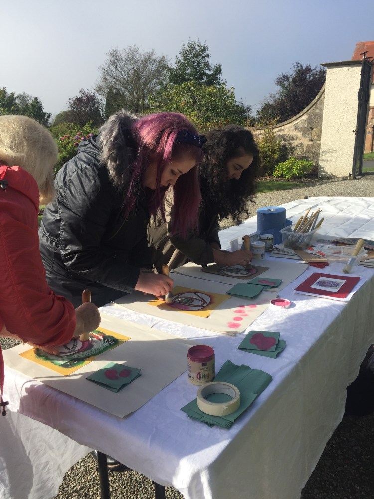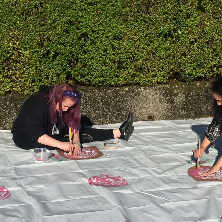 Volunteers are a great thing, I was once told by Creative Scotland that one should not expect to “exploit” people with the mere promise of an entry on one’s CV. I am not sure he understood the process… When looking at the interaction I have with my volunteers on this project I think he might have failed to understand the whole “exchange” concept of volunteering. In this project I get 6 very keen “arty” young girls who want to involve themselves in an art project without having to drive it. They are gifted, enthusiastic, full of energy and ready to engage for the day. They have real skills they are prepared to share but they also want to learn in the process and meet other likeminded folks. And that I can offer them… in return they make sure I don’t turn into a nervous reck that all the visitors feel important and looked after. They tried their hand at stencilling, they even stencilled a few roses themselves. They drank tea, stood in the beautiful sunny garden for the day and met a good number of great visitors and gave me advice. We exchanged, we were this short lived team. It was a beautiful exchange. They were so joyful, they made a huge difference to the success of the project.