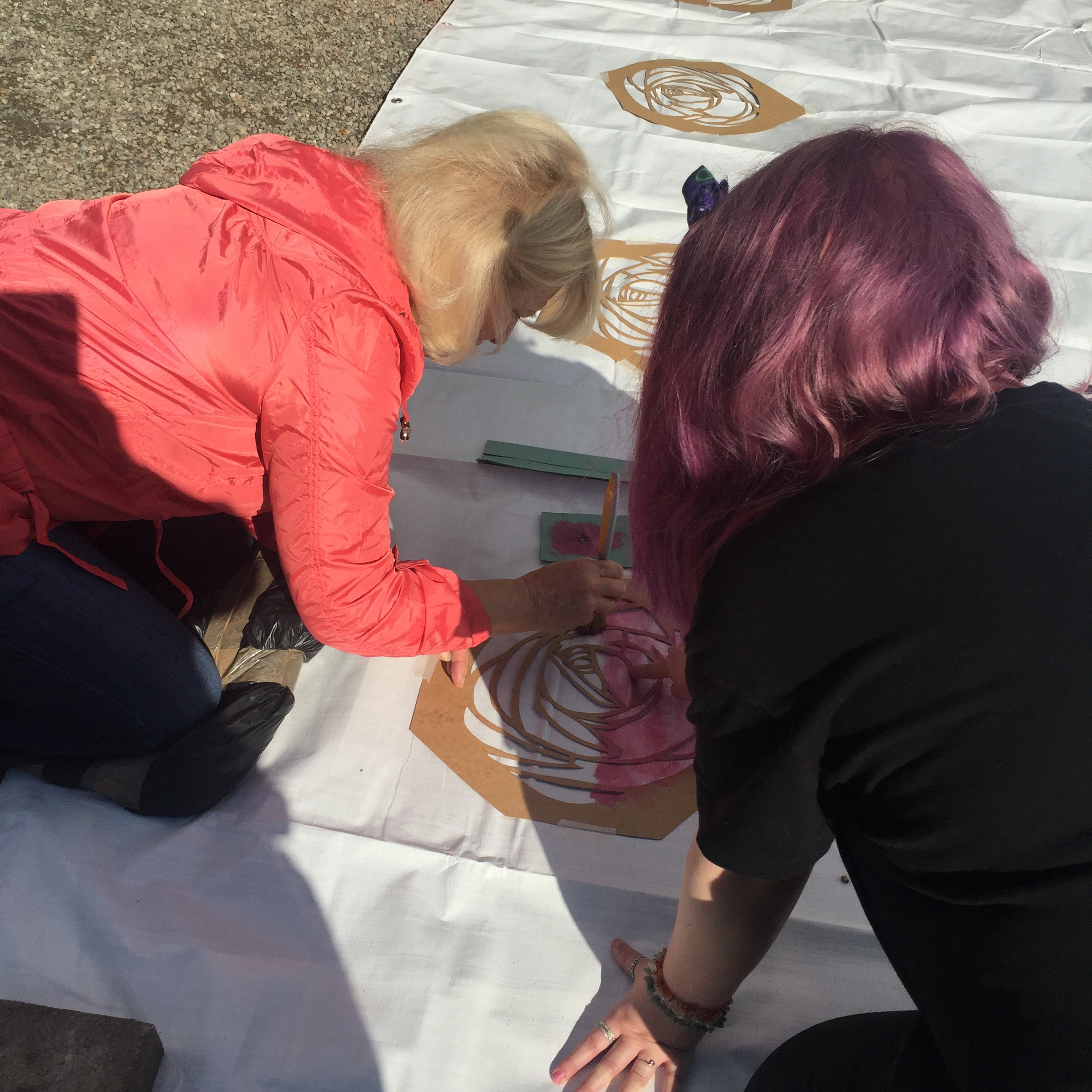Its a grand project, a year in the making, and many people involved in the preparation but today is a special day as for the first time the beautiful rose gets stencilled again and this time by the visitors themselves. To help me making sure they enjoy this #theGlasgowrosegirls my wee volunteers Rachel and Sula are giving them a full stencilling practise making sure they get the grip of their stencilling brush before they are given a cushion and down on the ground they get to stencilled their large cabbage rose.