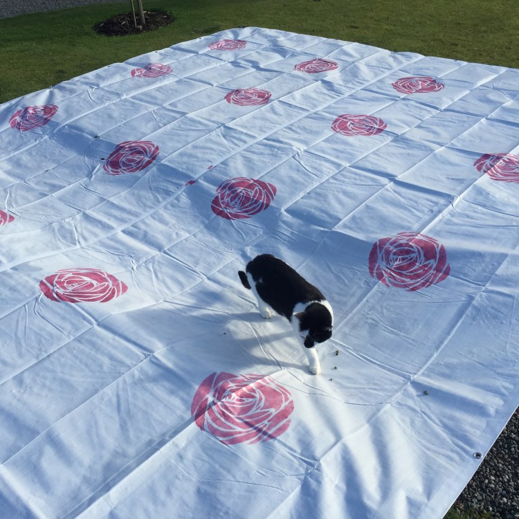 The result is stunning and after a second quick visit this week to check the paint and add the leaves I expect it will be there until the end of October a moving carpet which will tour around the garden to avoid yellowing the grass… Gavin the gardener offered to move it around for me. Thats a new job for a gardener… Moving the roses around without getting his hands dirty !