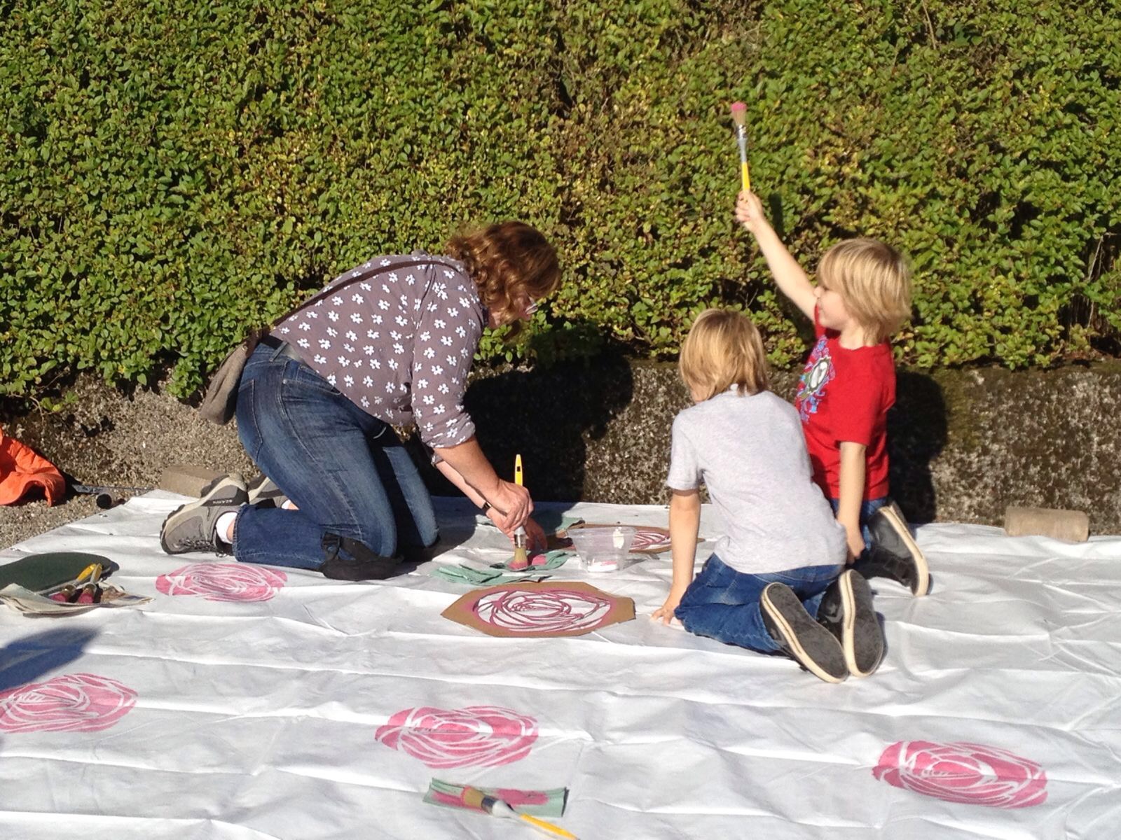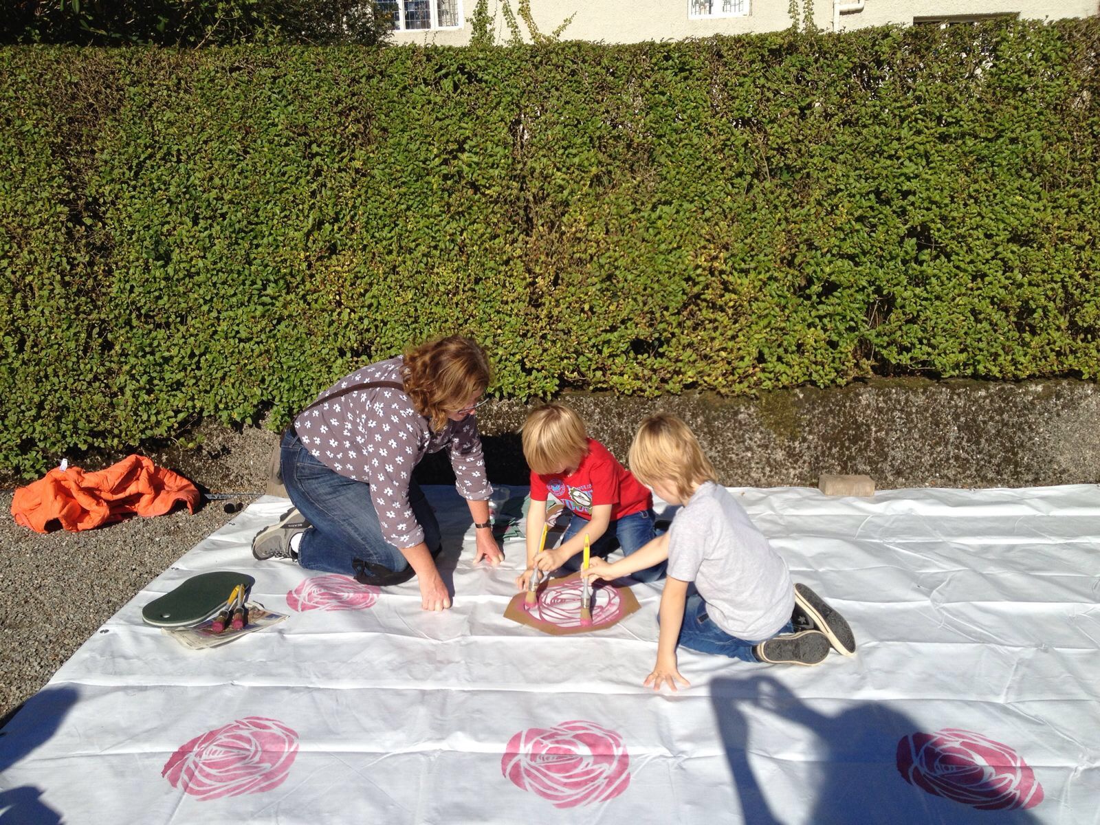 We arrived with a car full of stencils, brushes and paint, two volunteers and myself, that would be us “The Glasgow Rose Girls” and we set up a large piece of tarpaulin in the garden path. On it we would stencil during the day a good number of Charles Rennie Mackintosh designed roses. The Plan… make a carpet. Get the public to stencil those roses onto the Tarpaulin, getting them to remember the feel of hand-made Arts and Crafts. Getting them to look at some really good Mackintosh design and switch off for a few minutes from normal life to become an artist even for a few minutes.