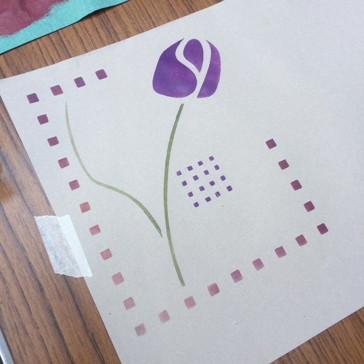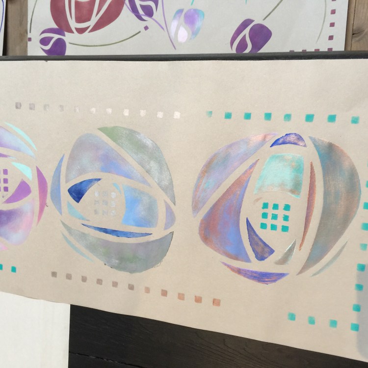 I always think its interesting to see how one’s artistic technique can be so different to another one. A fine art painter and an sculptor on top of their game still have to learn the basic steps of stencilling like any other participant… But an artistic mind can take a new technique and turn it on its head and a set design suddenly becomes something else. So we spent two hours stencilling the same roses and tulips again and again until reaching perfection.