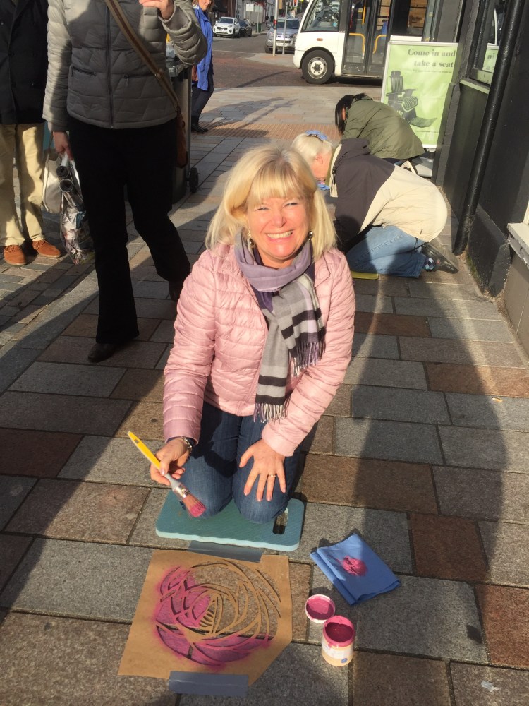 A great hall, roaring fire, large tables covered with stencils, tubs of paint and brushes and loads of paper, ready to start the day… One of the participants ho ho !!! surprise is Moyra who took part in the first event at The Hill House. Stencilled the first rose on the carpet, probably stencilled the last one on the pavement today. What a great compliment to the project to see someone liking the idea so much as to come back a second time…
