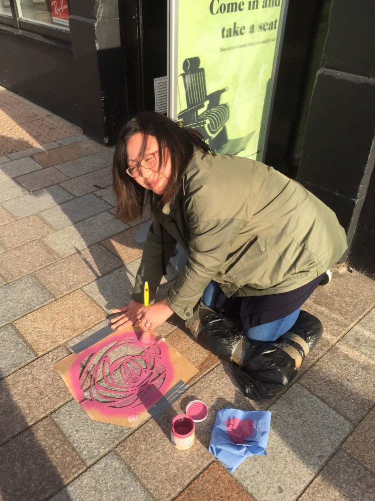 So we stepped outside as the sun was shinning and passers by were on the lookout for something to see. In an organised row, kneeling on cushions … we stencilled roses all the way from The Mack Club to the train station. Great big cabbage roses ready to show the way to the Club to any visitors who would have come from town (Glasgow) by train. 21 in total, one after the other, separated by 2 meters… I even believe that Bruce woke up extra early the next day to stencil the 3 missing ones on the road as the traffic was to frenzy that afternoon. So today 24 roses stand proud in their pink glory… ready to be admired.