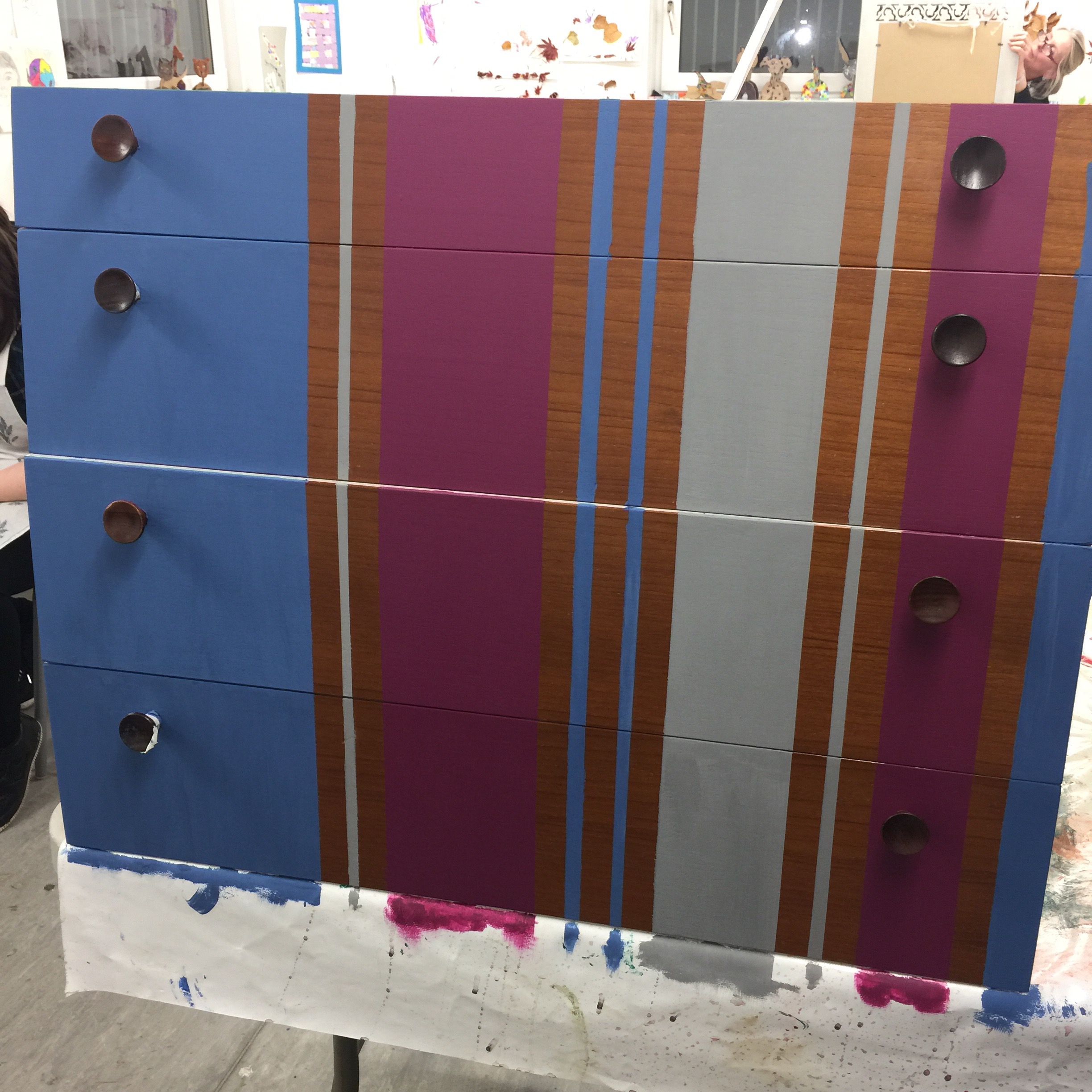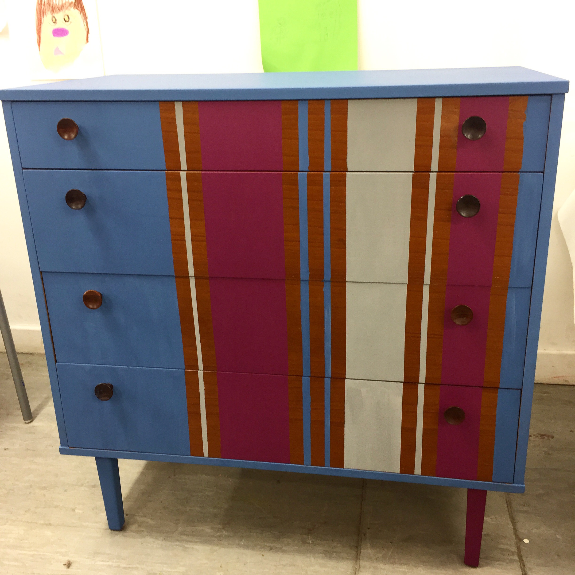 That reminds me about last term when Candice finalised her last piece by taping across the front of her chest of drawer some vertical bands of very striking colours. The technical difficulty here off course is to make sure that all the lines are completely vertical and match… I think the result was very stylish dont you? what a great result for a piece purchased out of charity shop for around £20.