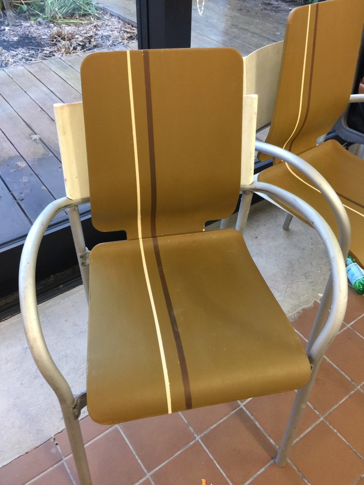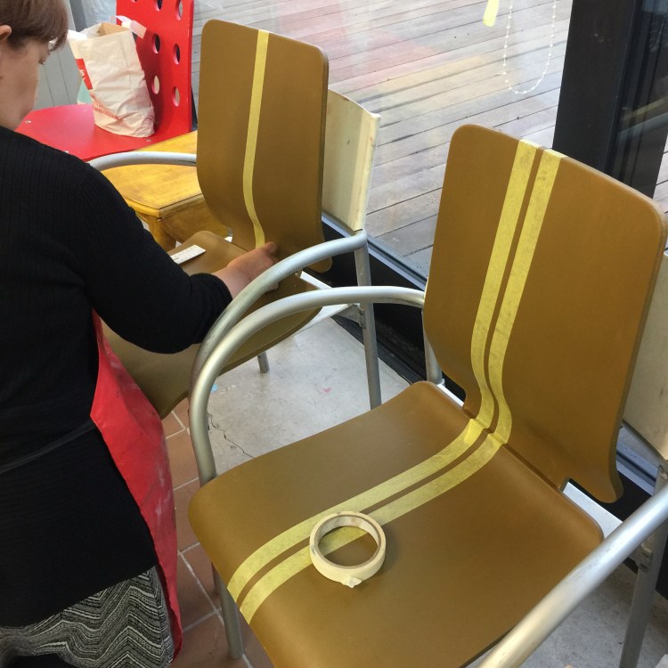 Maureen worked for the past few weeks with two chairs she purchased for the whole of £10 second hand… she did apply a lot of energy into preparing them, covering the bad wood with layers upon layers of priming then applying a cinnamon colour as a background. Today she has started the final stage of the decorative process, lining tape to create a large band of coloured lines all in shades of spices, cinnamon, and others, the final stage will be to apply a stencil of a circular yet striking motif on the seats. Almost there, but very impressive skills in lining up very vertical lines of tape can be tricky and Maureen did very well today in setting up the scene. I am looking forward to see the final stage next week.