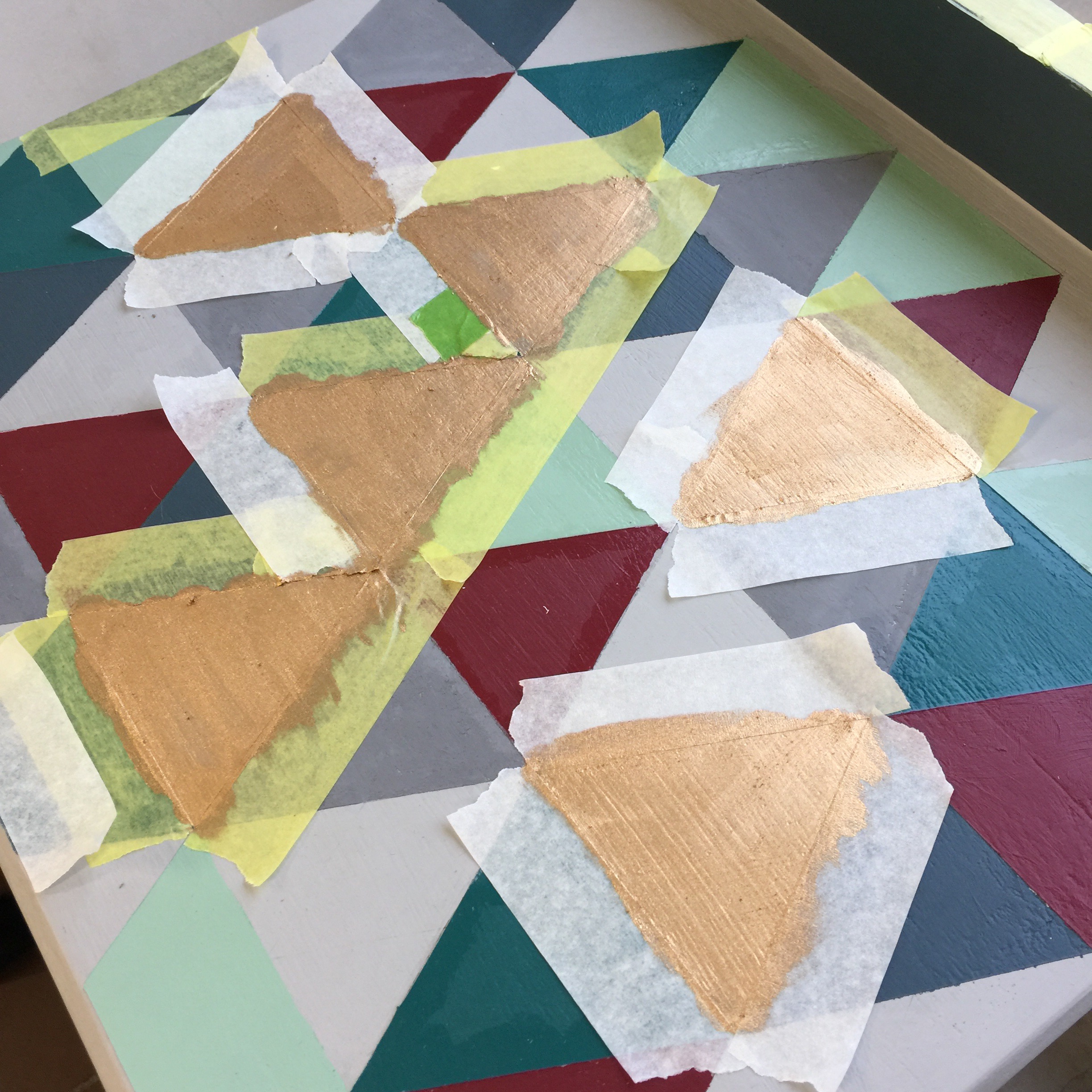 An ensemble of triangles of different colours in a chalky paint, contrasting in an organised manner. Today Rosie added some gold triangles, a “home made” paint made of metallic powder mixed with Shellac, creating a vibrant contrast. This is an alternative to the difficult to handle “gold” leaf.