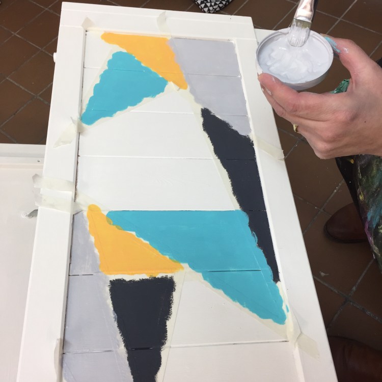 Sula’s chest is below, this is a discarded piece of inexpensive pine furniture which almost found its way to the skip. Sula brought it in … just to practice on and finished it today by decorating it with bold triangles of blue, greys and yellow. The design was created by stretching long stretches of masking tape in various directions creating triangles of different angles and sizes. A very quick and simple way to decorate.