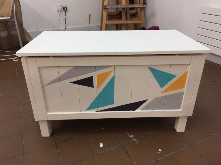 This season, my group of up-cyclers have been experimenting for their furniture with geometrical shapes and bright colours creating patchworks of triangles and squares, and vertical lines. This is a simple yet very effective way of decorating a piece of furniture. Its simple and effective and easy to set up. Below are three examples of realisation by some pupils from this year’s group.