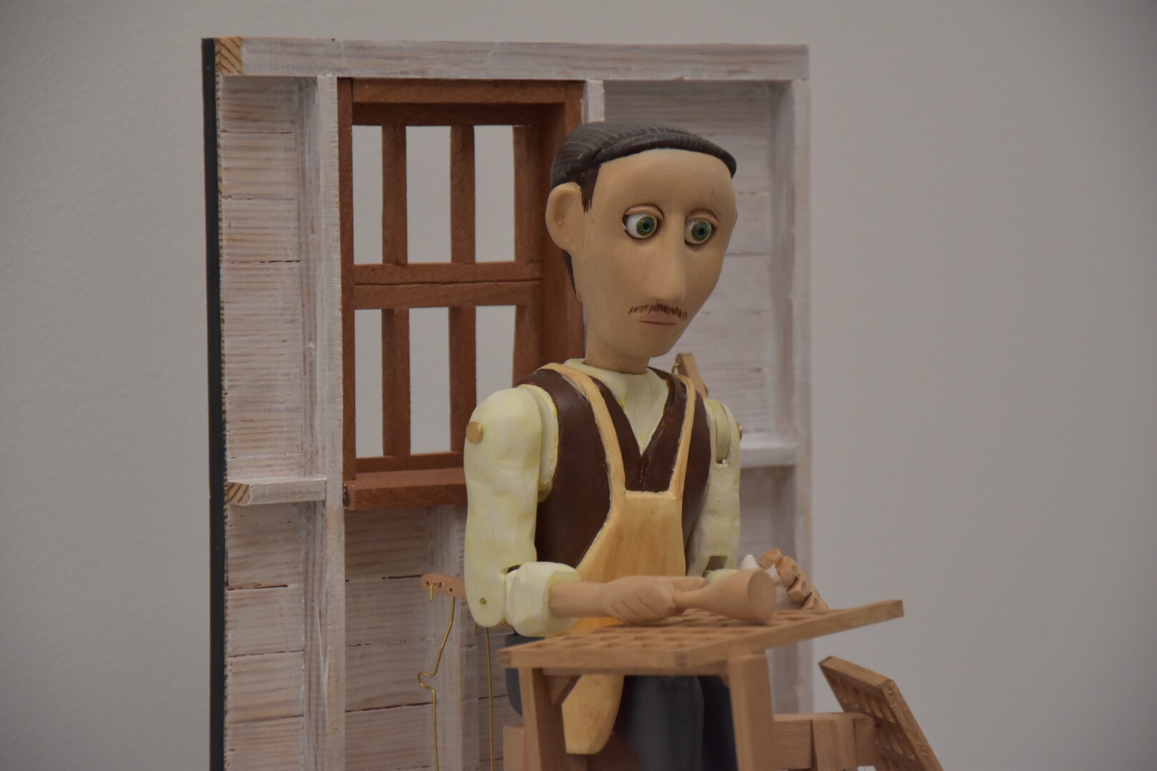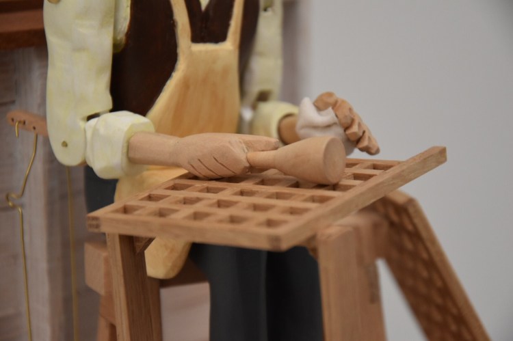 The result of Tom’s work is stunning and so meaningful, a seat casted in metal, in the middle of a white room decorated with a stencil border, the first layer of the 1920’s hall lounge border. And a little chair making automaton ! That’s Charles Matts’s mallet … Charles Matts was the foreman in the Isles of Man workshop … how focused is he in making the little stool !