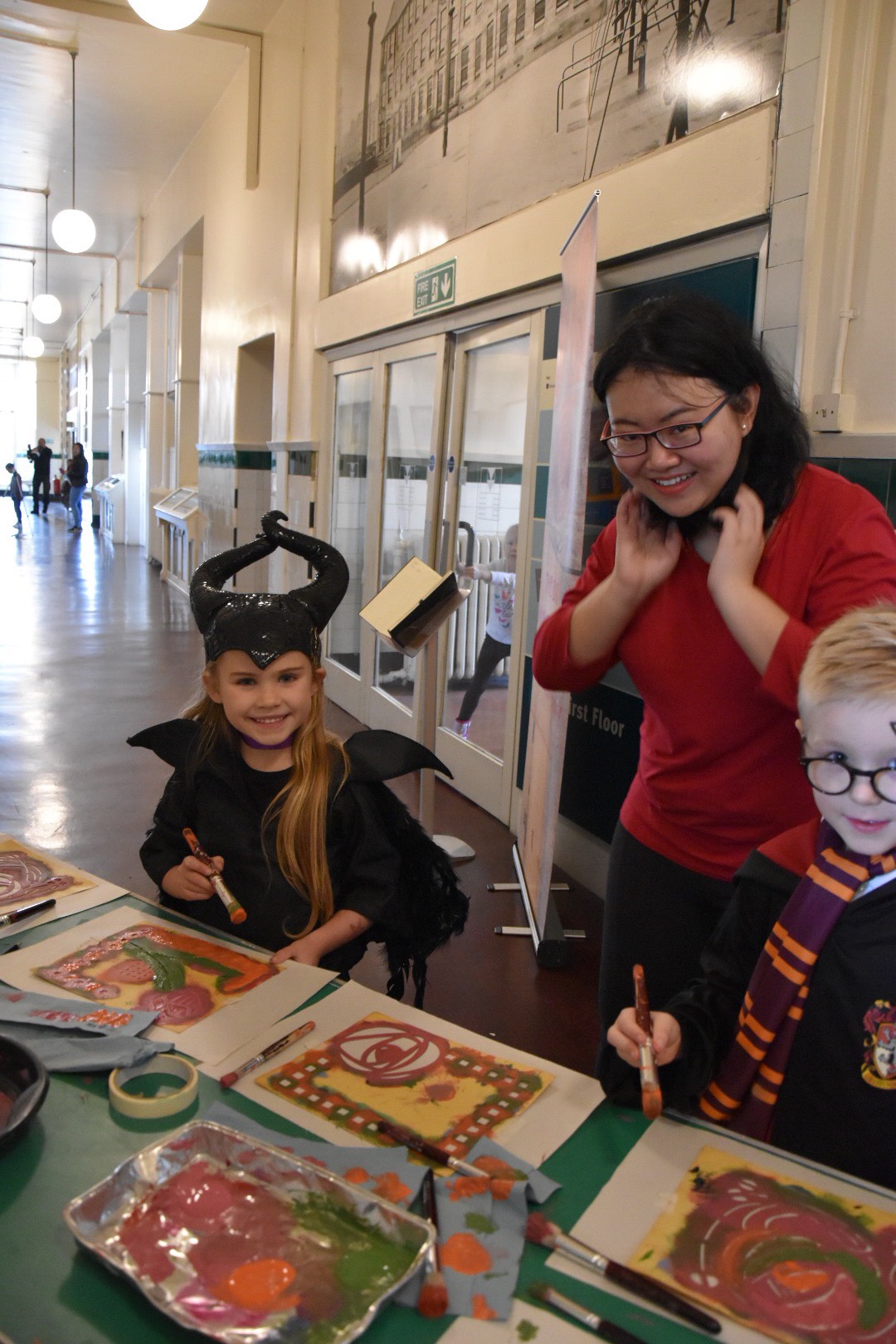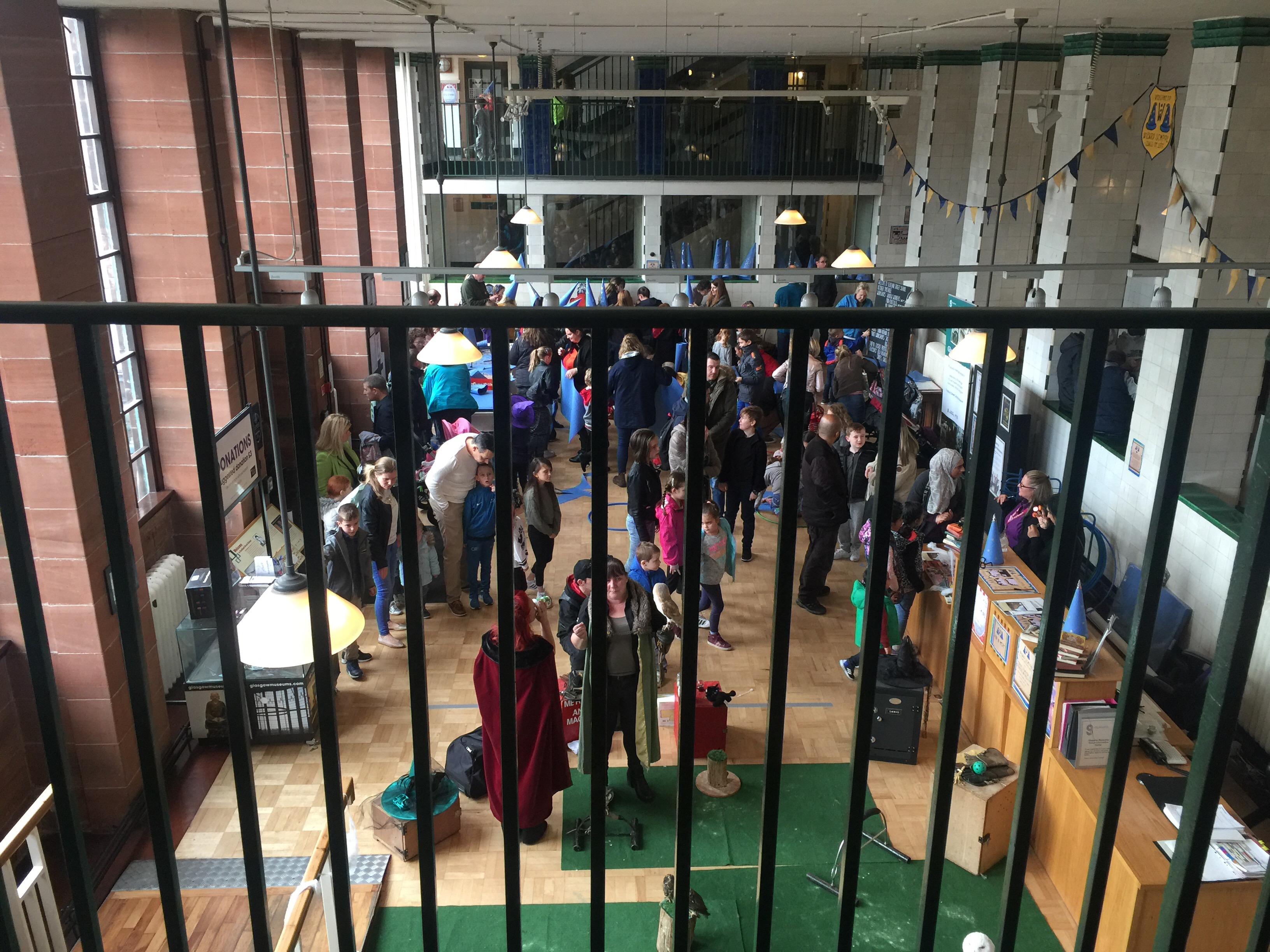 Scotland Street School is a striking red sandstone building that Mackintosh designed for the then Glasgow Corporation as a school. In a busy area of the Southside of Glasgow it was to become a school with a side for girls and a side for boys. Interesting bricks, bright blue stain glasses and loads of iron work its is standing like a Fort ! many years later it is now part of Glasgow Life the organisation which houses the “Museums” of Glasgow. Scotland street is seen as the “Children” museum but it is also right in the “Asian patch” of Glasgow and at the moment houses a most interesting exhibition about the Asian community in Glasgow. I have ran classes in its very large foyer years ago and it was so very fun to come back here for two of the Big Banner workshop this week.