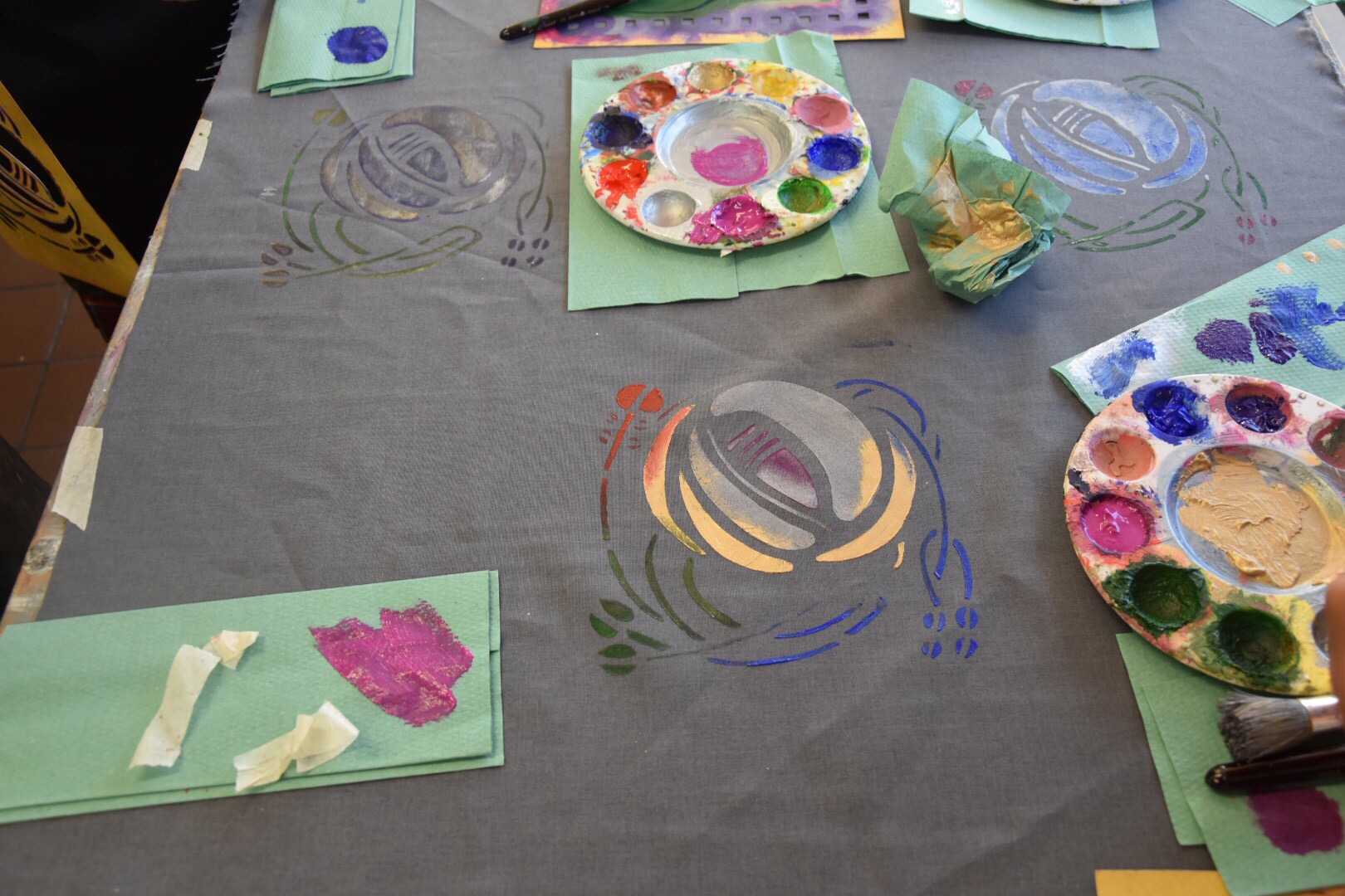 Stencilling is just a decoration technic after all isn’t it ? It is the action of transferring a design using a stubby brush and some acrylic paint through the holes of a template. Wether the stencils are of Mackintosh designs or not… there is nothing to prevent you from using rainbows of colours to imprint the design. I am always surprised on my stencilling courses to see how 10 participants starting with the same stencils and paint end up with very different designs. So no wonder that a group of very creative young girls could come up with such wonderful and colourful designs…