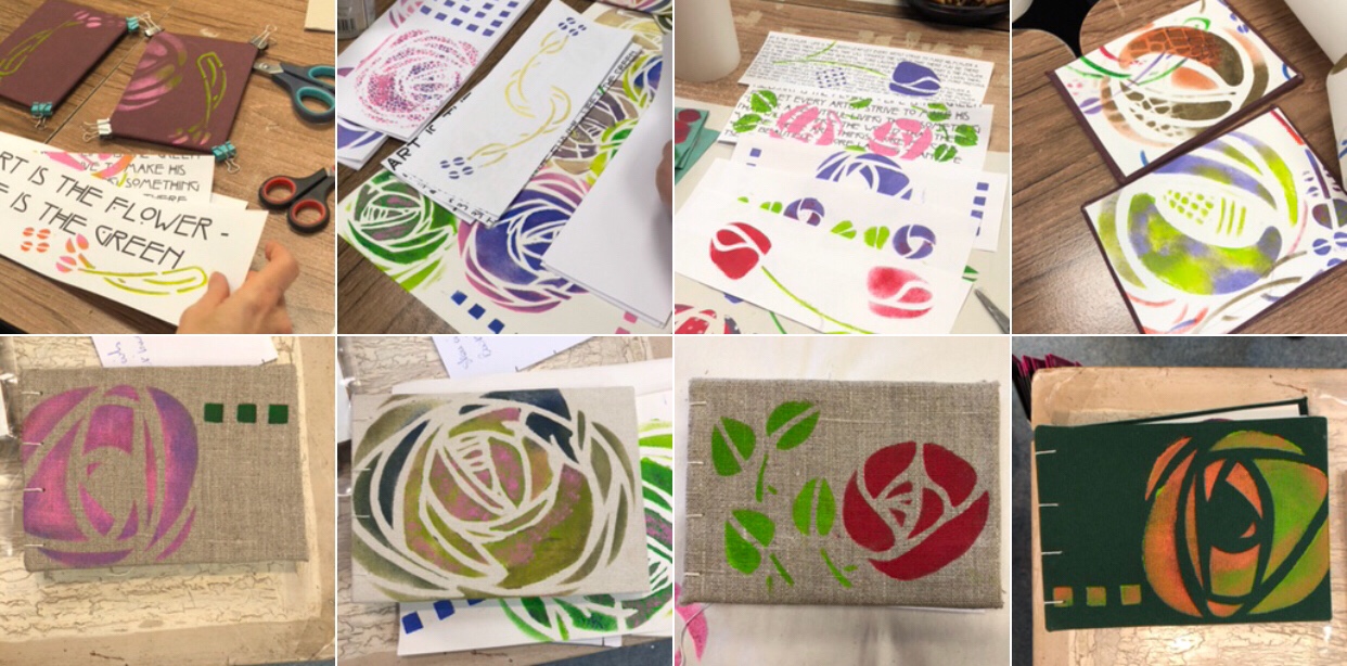 A few days ago I received this very lovely message from Betty .. a participant from my last Stencilling and Bookbinding workshop in Glasgow ! … “Thanks to you and Cass, for such a wonderful inspiring day… To come away with my own stencilled bound book was amazing… ” What best reward can you getContinue reading “When Betty came to my workshop to Stencil Mackintosh !”