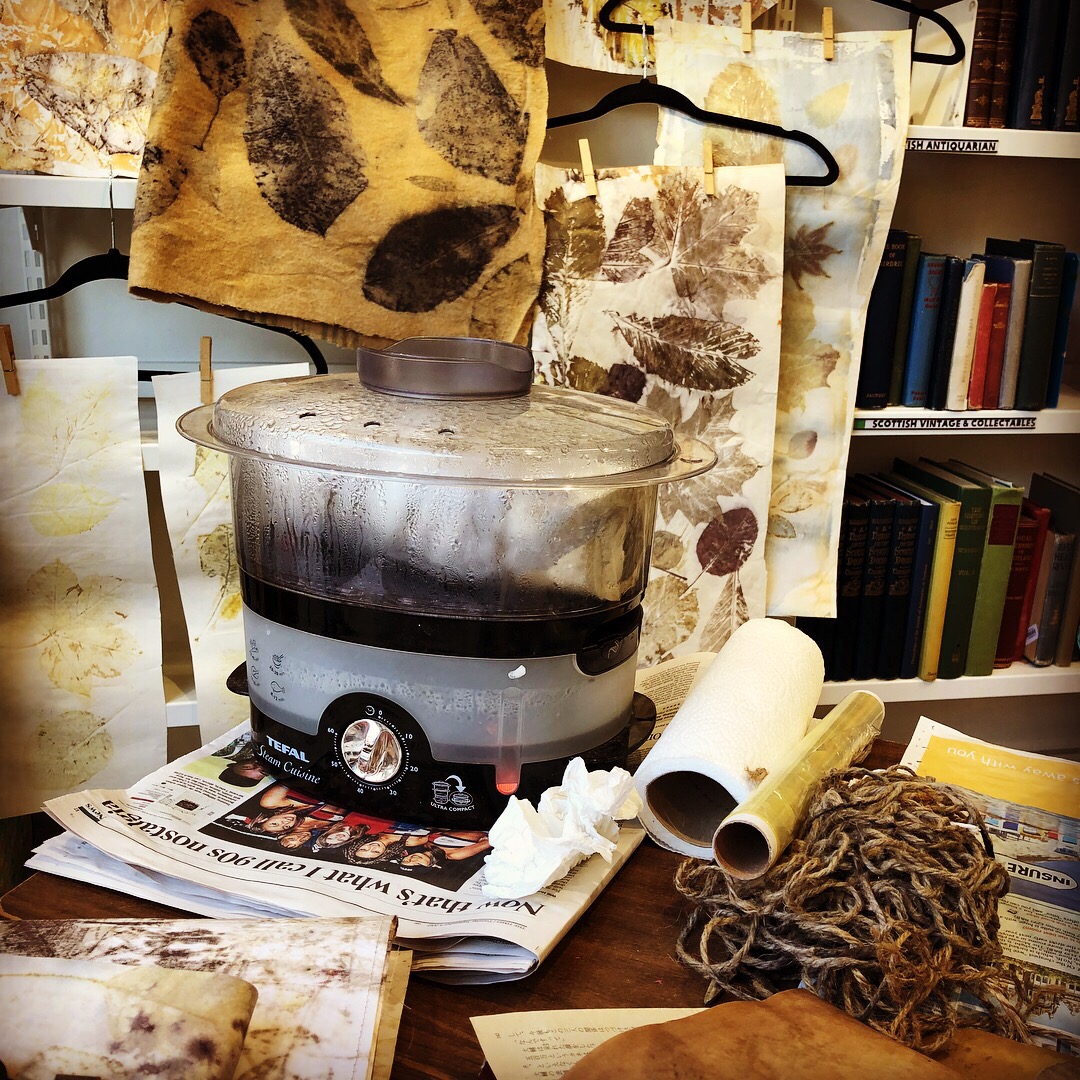 But the story is not over… those results are now in the window of the Oxfam shop for all to see for a long week… Many should walk past and I hope the prints catches their eye because Cassandra and I are running an Eco printing and Bookbinding next week on the 25th of March in the glorious Kibble Palace and I hope a few more will join in the fun. For details and bookings look Here