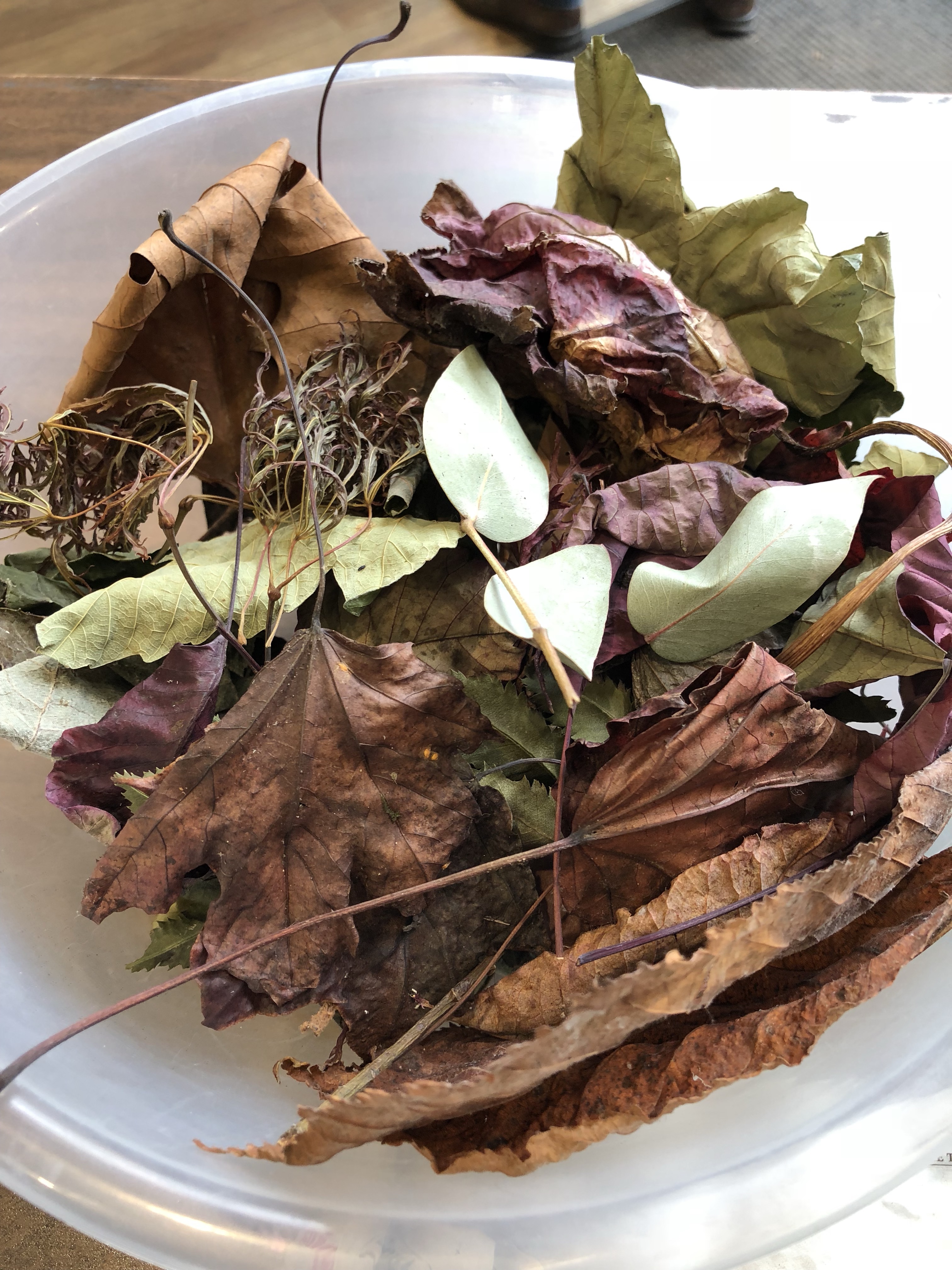 Blue cloth, recycled paper, lining and textured paper for resist, rehydrated leaves from last autumn, string, piping, cling film, ferrous sulphate mordant etc… and a good old fashion steamer.