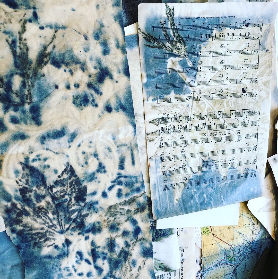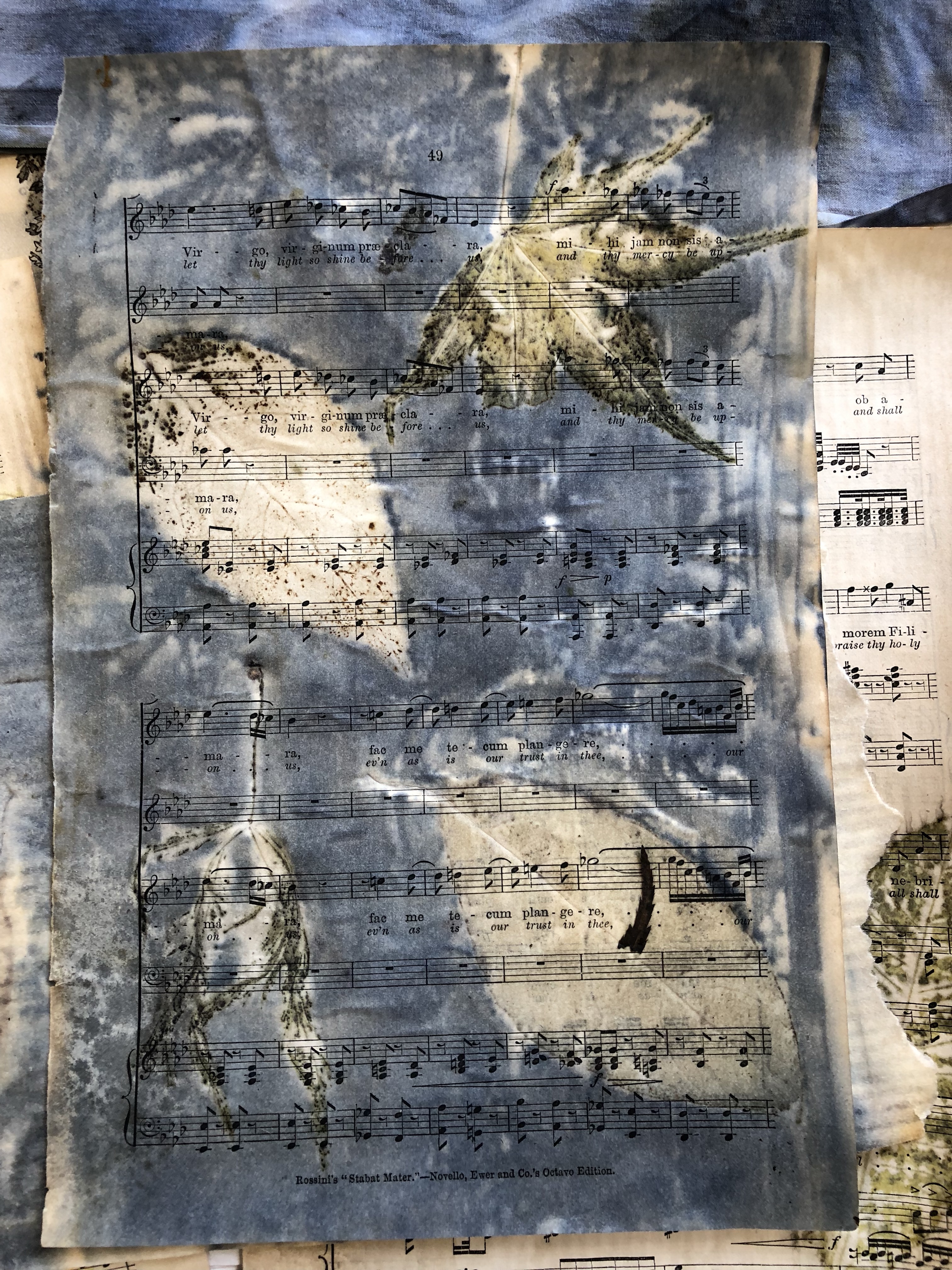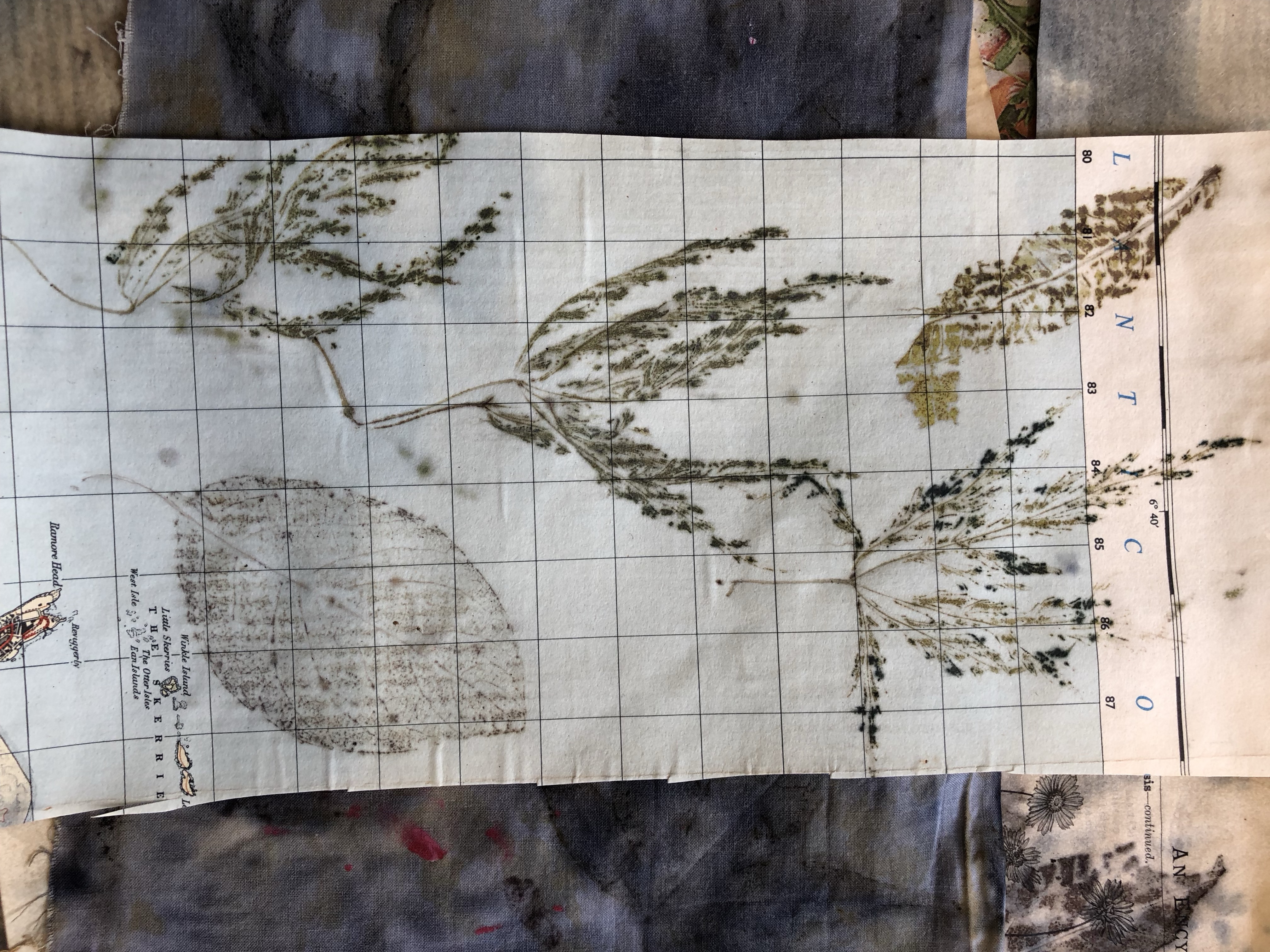 I live and work in the West end of Glasgow, the Green Dear Place… only a few minutes away from The Byres road and its great Oxfam Book shop, and from the very well loved Botanical gardens. From time to time I work in collaboration with the Oxfam bookshop and demonstrate my creative techniques using material you can source there for pennies… I think it is a great idea just as you can cook from first principal from the content of your fridge… that you can be creative using recyclable material found in charity shops. So last week I spent two afternoons eco printing in Oxfam using old music sheets, old maps and loose pages of an old encyclopedia. This is what I will be teaching next sunday the 25th of March during my Eco printing and Bookbinding workshop at the Botanics, I am running this with Cassandra Barron a bookbinder from Edinburgh it will be much fun ! No many get to be creative in the Kibble palace:)