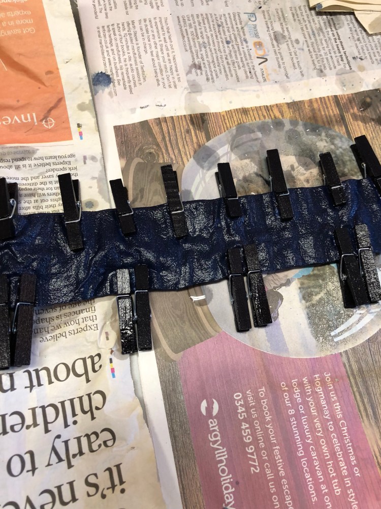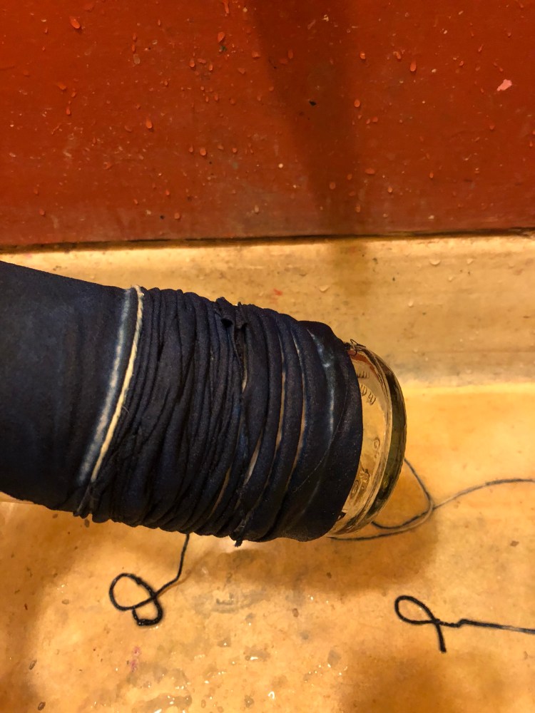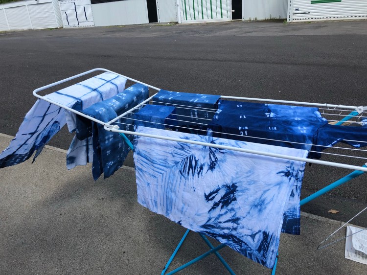 So I set up my own course! A week end of dyeing blue stuff ! Last week end ! At the House for an Art Lover ! A great big space two indigo vats! Huge rinsing buckets ! Two clothes horses ! A box of tricks (pegs, ties, elastic bands … ) and many chocolate biscuits !