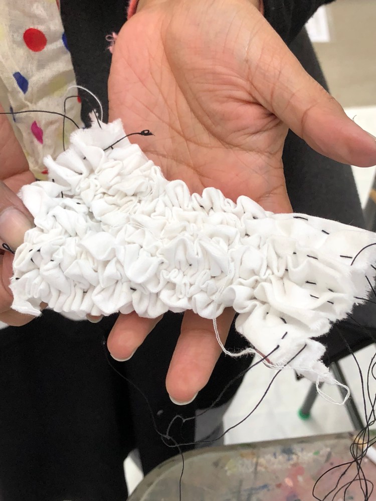 When you have a mixed audience you have to stay simple so everyone learns and get a result … while offering most advance pupils the opportunity to push their boundaries ! Di, one of my pupils for the day, was very focussed on remaking two items of clothing as well as working on her samples …Martha, the young girl worked on a tote bag ! But all were at the end of the day in complete awe with their results … as well as learning traditional patterns, we had some free time for play and that work was by far the best !