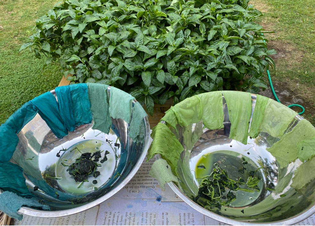 Still being isolated meant no sharing of the experiments and that was a little sad… there is a complete buzz when harvesting something like Indigo. So my usual sharing was done via social media and I know many were excited about my results… I had to give a little try to the leaves rubbing technique. On small pieces of silk it was a great success. Around that time I ran one garden workshop and the 4 participants after their botanical printing got a chance to hand dye a small piece of the most glorious silk using this technique. A treat