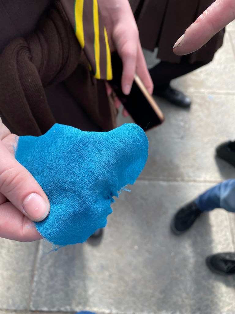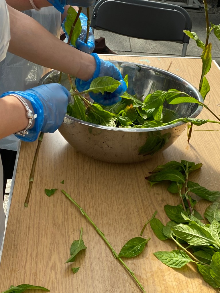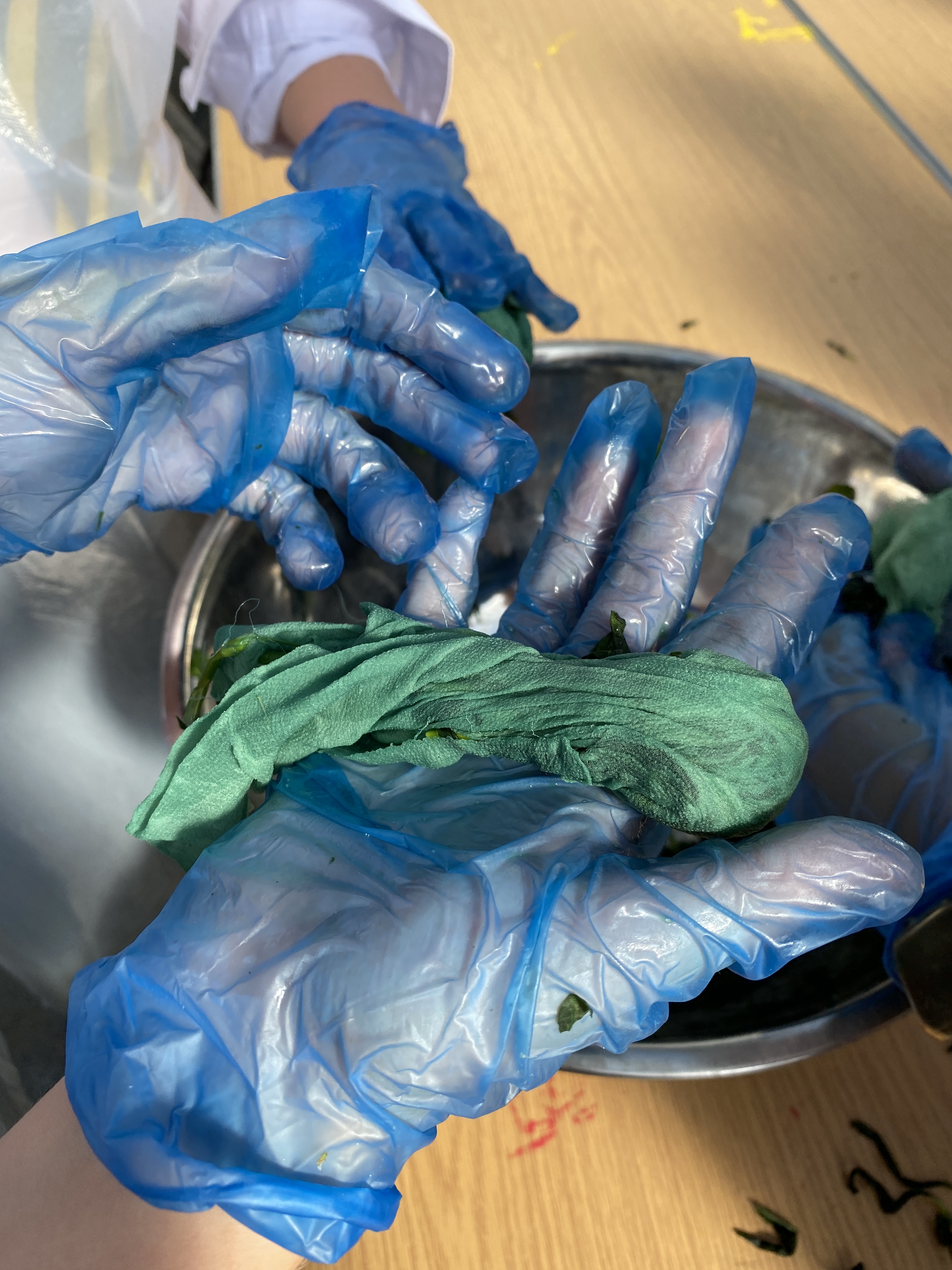 Once the bundles were in the dye pot we moved to Natural dying some small section of silk with fresh leaves of Japanese Indigo. It is a very special process and quite a unique one as the Indigo is grown in the Botanical Garden in my dye garden I called “The Indigo plot” . Very few growers grow Japanese Indigo in Scotland this is probably the only school this autumn that has had the chance to try their hand at that technique. We used the salt rub method. That consist in rubbing the leaves until the Indoxyl in them comes out and when rubbing the silk in it it oxidises with oxygen and becomes blue. It is a magical process and the children loved it. They spent a good amount of the time trying to understand how it worked and the rest of the time finding out how to get the best blue. Three groups trying all to get the best blue. It was a lot of fun.