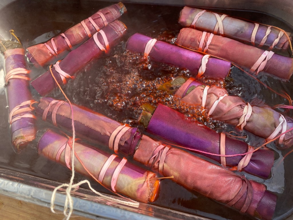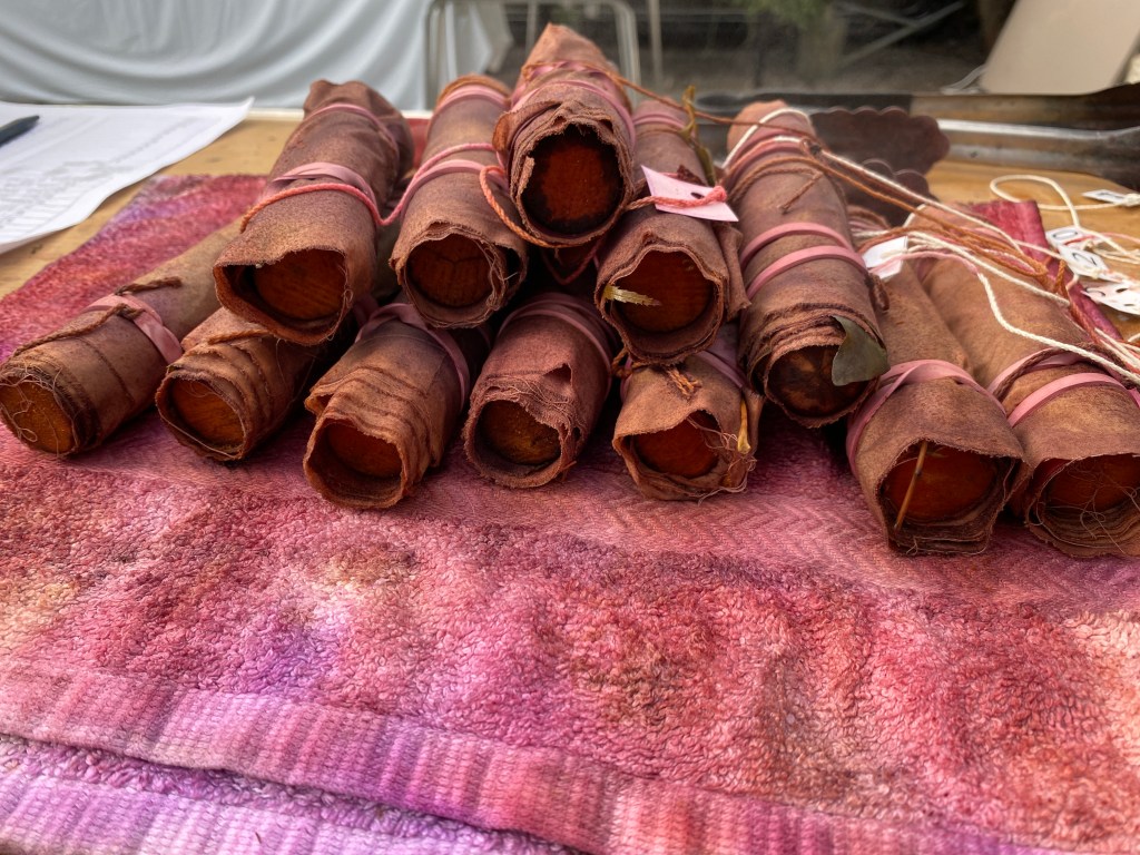 Off course I did not teach 100 children in the one session. That would be completely mad. Small groups of 12 gathered around the table and together we rolled some bundles. We used local leaves and simmered them in Sapan wood, a natural dye from South East Asia that gives a great pink. Natural dye can be of very happy colours.