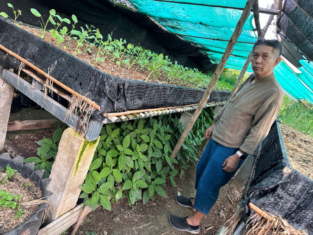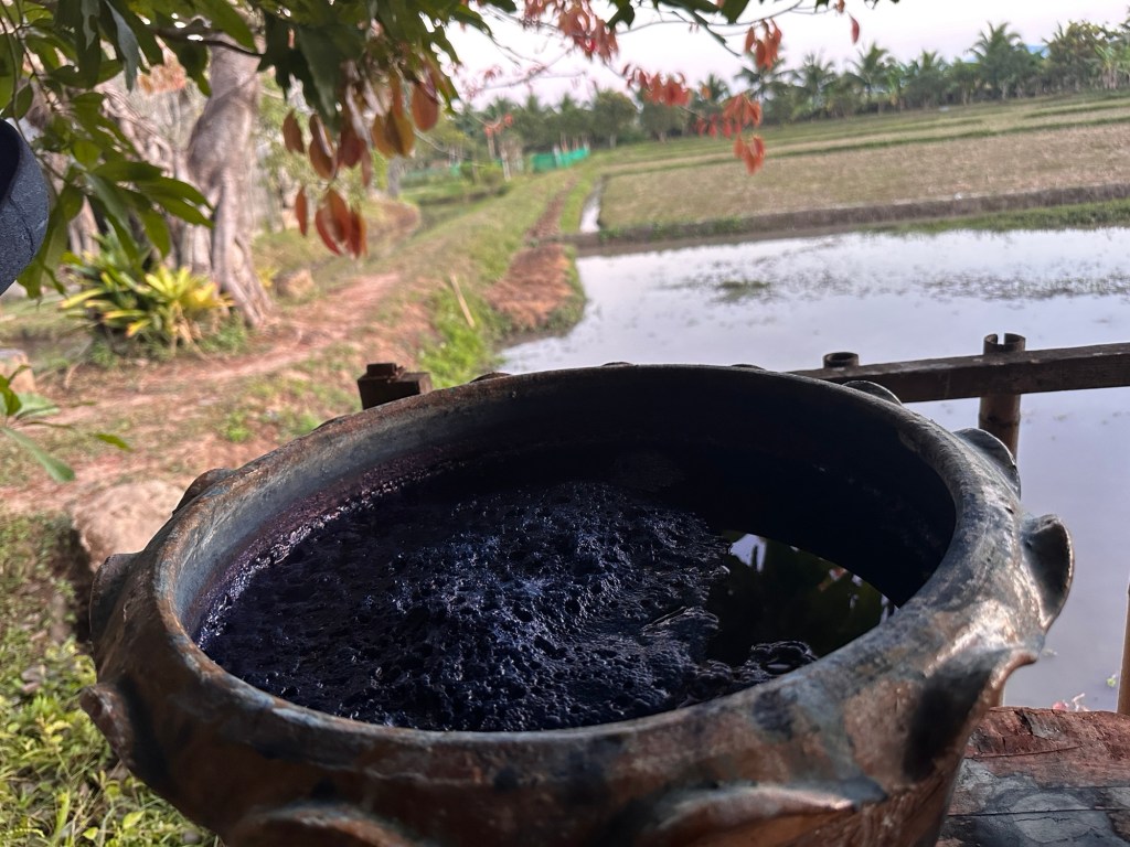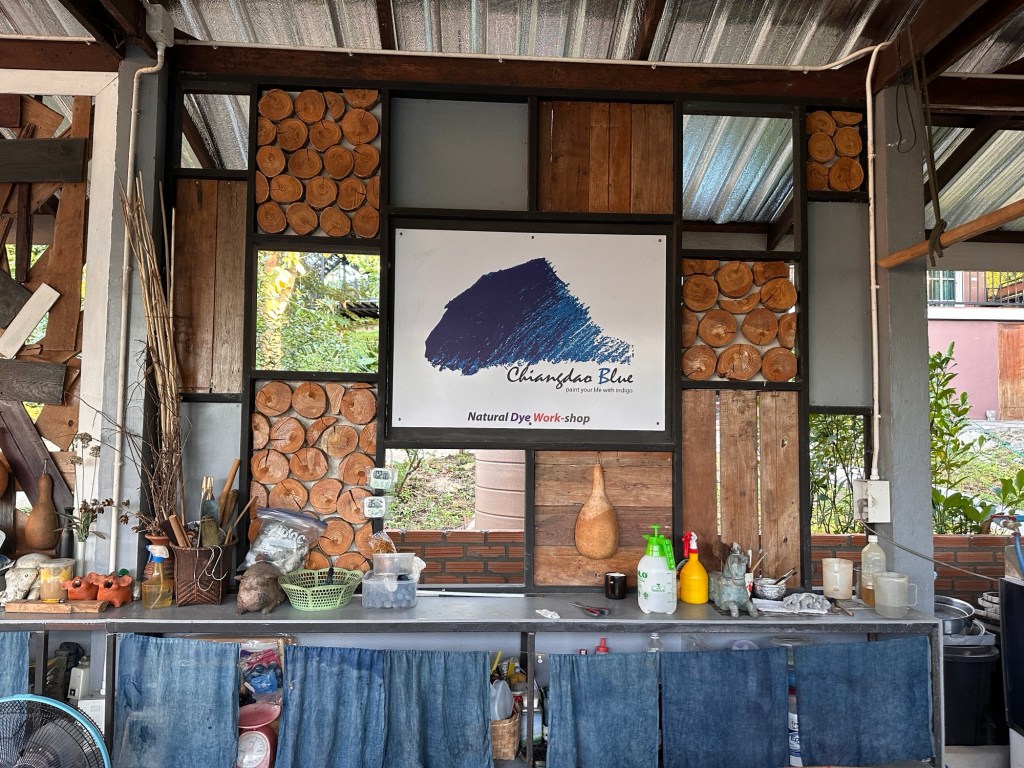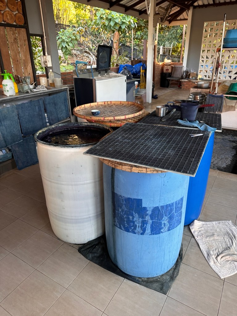 But two days before New Year, I received this invitation from Kun Siripohn from Chiang Dao Blues, a lovely dye studio at the foot of the large mountain in Chiang Dao. We had been communicating in a digital Indigo Pigment Extraction online about working with Japanese Indigo. I asked if I could visit for one day (having to find a driver to take me the 90 minutes drive to find her), I received the answer … are you free for New Years Eve? And off course I was. When everyone else was busy partying and counting down I was very free indeed. So the Invitation came as “My friend is driving here he will take you on 31st and bring you back on the 1s” a very business arrangement… And on the 31st I was ready for pick up.