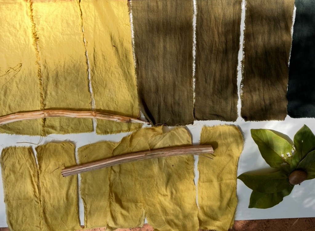 But how to create a complete colour pallet… modifying is a technique used in the West to create a range of shades from one original dye bath. Ferrous sulphate is a traditional modifier and can shift yellow into green, or greys. I found in South East asia we use lime water as an alkaline with many dyes, Raising the Ph of some dyes will change some dull brown to gorgeous reddish ones.