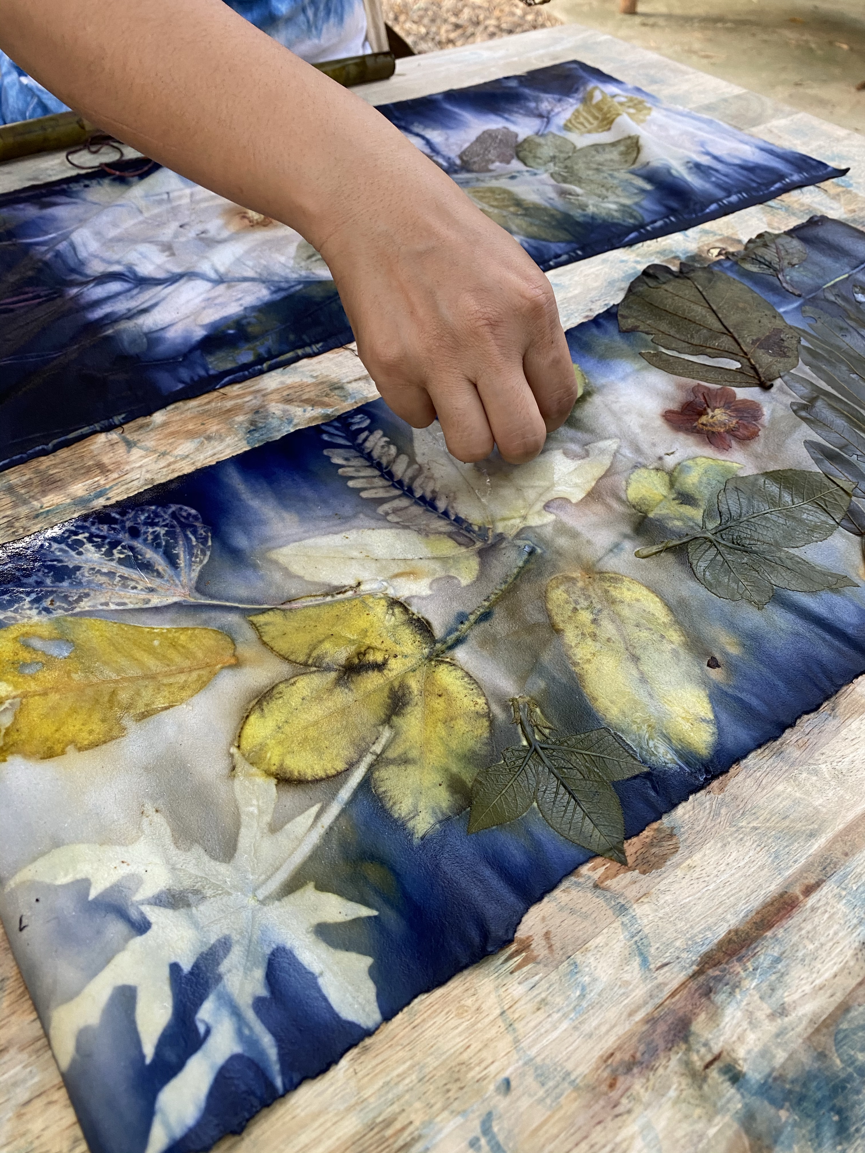 I love working with Oak tannin although there are many different tannins available from Chestnut of the European forest to Myrobolan of South East Asia, depending on what part of the World you are located. I use it to create wonderful background for my eco prints. Just look at those… on linen and silk some of my local leaves eco printed using the tannin/iron relationship.