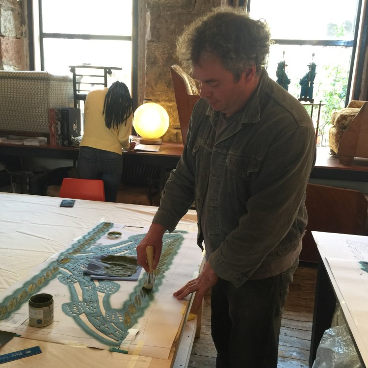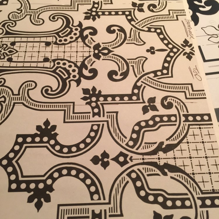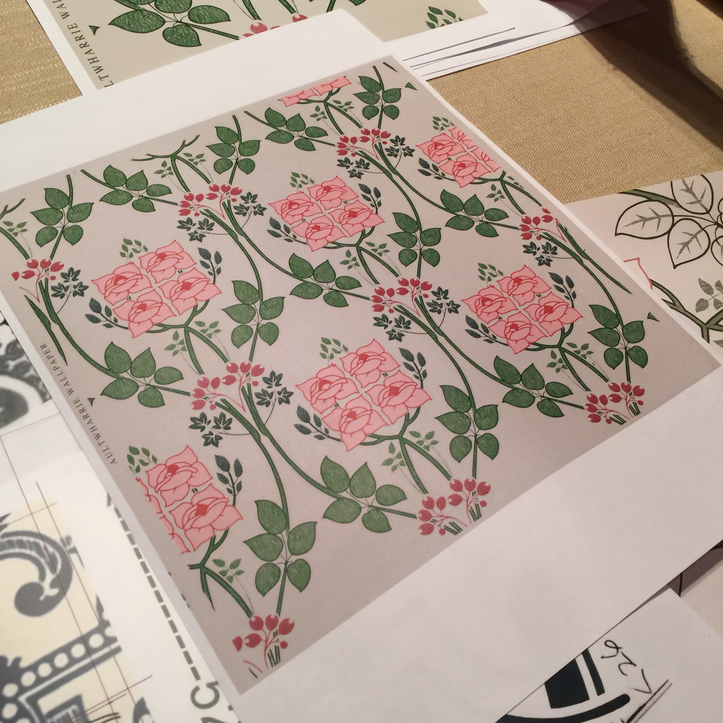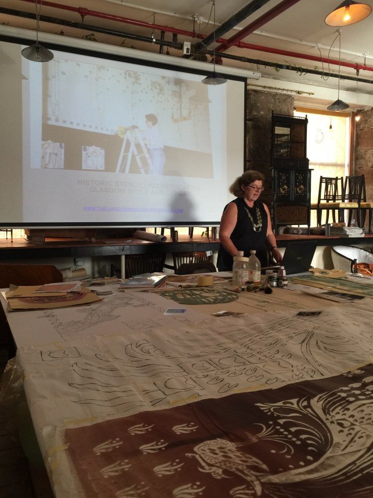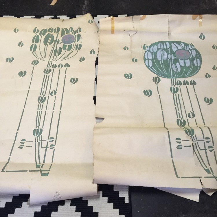 If you walk down the lane from the Buchanan street and follow a trail of bright large roses in the style of Mackintosh you get to the front door of this bright, narrow but tall building. I know that because … I stencilled them, one Friday afternoon in October.