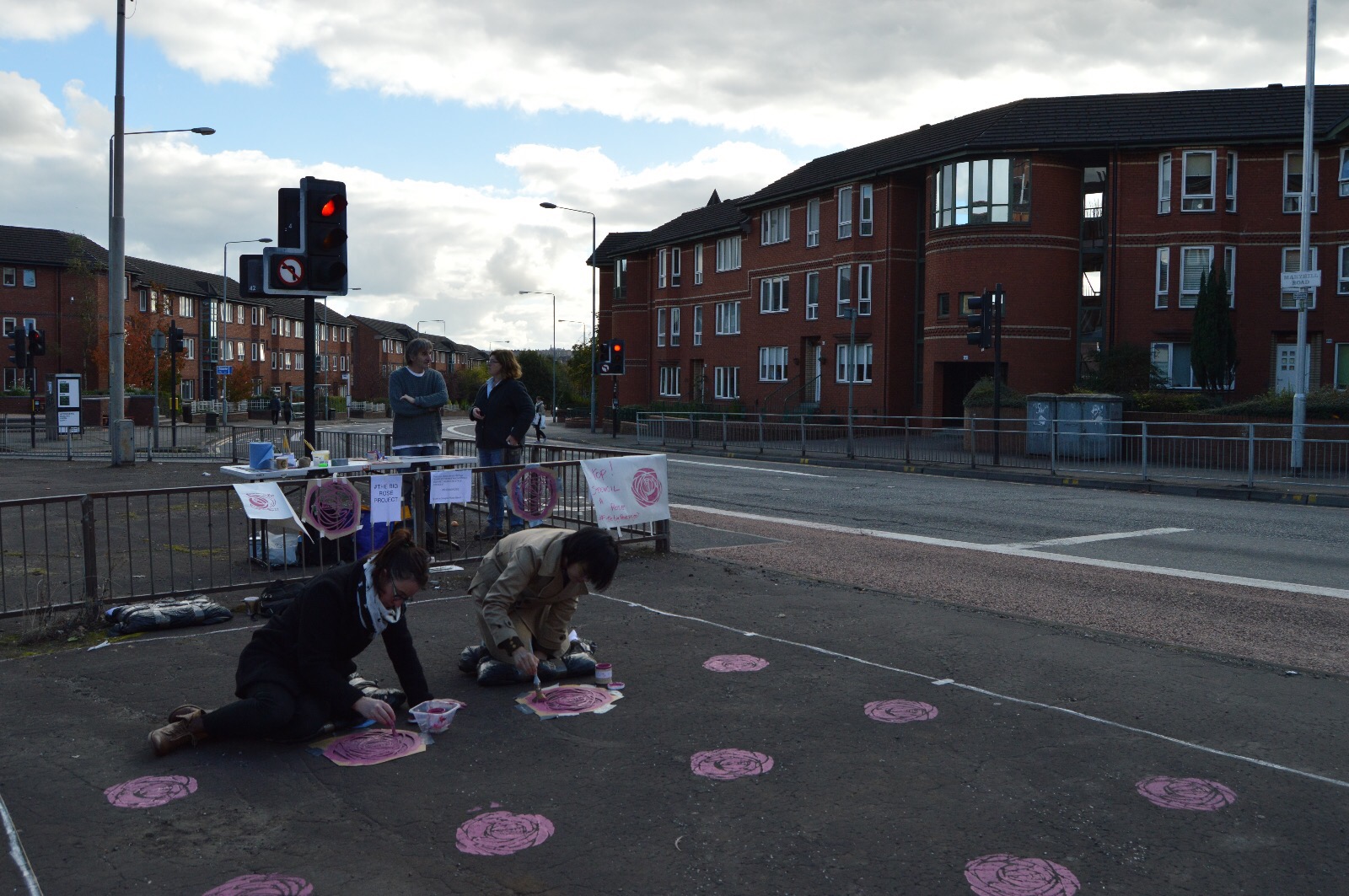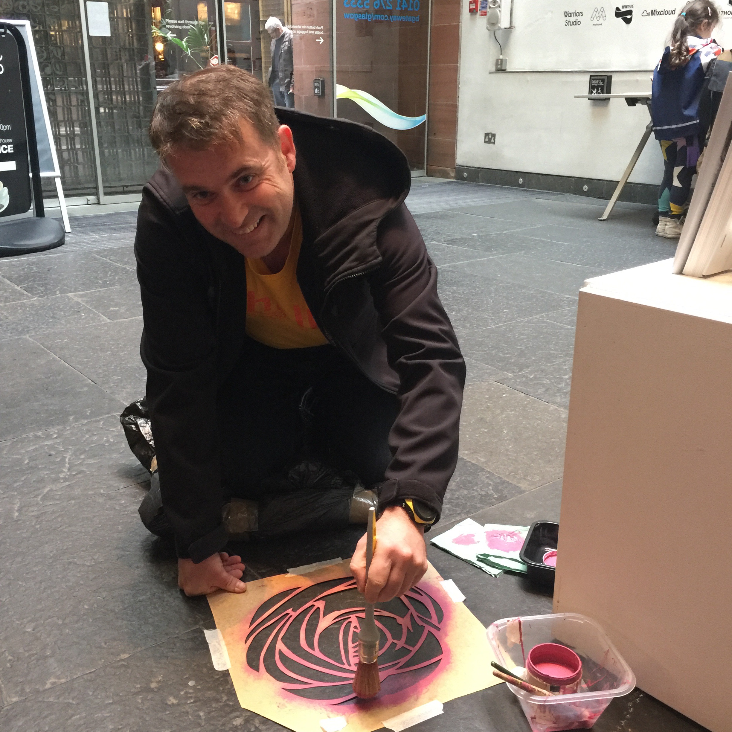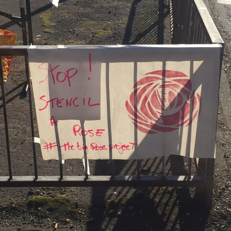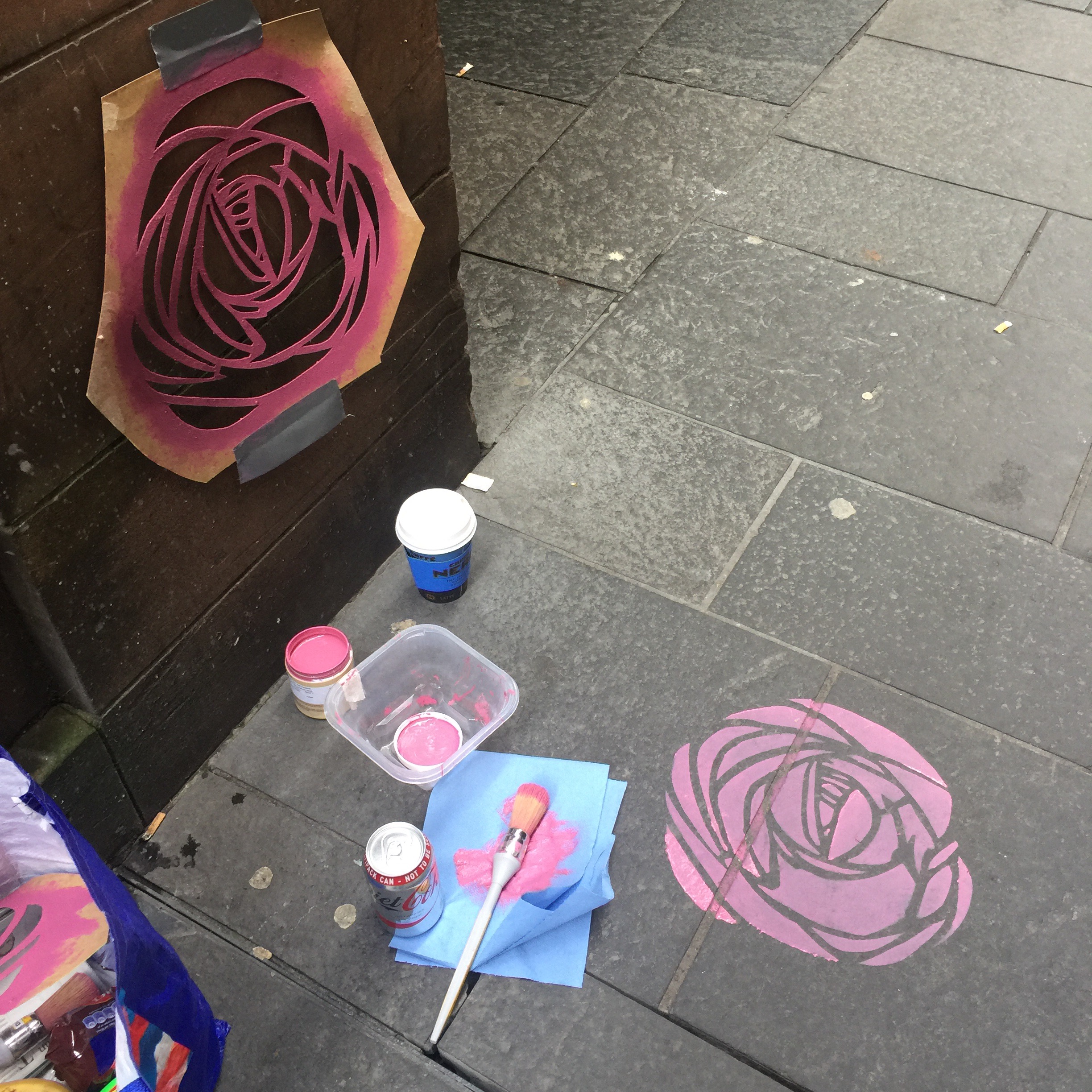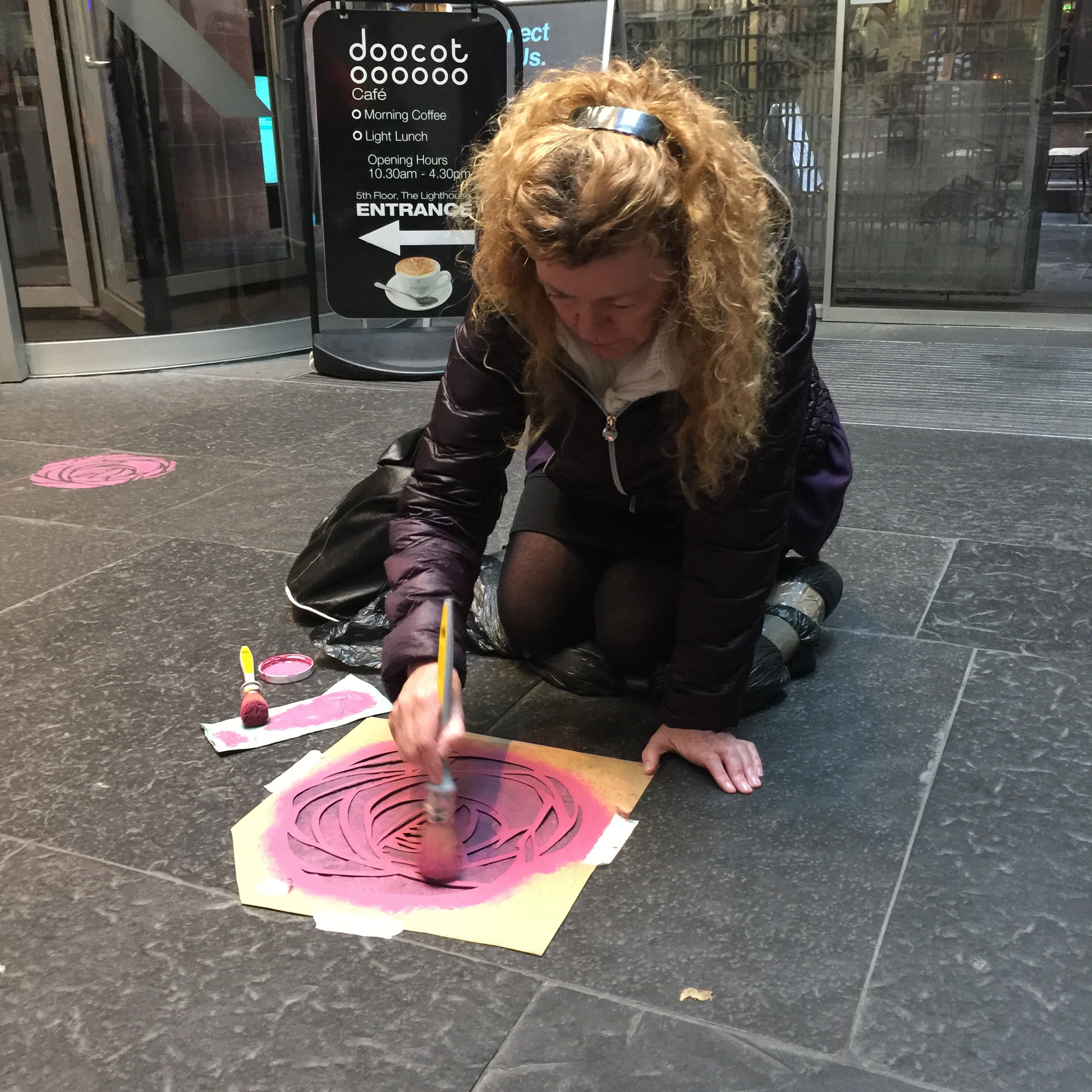 The Lighthouse welcomed #Thebigrose project for a full day demonstration on the 15th of October. Elisabeth, Sula and Lee-Anne arrived with bags full of stencils, brushes, paint pots and masking tape, a few folded sheets of newsprint for the public to practise on and great trepidation. Michael and old friend and great photographer @Ruanaich popped along a little later to say ‘Hi’ for a short while, 5 hours later he was still helping stencilling pink roses on the flagstone and taking great photos which he would later turn into a great video of #thebigrose project.