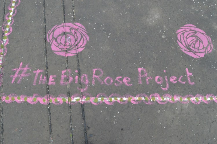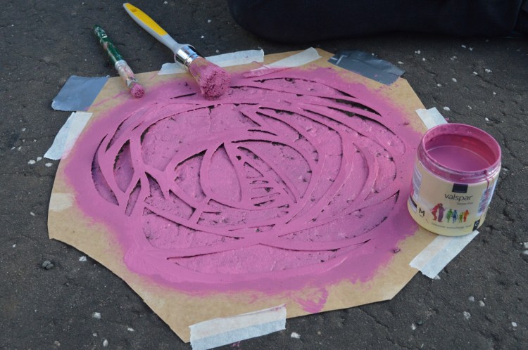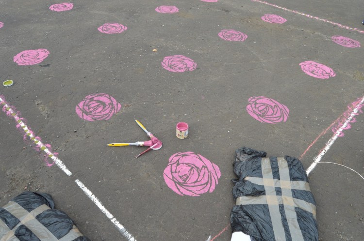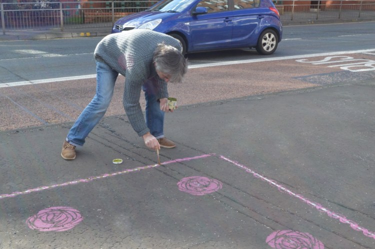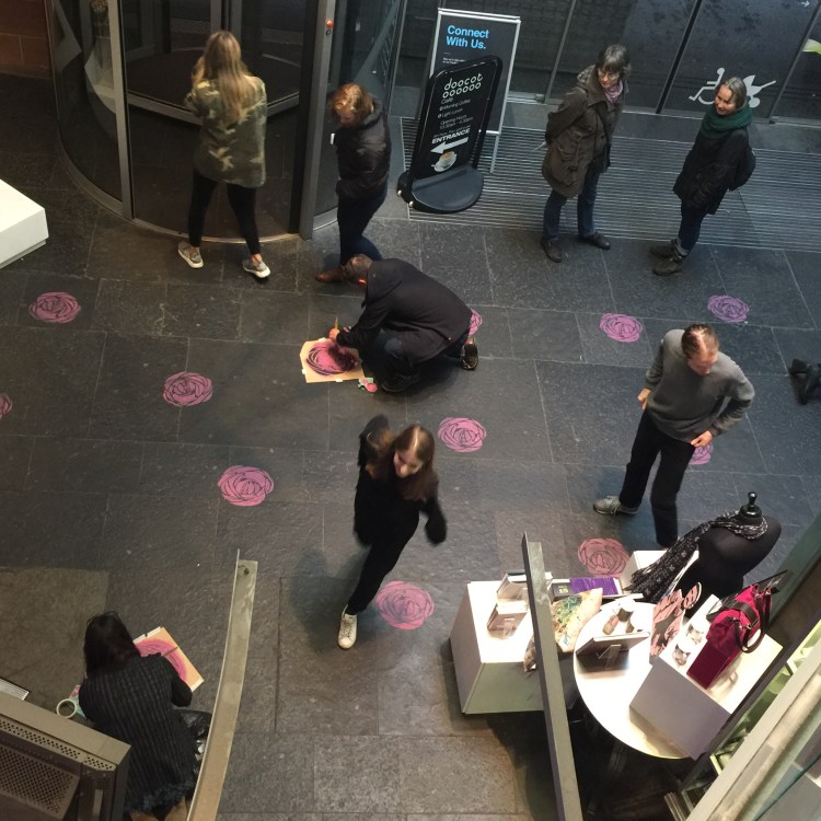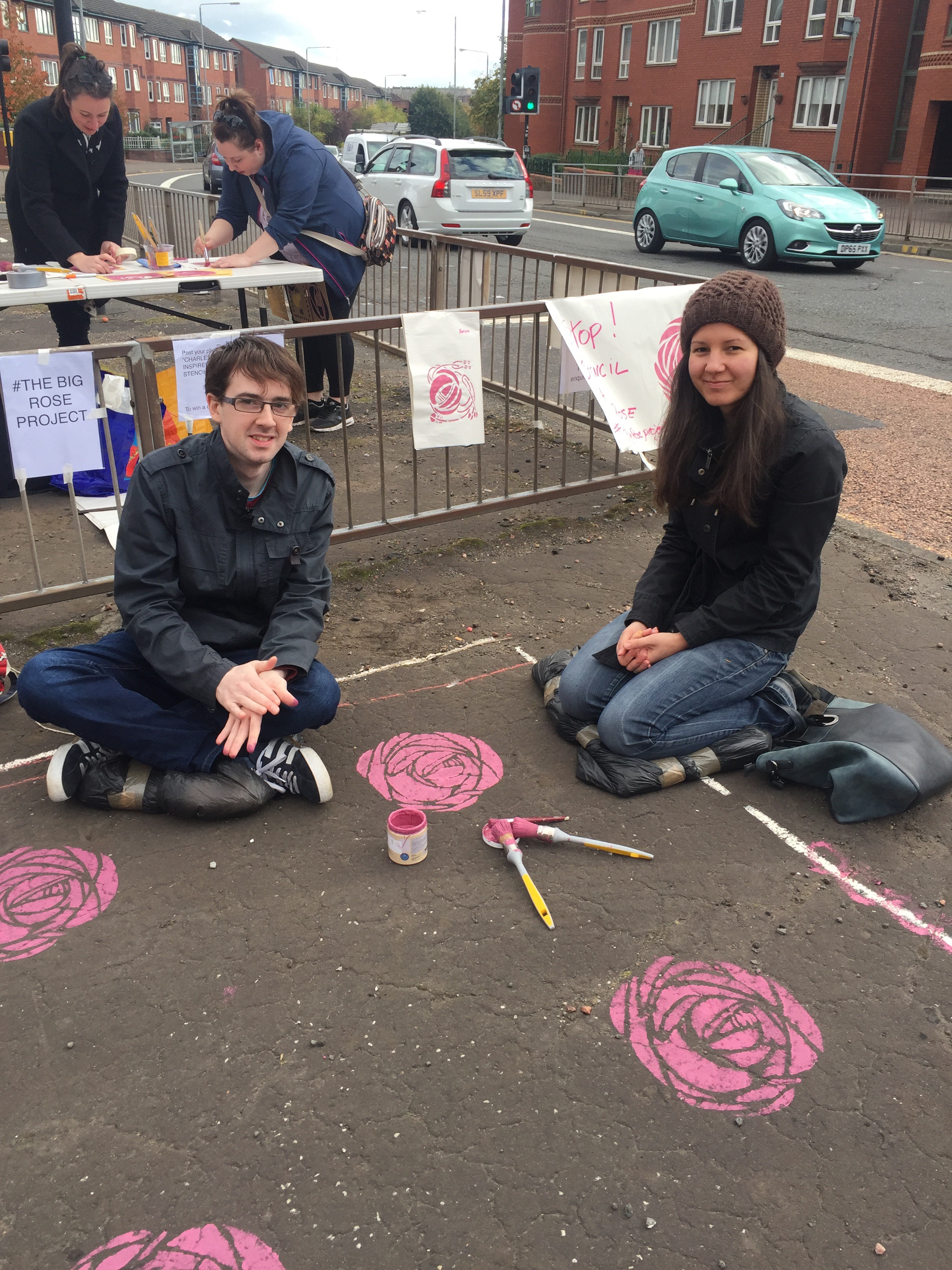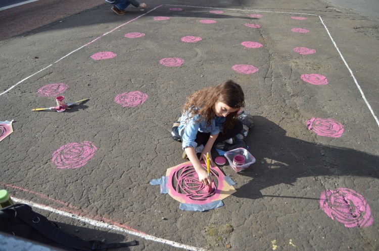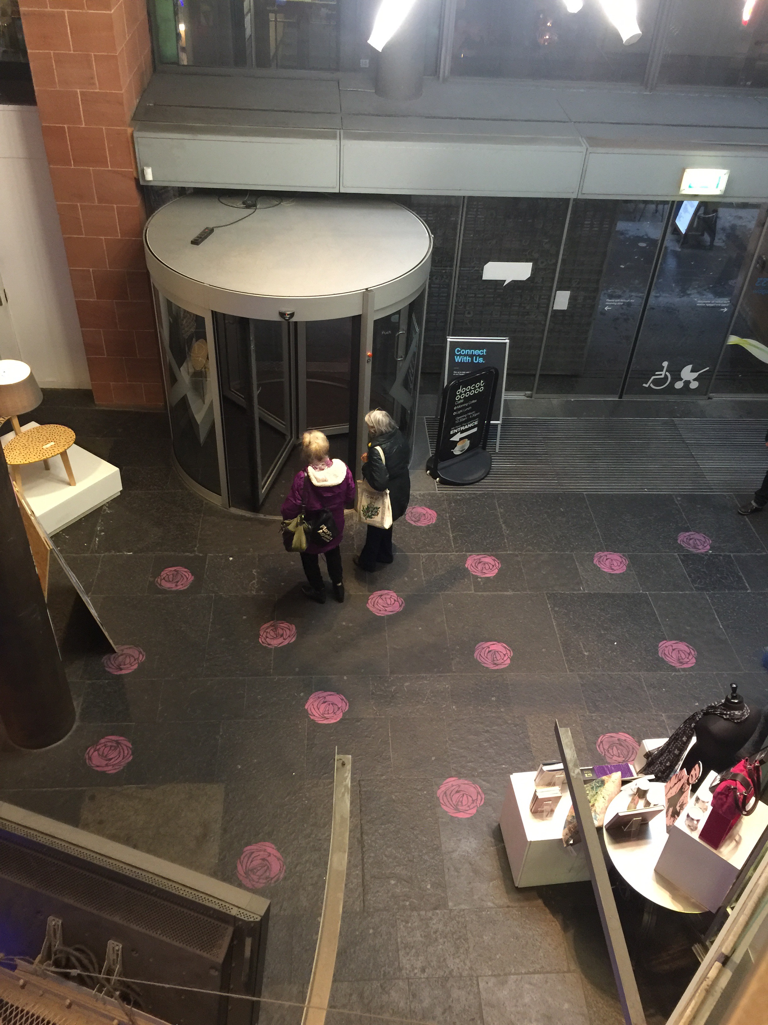 The Lighthouse welcomed #Thebigrose project for a full day demonstration on the 15th of October. Elisabeth, Sula and Lee-Anne arrived with bags full of stencils, brushes, paint pots and masking tape, a few folded sheets of newsprint for the public to practise on and great trepidation. Michael and old friend and great photographer @Ruanaich popped along a little later to say ‘Hi’ for a short while, 5 hours later he was still helping stencilling pink roses on the flagstone and taking great photos which he would later turn into a great video of #thebigrose project.