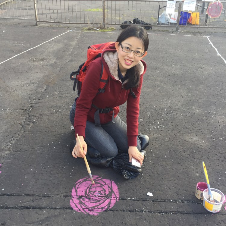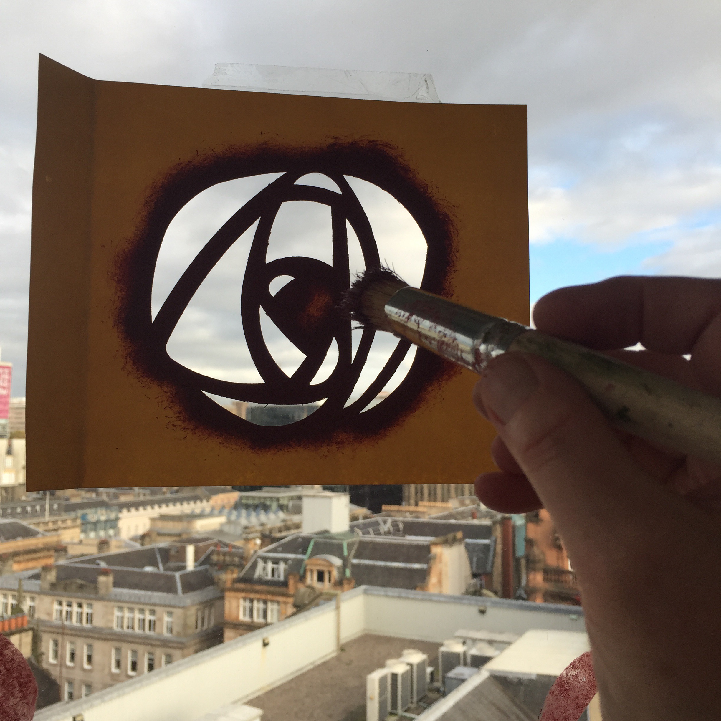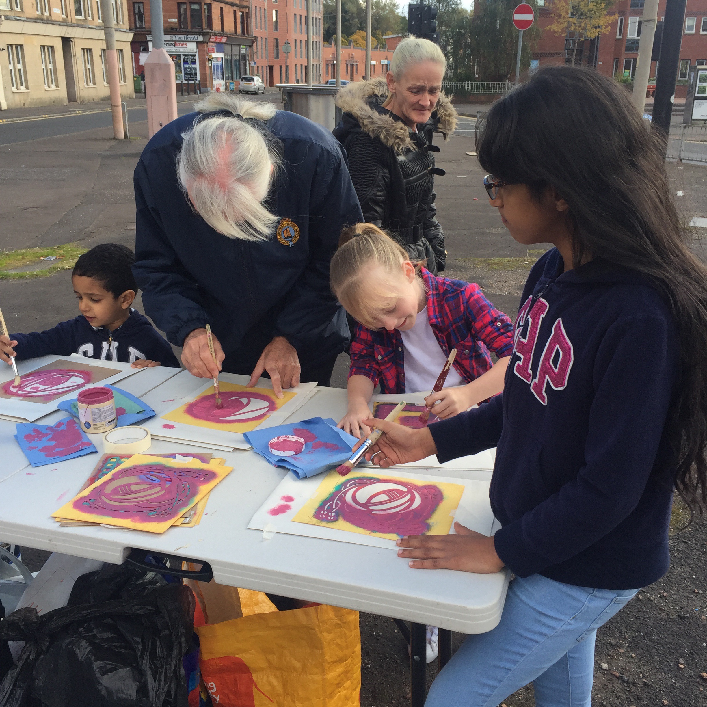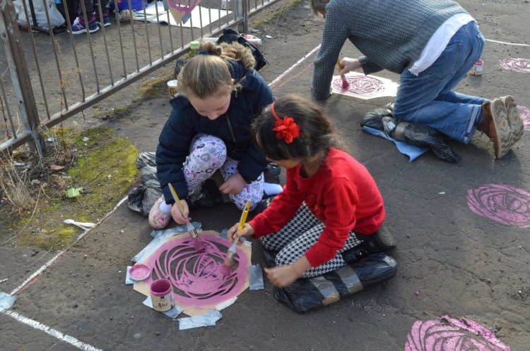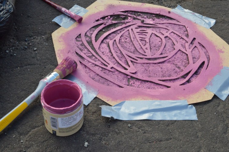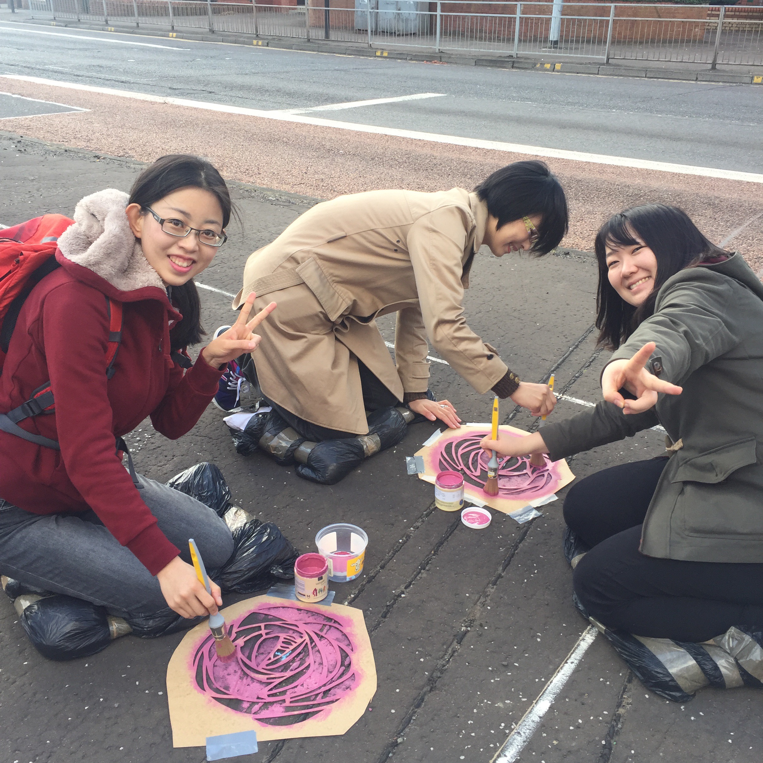 The Lighthouse welcomed #Thebigrose project for a full day demonstration on the 15th of October. Elisabeth, Sula and Lee-Anne arrived with bags full of stencils, brushes, paint pots and masking tape, a few folded sheets of newsprint for the public to practise on and great trepidation. Michael and old friend and great photographer @Ruanaich popped along a little later to say ‘Hi’ for a short while, 5 hours later he was still helping stencilling pink roses on the flagstone and taking great photos which he would later turn into a great video of #thebigrose project.