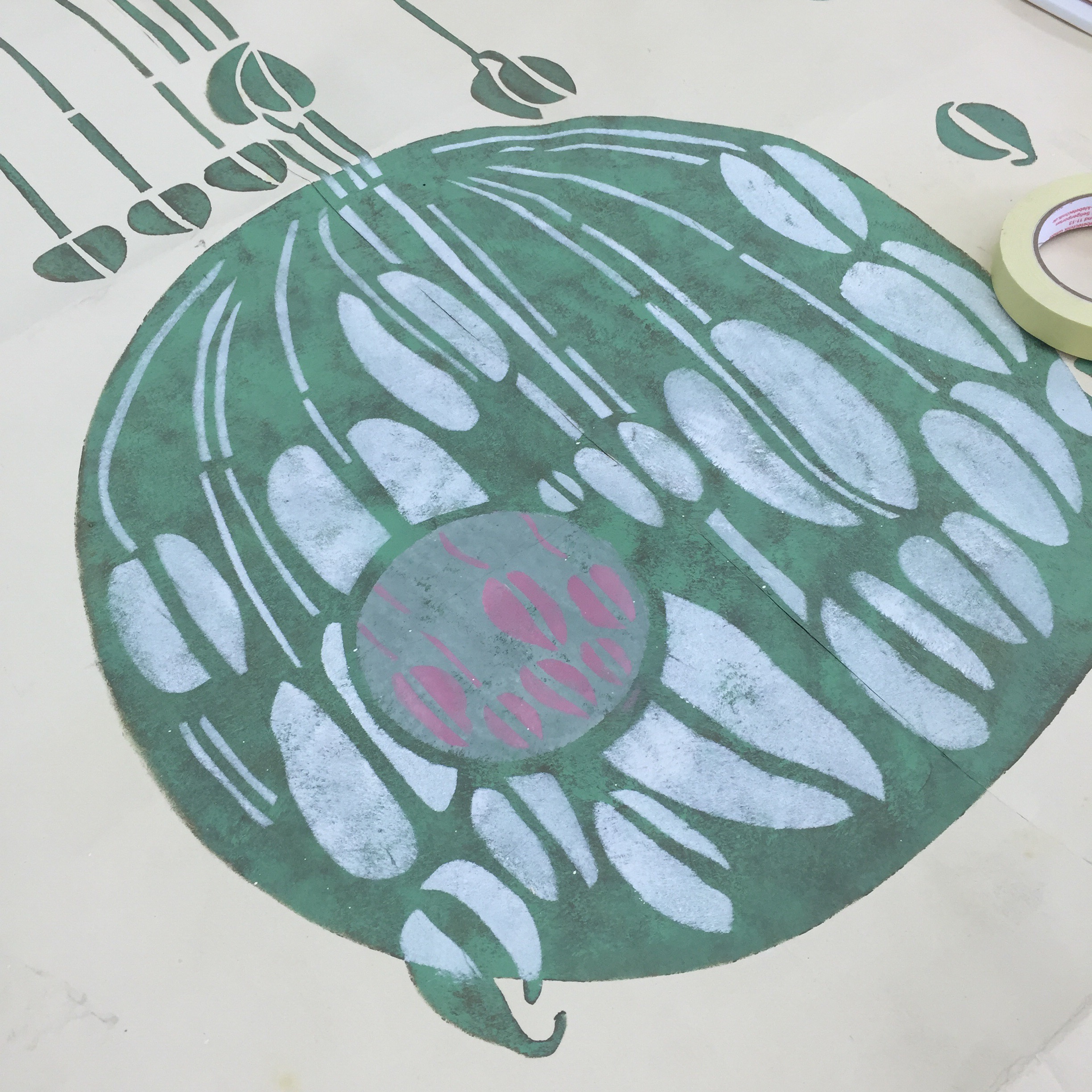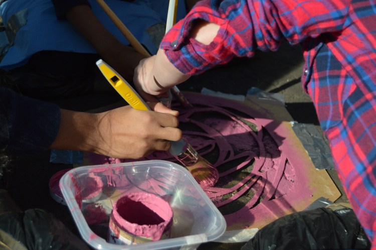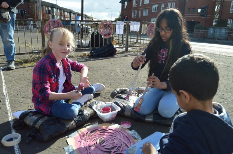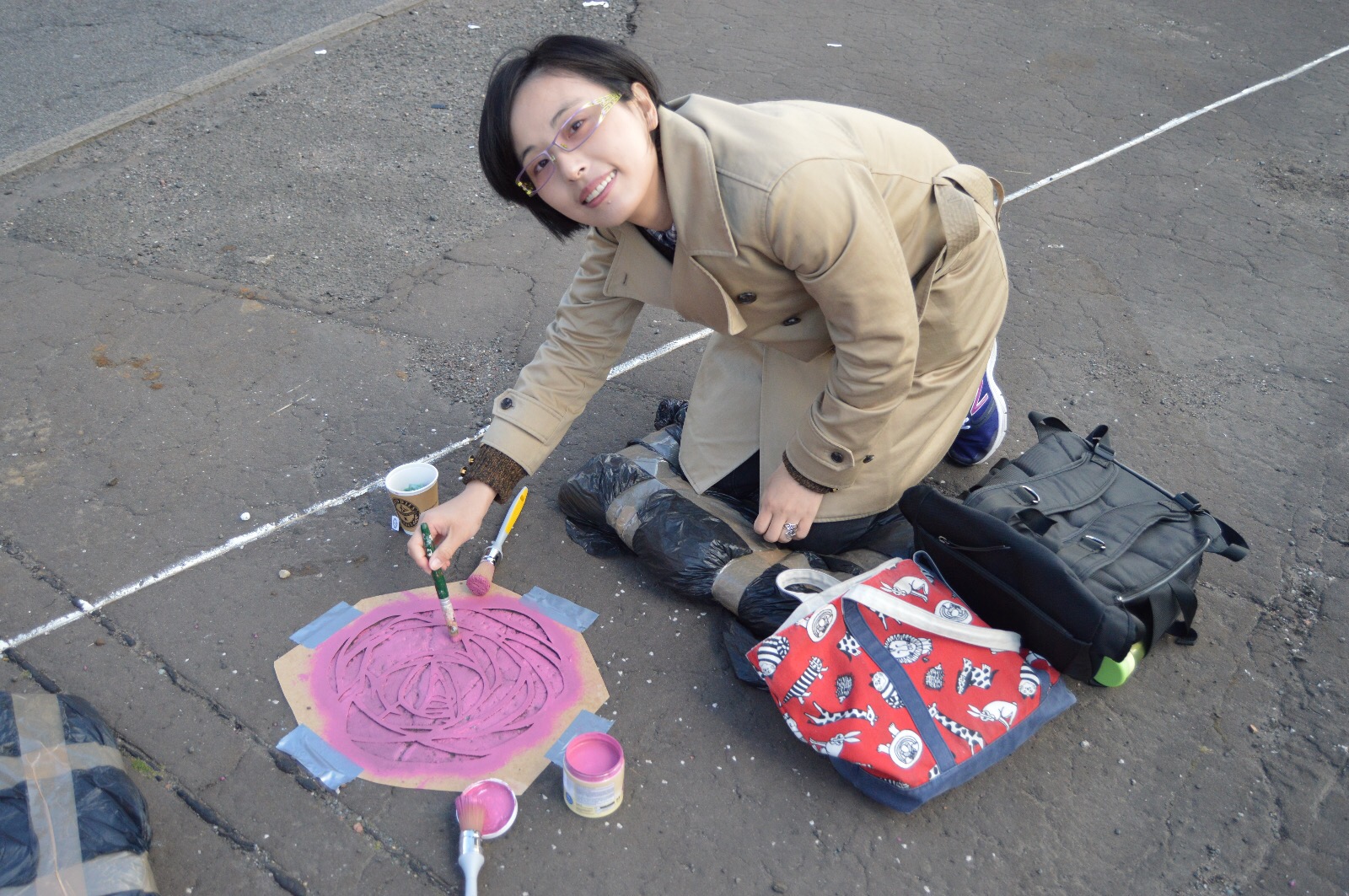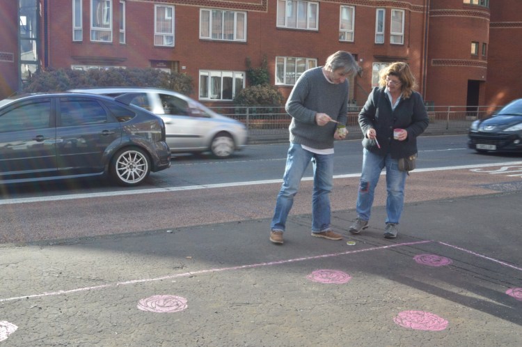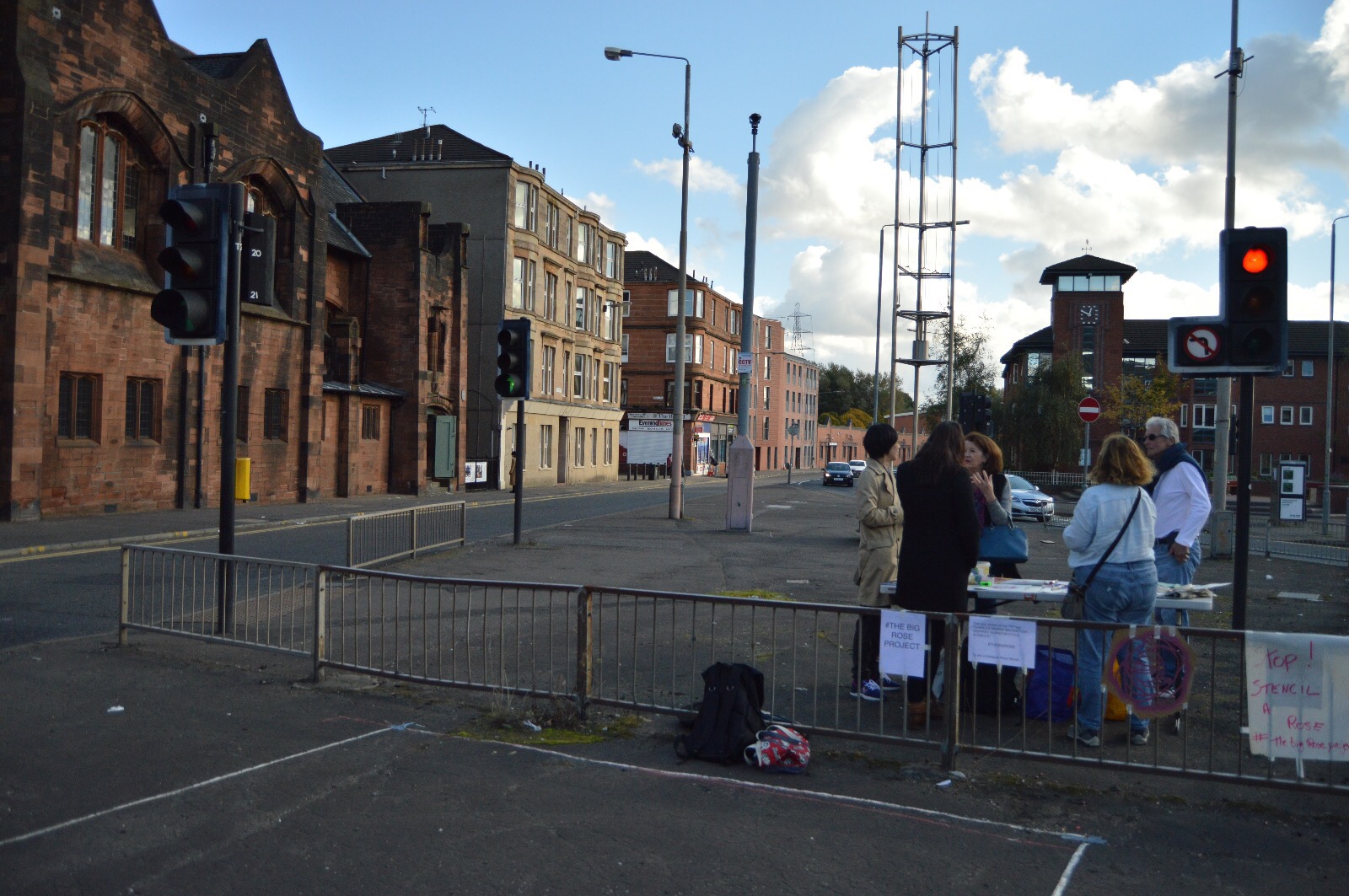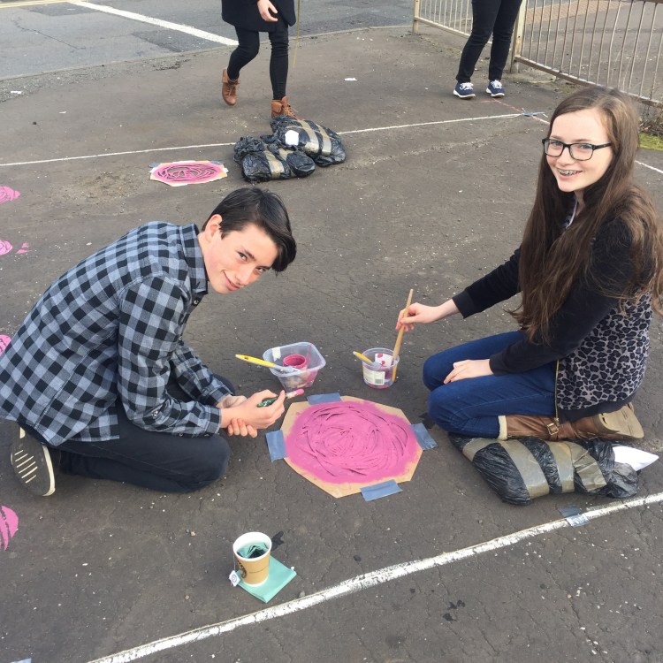 The Lighthouse welcomed #Thebigrose project for a full day demonstration on the 15th of October. Elisabeth, Sula and Lee-Anne arrived with bags full of stencils, brushes, paint pots and masking tape, a few folded sheets of newsprint for the public to practise on and great trepidation. Michael and old friend and great photographer @Ruanaich popped along a little later to say ‘Hi’ for a short while, 5 hours later he was still helping stencilling pink roses on the flagstone and taking great photos which he would later turn into a great video of #thebigrose project.