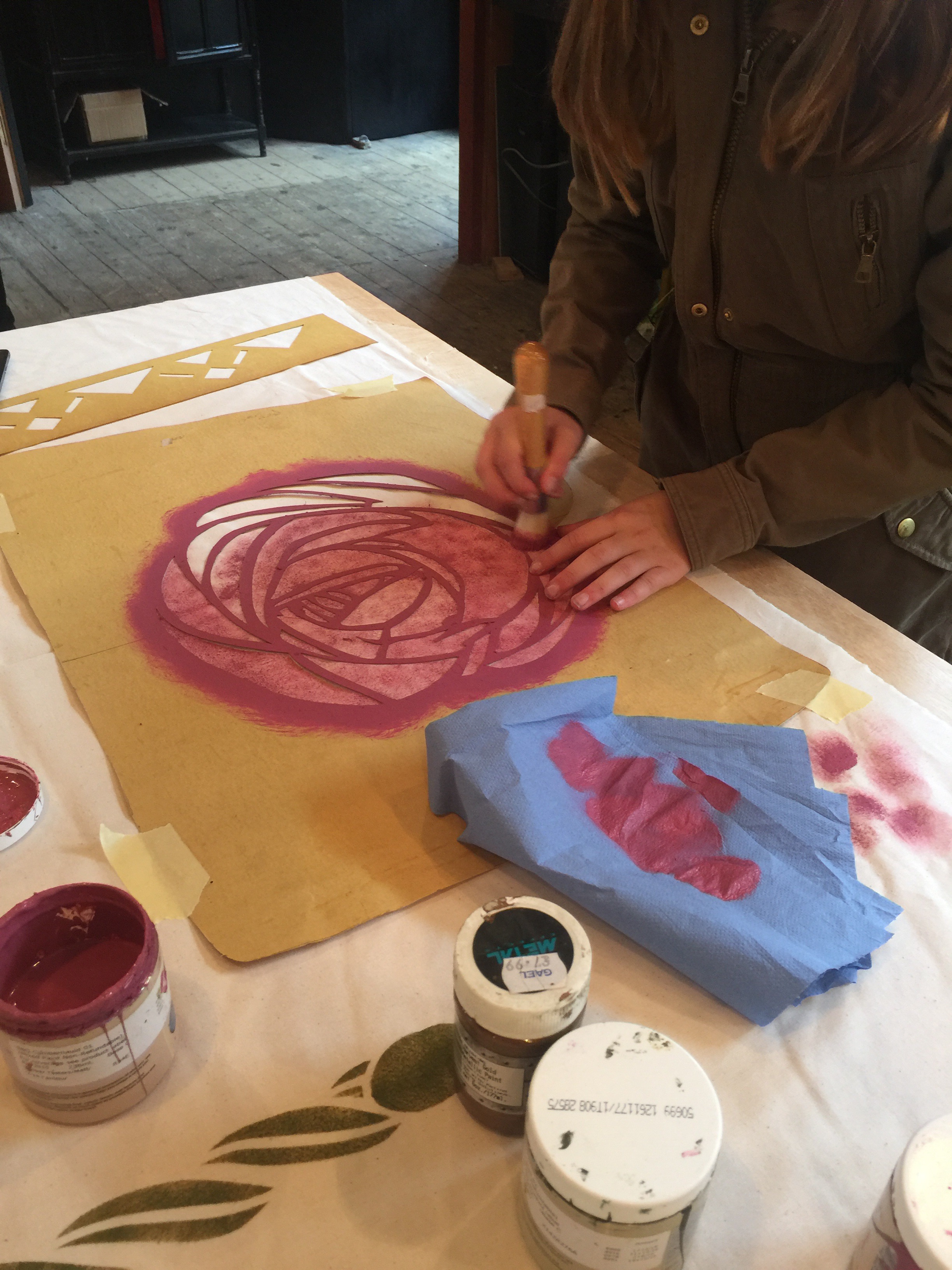 A table covered with pink pots of paint, a pile of well used stencils, roses, tulips, squares designs in the shapes Mackintosh would have approved off just by the front door at the bottom of the steps. A good number of cushions to give the public a padded experience to kneeling on the floor before stencilling a large rose, everything was planned to the last detail. In previous days we had a timid if steady number of visitors. So we were ready for much the same.