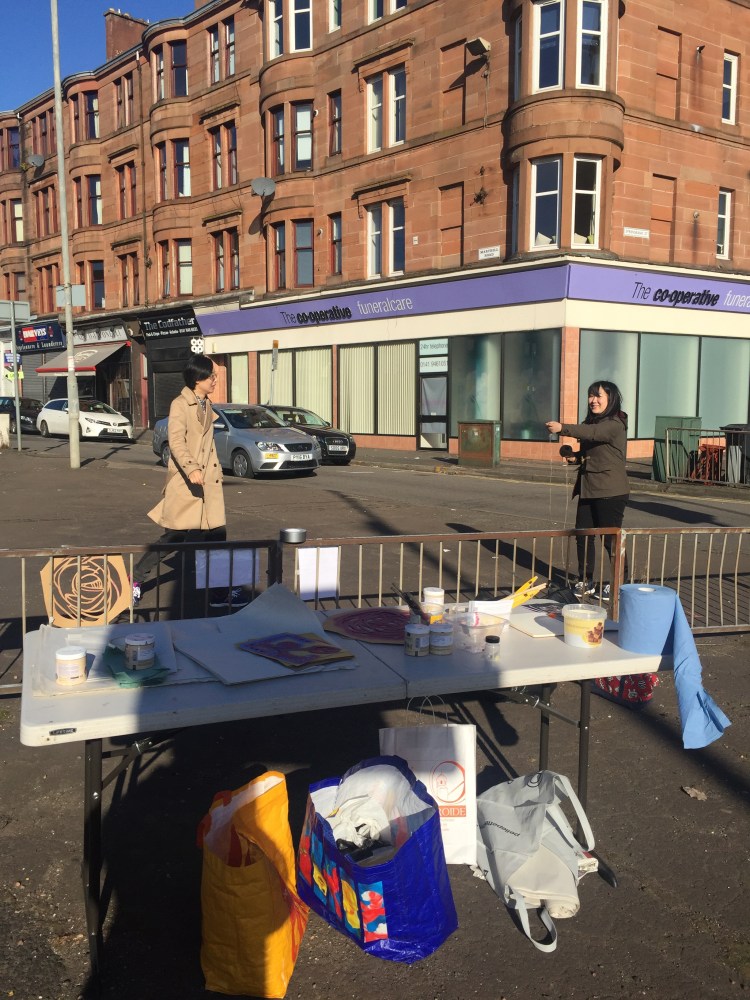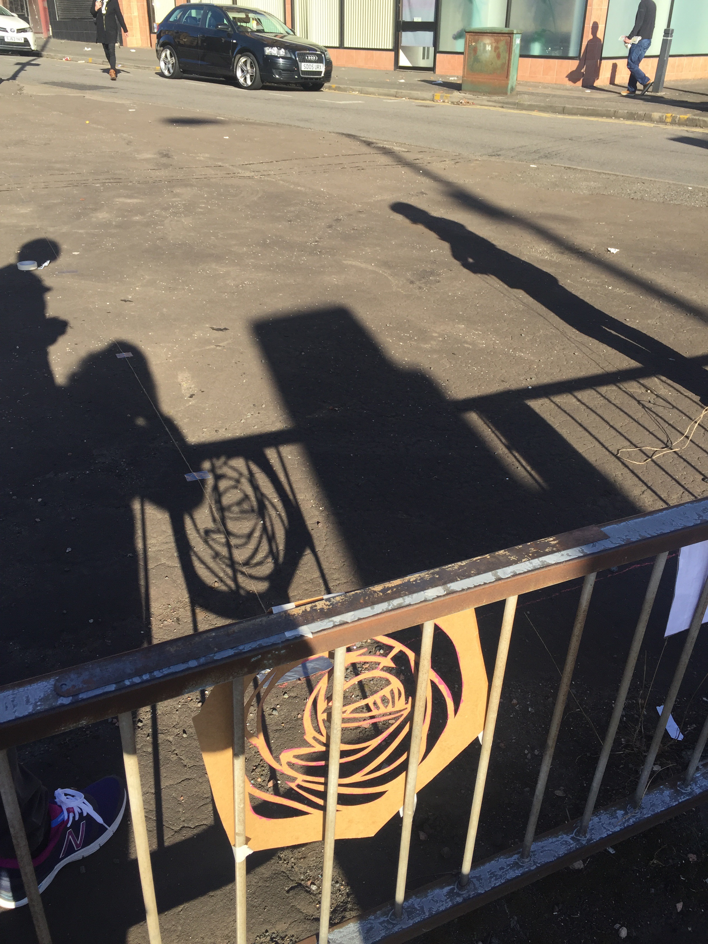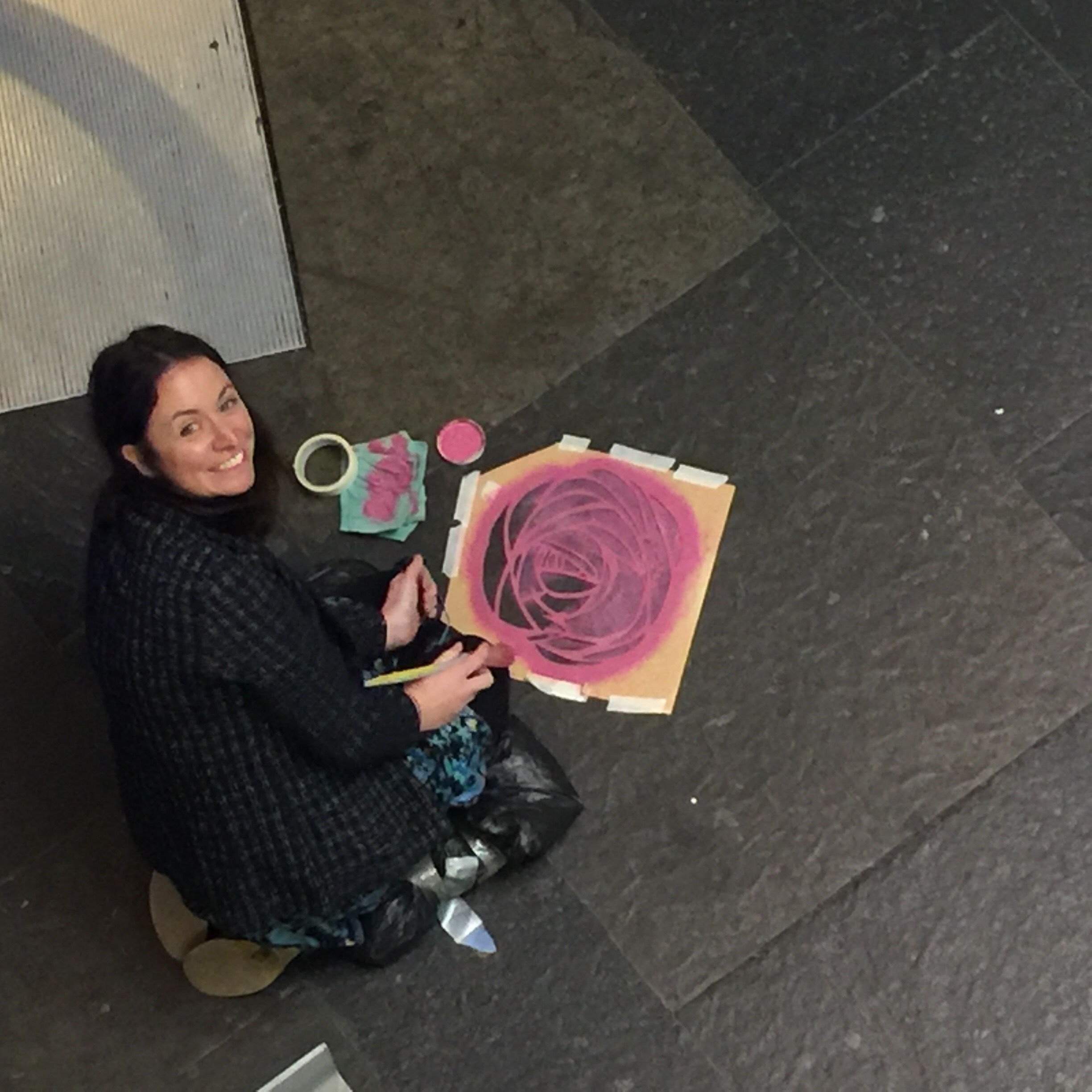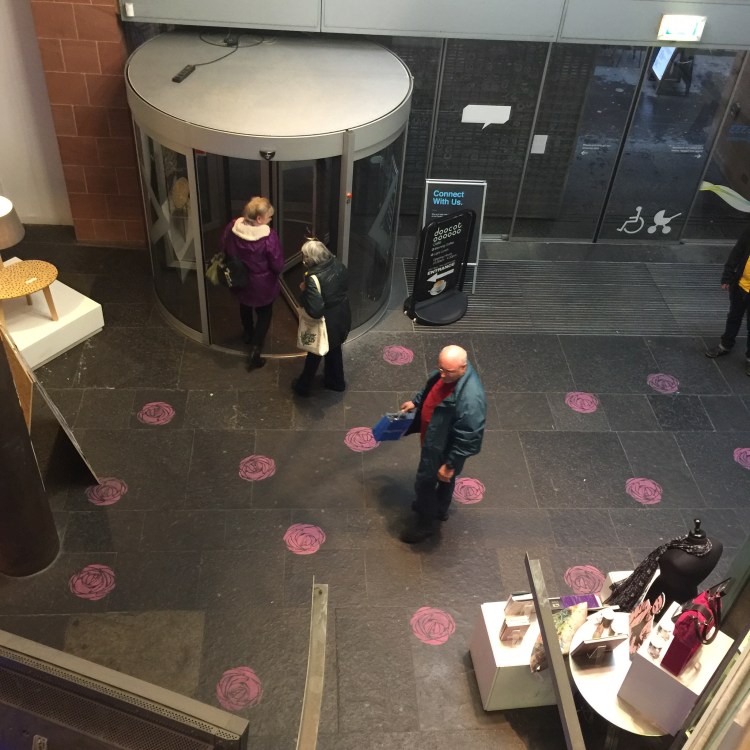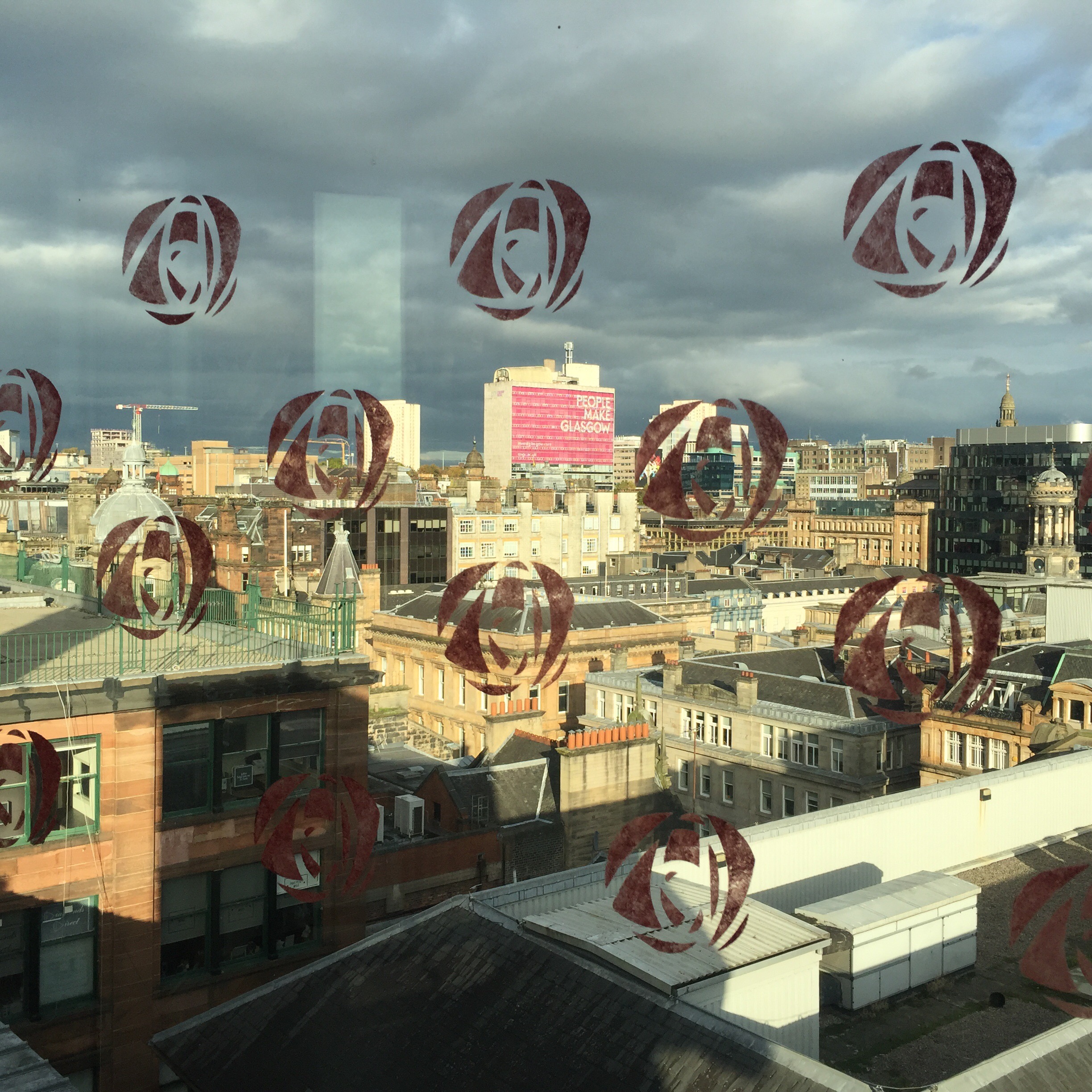 So I had grand plans when planning the events and got the exhibition team to agree to allow me to stencil outside the Mackintosh interpretation centre and on the window of the viewing gallery, pink roses on the glass looking towards “people make Glasgow” pink building but I just could not find the time… to much of a crowd waiting to take part. So I went back this week to do exactly that! it was magical … I even managed to be there at the same time as Alan the volonteer piano player from #pianocity. Alan is a beautiful piano player he dots around playing piano in the most surprising places and his repertoire is stunning. See for yourself !