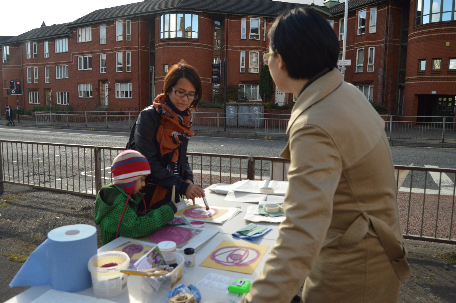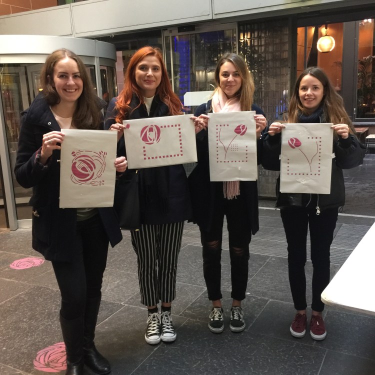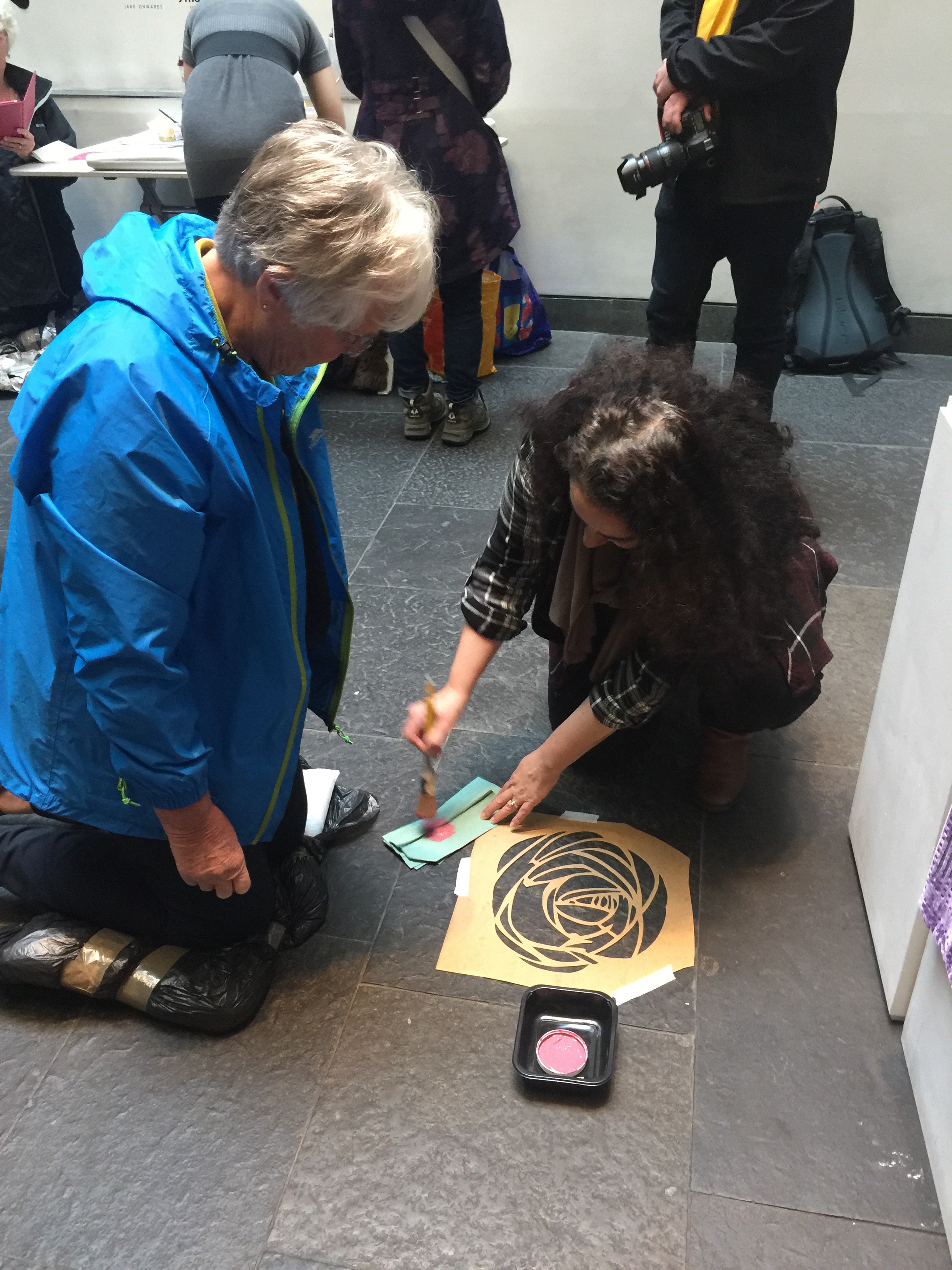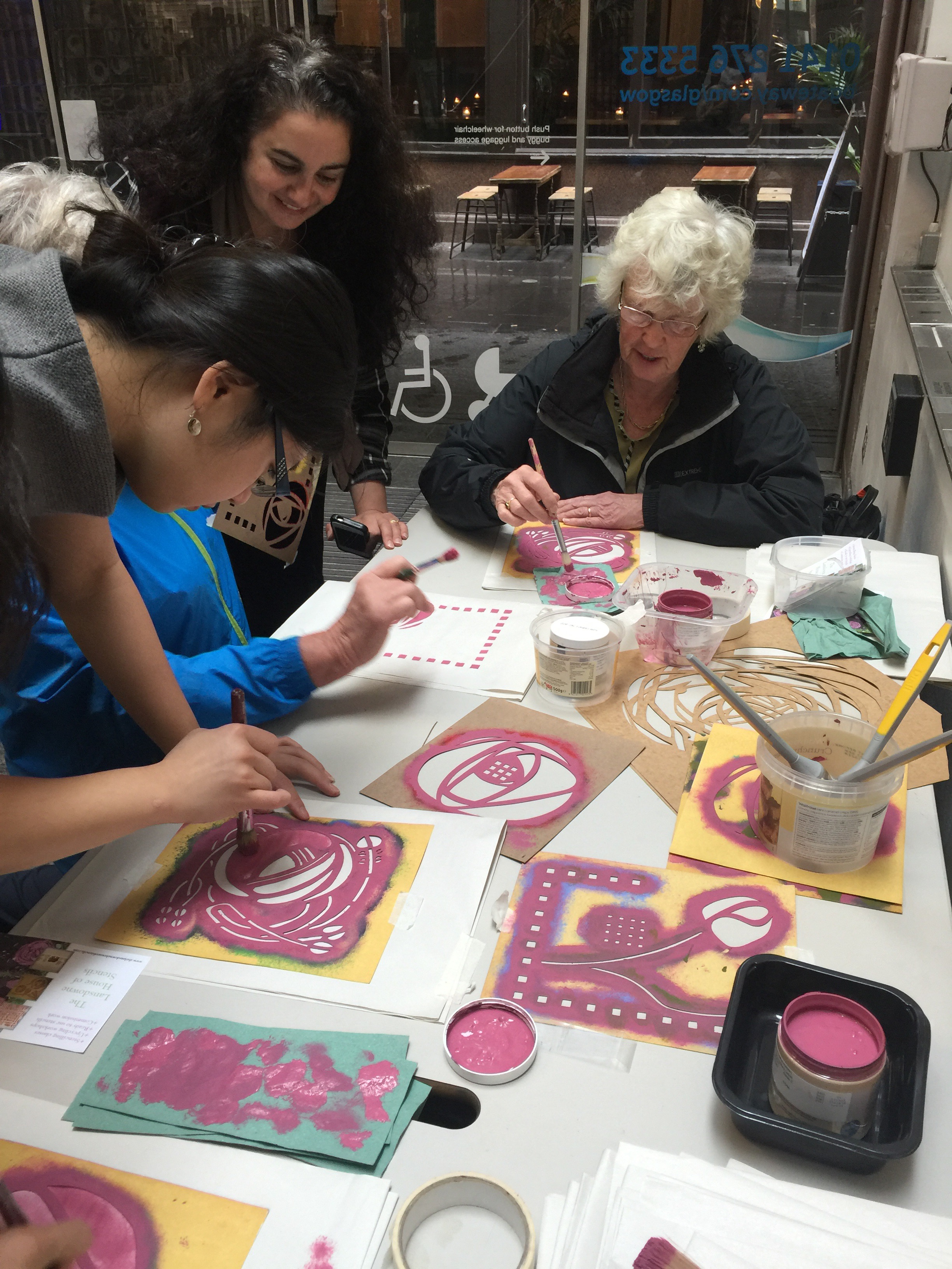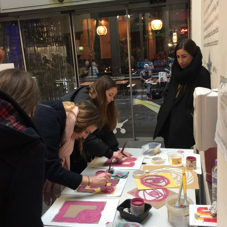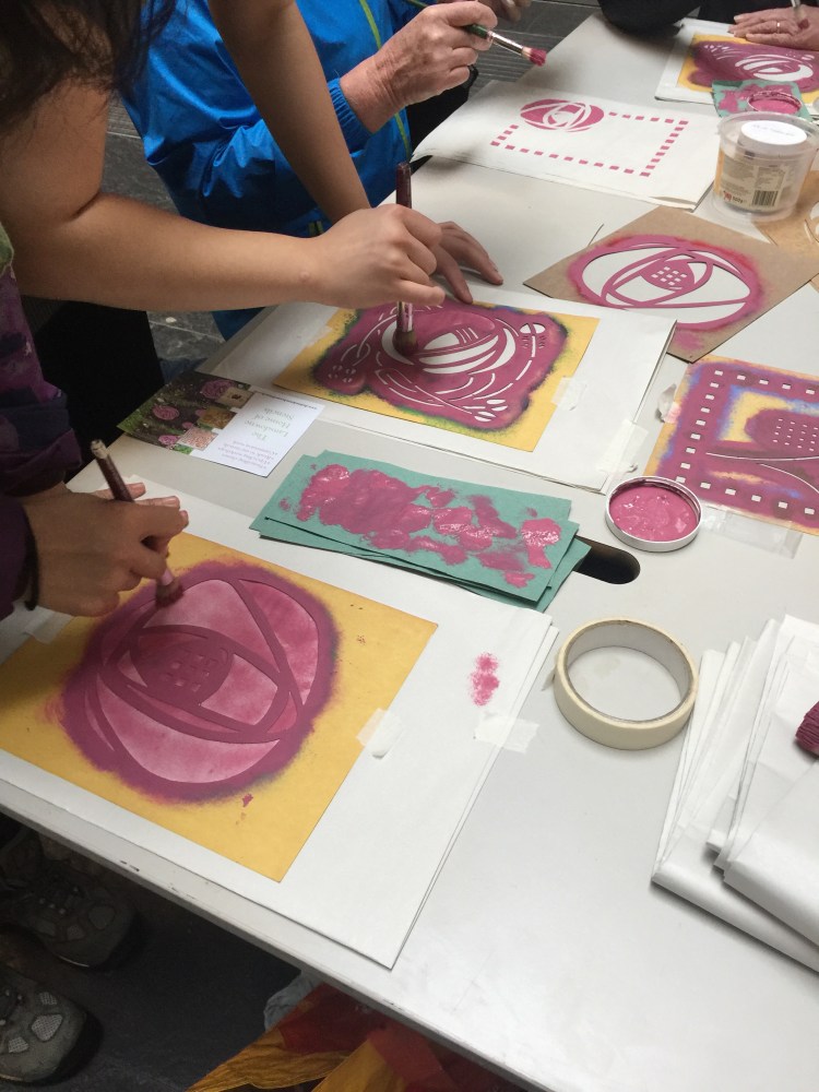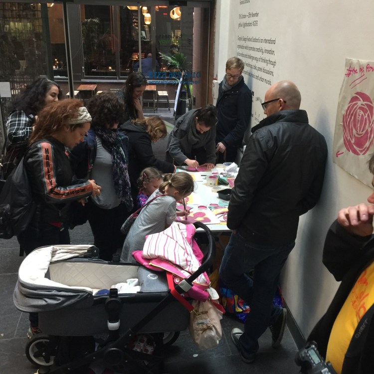 The Lighthouse took us by storm, crowds after crowds walked past us on their way in or out and immediately without having to be coaxed picked up a brush to “have a go” … young, older, man, woman, many many children, visitors to the city, students, travellers, just passers by wanted to have a try at stencilling the rose. After all this building is the design centre by excellence… we had come to the right place.