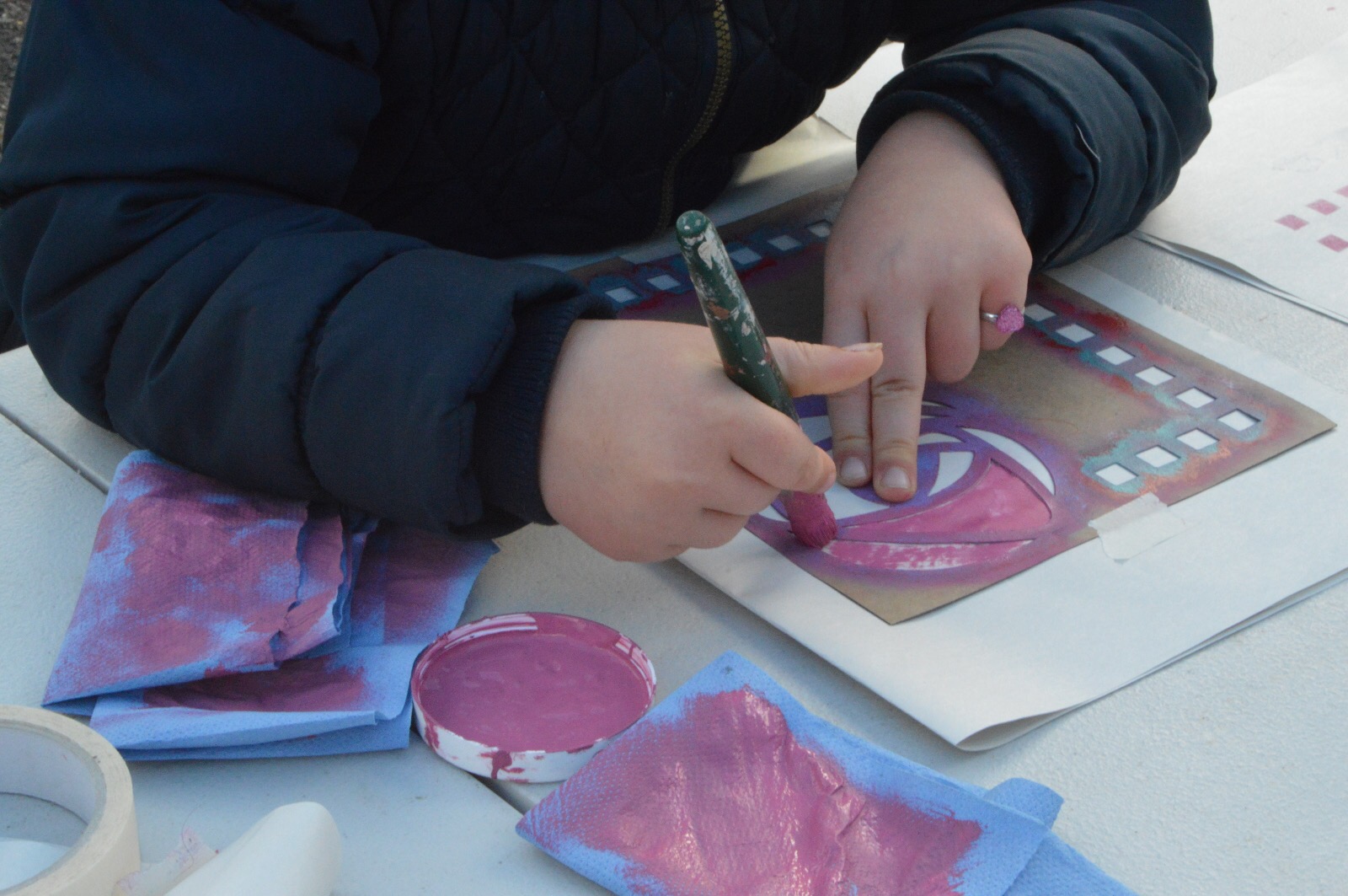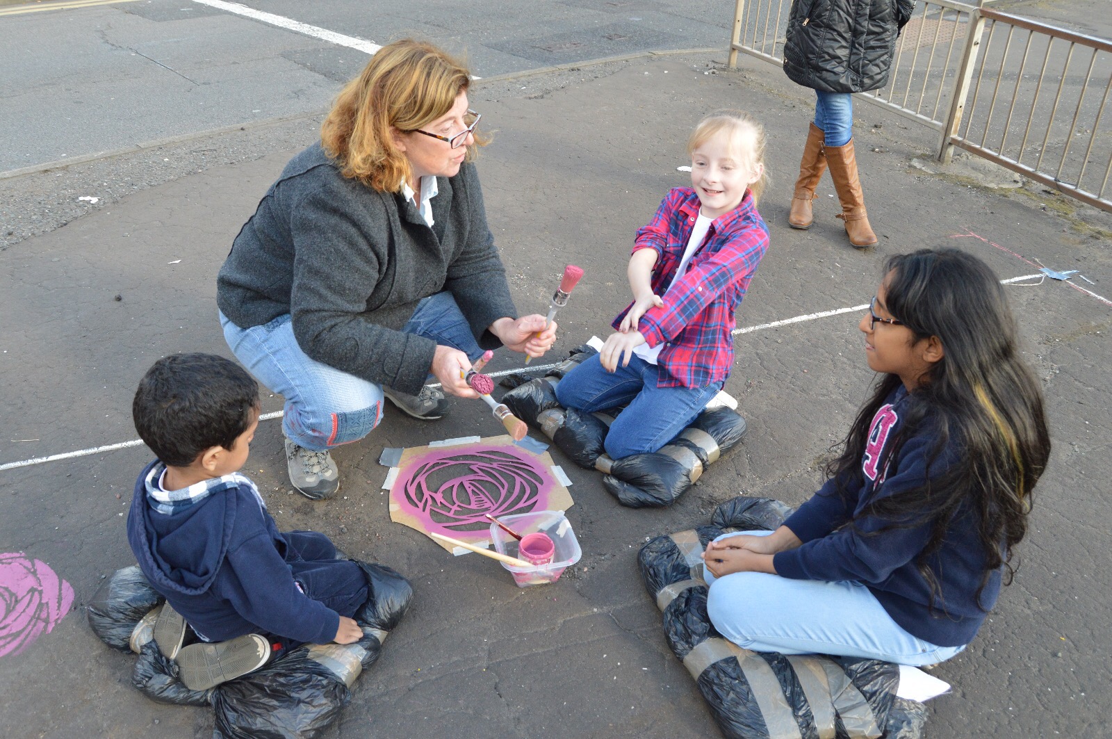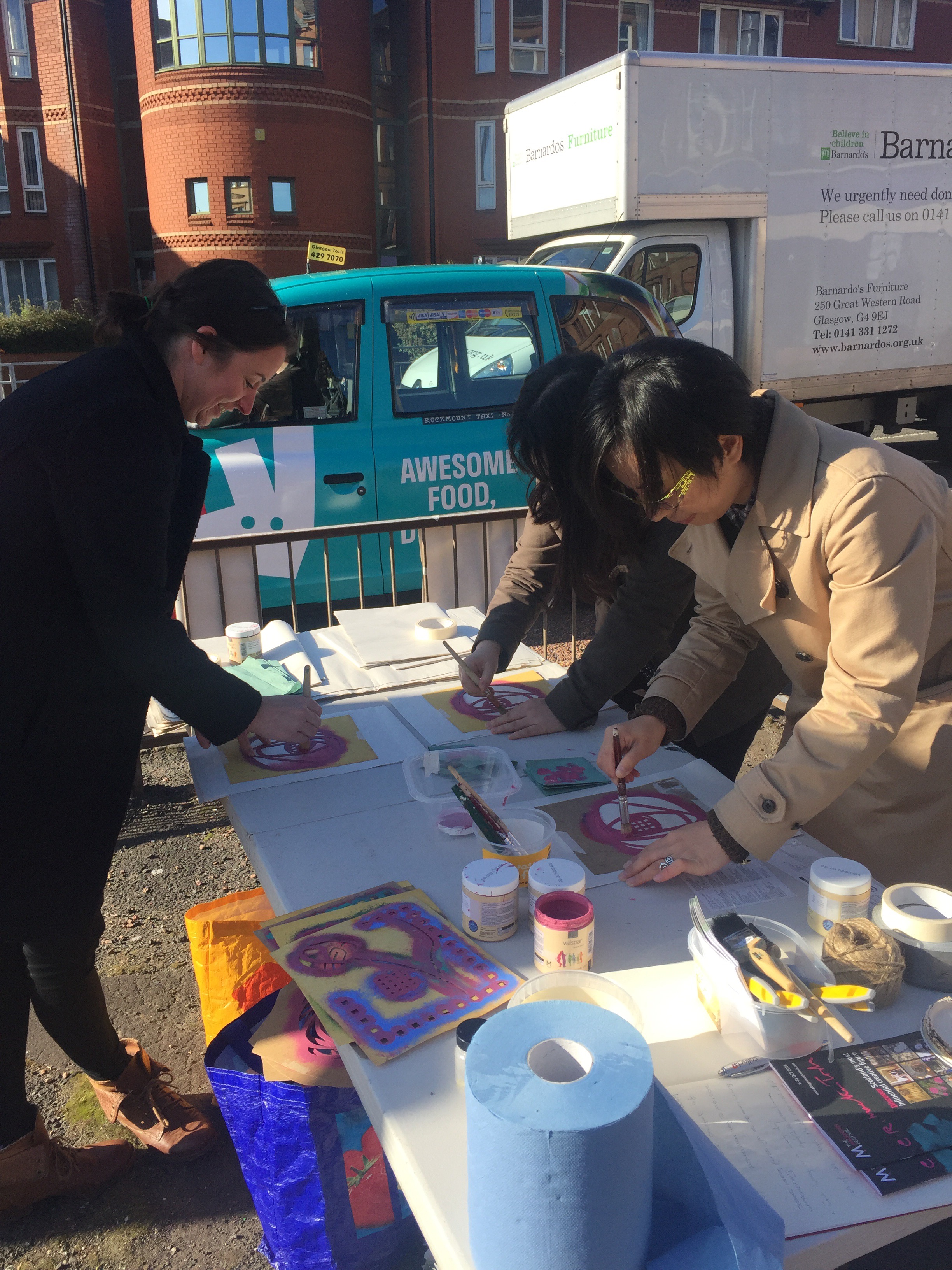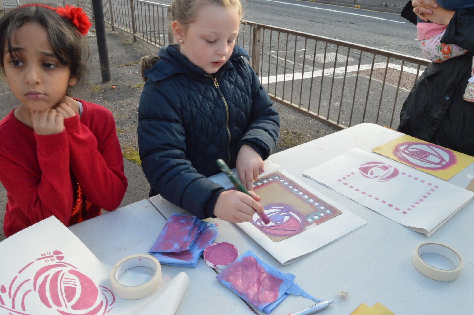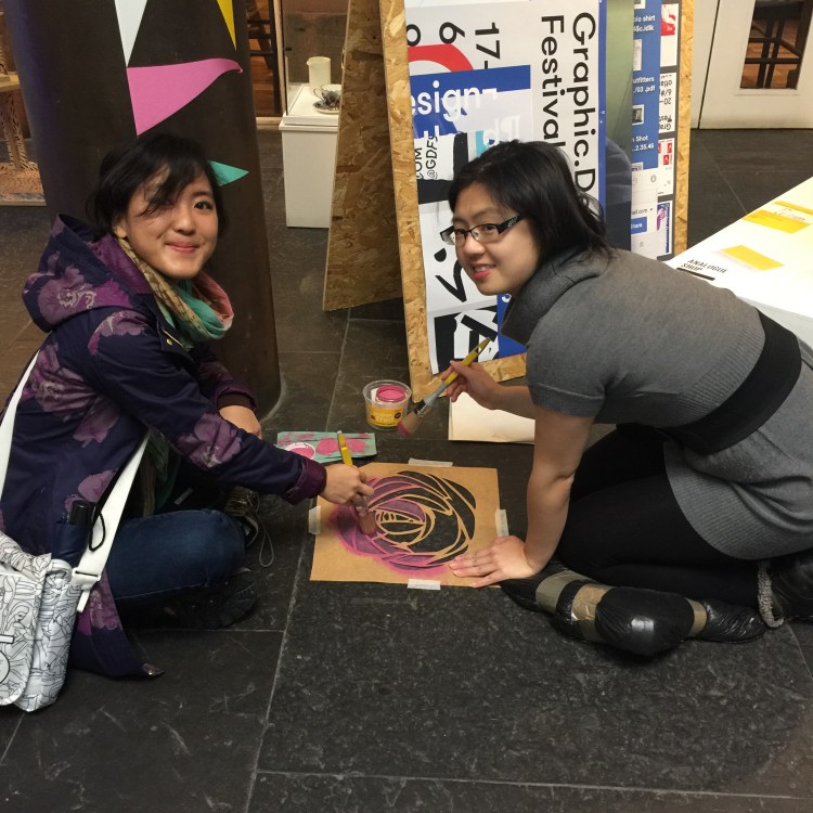 The Lighthouse took us by storm, crowds after crowds walked past us on their way in or out and immediately without having to be coaxed picked up a brush to “have a go” … young, older, man, woman, many many children, visitors to the city, students, travellers, just passers by wanted to have a try at stencilling the rose. After all this building is the design centre by excellence… we had come to the right place.