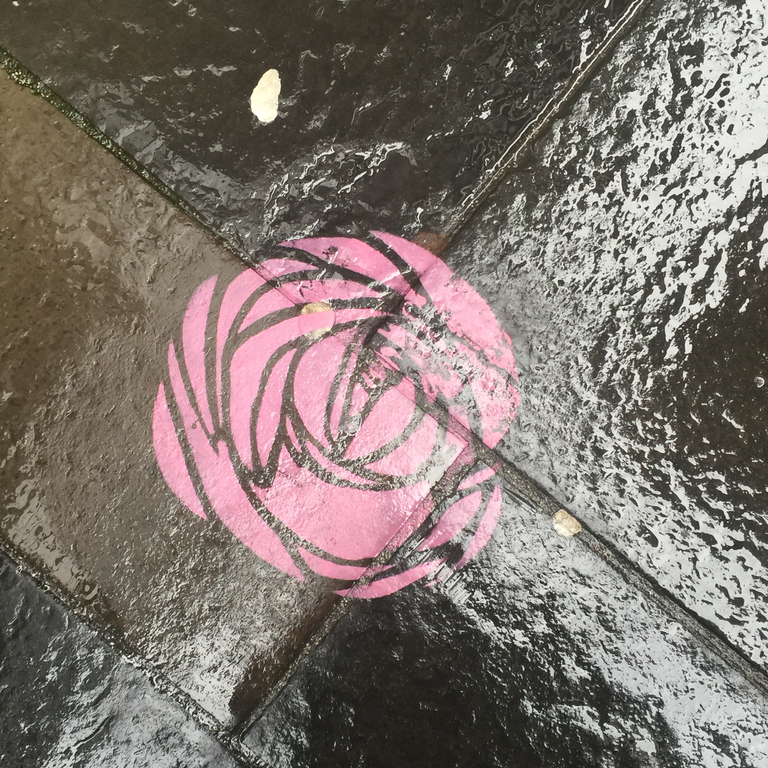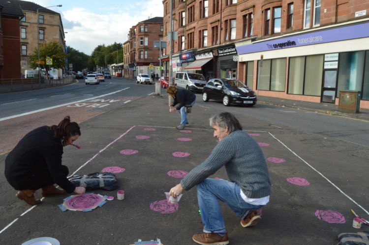 Me, my pot of paint, my knee pads and a large stencil. It was magical fun, it took me longer than I though it would. Not because i was slow at it… just simply because the passers by kept on interrupting… “are you the lady who made the carpet at The Hill House? What are you doing? Could I try? Is this not messy? Are you allowed to do this? and so on…” by the time I reached The Buchanan street the rain was teaming down and I had to stop. But looking back there was a lovely trail of pink bright roses glowing in the rain and the neon lights.